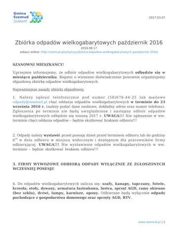 2017.03.07 Zbiórka odpadów wielkogabarytowych październik 2016 2016.08.17 zobacz online: http://szemud.pl/artykuly/zbiorka-odpadow-wielkogabarytowych-pazdziernik-2016/ SZANOWNI MIESZKAŃCY! Uprzejmie informujemy, że odbiór odpadów wielkogabarytowych odbędzie się w miesiącu październiku. Bogatsi o wiosenne doświadczenie ponownie organizujemy objazdową zbiórkę odpadów wielkogabarytowych. Najważniejsze zasady zbiórki objazdowej: 1. Należy zgłosić telefonicznie pod numer (58)676-44-25 lub mailowo [email protected] chęć oddania odpadów wielkogabarytowych w terminie do 23 września 2016 r. (należy podać dane osobowe, dokładny adres oraz numer telefonu). Zgłoszenia po terminie nie będą uwzględnione i następny odbiór odpadów wielkogabarytowych odbędzie się wiosną 2017 r. UWAGA!!! Nie zgłoszenie w ww. terminie chęci oddania odpadów – będzie skutkować brakiem odbioru!!! 2. Odpady należy wystawić przed posesję dzień przed terminem odbioru lub do godziny 6 00 w dniu odbioru w miejscu widocznym i dostępnym dla pracowników firmy odbierającej. UWAGA!!! Nie wystawienie odpadów wielkogabarytowych w ww. terminie – będzie skutkować brakiem odbioru!!! 3. FIRMY WYWOZOWE ODBIORĄ ODPADY WYŁĄCZNIE ZE ZGŁOSZONYCH WCZEŚNIEJ POSESJI! 4. Do odpadów wielkogabarytowych zalicza się: szafy, kanapy, tapczany, fotele, krzesła, stoły, dywany, armatura łazienkowa, lustra, sprzęt AGD, ramy okienne (bez szkła), drzwi, lampy, karnisze, opony. Odbierane będą wyłącznie odpady pochodzące z gospodarstwa domowego oraz sprzęty AGD, RTV. www.szemud.pl | 1 2017.03.07 Termin zbiórki objazdowej: termin miejscowość uwagi 8.X.2016r. Będargowo, Częstkowo, Donimierz, Głazica, Grabowiec, Jeleńska Huta,Przetoczyno Kamień,Kowalewo, Kieleńska Huta,Leśno, Łebno, Łebieńska Huta, Szemud, Szemudzka Huta,Zęblewo Dzień wywozu -sobota 3.X.2016r. Dobrzewino dzień odbioru odpadów zmieszanych 4.X.2016r. Bojano -rejon II dzień odbioru odpadów zmieszanych 6.X.2016r. Bojano -rejon III dzień odbioru odpadów zmieszanych 7.X.2016r. Bojano-rejon IV dzień odbioru odpadów zmieszanych 10.X.2016r. Koleczkowo-rejon V dzień odbioru odpadów zmieszanych 11.X.2016r. Koleczkowo-rejon VI dzień odbioru odpadów zmieszanych 13.X.2016r. Kielno dzień odbioru odpadów zmieszanych 14.X.2016r. Rębiska,Warzno,Karczemki dzień odbioru odpadów zmieszanych Prosimy mieszkańców Gminy Szemud o dostosowanie się do powyższych zasad. Wystawienie przez mieszkańców odpadów niezaliczanych do wielkogabarytowych będzie skutkować uprzątnięciem ww. odpadów przez właściciela nieruchomości! Wójt Gminy Szemud Ryszard Kalkowski informacja www.szemud.pl | 2