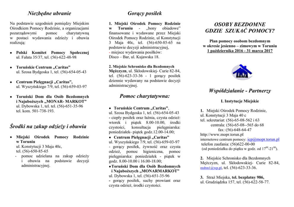 Niezbędne ubranie Gorący posiłek Na podstawie uzgodnień pomiędzy Miejskim Ośrodkiem Pomocy Rodzinie, a organizacjami pozarządowymi pomoc charytatywną w postaci wydawania odzieży i obuwia realizują: 1. Miejski Ośrodek Pomocy Rodzinie w Toruniu - „bony obiadowe” finansowane i wydawane przez Miejski Ośrodek Pomocy Rodzinie, ul Konstytucji 3 Maja 40c, tel. (56)-650-85-65 na podstawie decyzji administracyjnej, - miejsce wydawania posiłków: Disco – Bar, ul. Kujawska 18. Polski Komitet Pomocy Społecznej ul. Fałata 35/37, tel. (56)-622-48-98 Toruńskie Centrum ,,Caritas” ul. Szosa Bydgoska 1, tel. (56)-654-05-43 Centrum Pielęgnacji ,,Caritas”, ul. Wyszyńskiego 7/9, tel. (56)-659-03-97 Toruński Dom dla Osób Bezdomnych i Najuboższych „MONAR- MARKOT” ul. Dybowska 1, tel. tel. (56)-651-35-96 tel. kom. 501-738-193. Środki na zakup odzieży i obuwia Miejski Ośrodek Pomocy Rodzinie w Toruniu ul. Konstytucji 3 Maja 40c, tel. (56)-650-85-65 - pomoc udzielana na zakup odzieży i obuwia na podstawie decyzji administracyjnej. OSOBY BEZDOMNE GDZIE SZUKAĆ POMOCY? Plan pomocy osobom bezdomnym w okresie jesienno – zimowym w Toruniu 1 października 2016 - 31 marca 2017 2. Miejskie Schronisko dla Bezdomnych Mężczyzn, ul. Skłodowskiej- Curie 82-84, tel. (56)-623-33-36 - 1 gorący posiłek dziennie wydawany na podstawie decyzji administracyjnej. Współdziałanie - Partnerzy Pomoc charytatywna: I. Instytucje Miejskie Toruńskie Centrum ,,Caritas”, ul. Szosa Bydgoska 1, tel. (56)-654-05-43 - ciepły posiłek oraz łaźnia, czysta odzież: wtorek i piątek 8.00-10.00, środki czystości, konsultacja pielęgniarska: poniedziałek- piątek godz.12.00-14.00; Centrum Pielęgnacji ,,Caritas” ul. Wyszyńskiego 7/9, tel. (56)-659-03-97 - gorący posiłek, żywność oraz czysta odzież, pomoc higieniczna, pomoc pielęgniarska: poniedziałek - piątek w godz. 8.00-10.00 i 16.00-18.00; Toruński Dom dla Osób Bezdomnych i Najuboższych „MONARMARKOT” ul. Dybowska 1, tel. (56)-651-35-96 - gorący posiłek, suchy prowiant oraz czysta odzież, środki czystości. 1. Miejski Ośrodek Pomocy Rodzinie, ul. Konstytucji 3 Maja 40 c tel. sekretariat: (56)-65-08-562 i 63 centrala: (56)-65-08--565 do 68 fax: (56)-648-64-47 http://www.mopr.torun.pl internetowe centrum pomocy: [email protected] telefon zaufania: (56)622-00-00 (od poniedziałku do piątku w godz. od 1700-2100). 2. Miejskie Schronisko dla Bezdomnych Mężczyzn, ul. Skłodowskiej- Curie 82-84, [email protected], tel. (56)-623-33-36. 3. Straż Miejska, tel. bezpłatny 986, ul. Grudziądzka 157, tel. (56)-622-58-77. 4. Komenda Miejska Policji , 997, ul. Grudziądzka 17, tel. (56)-641-28-11, (56)-641-23-80. 5. Komisariat Policji – Toruń Śródmieście, ul. PCK 2 tel. (56)-641-28-11, (56)-641-23-83. 6. Komisariat Policji „Toruń Podgórz”, ul. Poznańska 129, tel. (56)-641-24-70. 7. Komisariat Policji „Toruń Rubinkowo”, ul. Dziewulskiego 1, tel. (56)-641-25-70. 8. Urząd Miasta Torunia, Wydział Zdrowia i Polityki Społecznej, ul. Fałata 39, tel.(56)-611-84-54. 9. Urząd Miasta Torunia, Wydział Ochrony Ludności, ul. Legionów 70/76, tel. (56)-611-93-00. II Organizacje pozarządowe 1. Polski Komitet Pomocy Społecznej, ul. Fałata 35/37, tel. (56)-622-48-98, [email protected] 2. Toruńskie Centrum ,,Caritas”, ul. Szosa Bydgoska 1, tel. (56)-654-05-43, [email protected] 3. Centrum Pielęgnacji ,,Caritas”, ul. Wyszyńskiego 7/9, tel. (56)-659-03-97, cpielę[email protected] 4. Toruński Dom dla Osób Bezdomnych i Najuboższych „MONAR- MARKOT” ul. Dybowska 1, tel. (56)-651-35-96 tel. kom. 501-738-193. Koordynator Schronienie 1. Miejskie Schronisko dla Bezdomnych Mężczyzn ul. Skłodowskiej - Curie 82-84 tel. (56)-623-33-36, czynne 24h Miejski Ośrodek Pomocy Rodzinie ul. Konstytucji 3 Maja 40c. Pracownik socjalny ds. bezdomności ul. Skłodowskiej- Curie 82-84, (budynek noclegowni) tel. kom. 517 – 583 – 507. [email protected] 2. Noclegownia dla bezdomnych mężczyzn ul. Skłodowskiej - Curie 82-84 przy Miejskim Schronisku dla Bezdomnych Mężczyzn w Toruniu tel. (56)-623-28-54. 3. Toruński Dom dla Osób Bezdomnych i Najuboższych „MONAR- MARKOT” ul. Dybowska 1, tel. (56)-651-35-96 tel. kom. 601-796-001 lub 501-738-193. 4. Toruńskie Centrum ,,Caritas” Noclegownia dla bezdomnych kobiet ul. Szosa Bydgoska 1, tel. (56)-654-05-43. 5. Zespół Interwencji Kryzysowej MOPR ul. Skłodowskiej- Curie 82-84 tel. (56)-477-00-92 lub (56)-477-00-91 miejsca dla bezdomnych kobiet i kobiet z dziećmi w tym miejsca dla ofiar przemocy domowej. Główny realizator - dyżur 24h Miejskie Schroniska dla Bezdomnych Mężczyzn, ul. M. Skłodowskiej – Curie 82-84, tel. (56)-623-33-36.