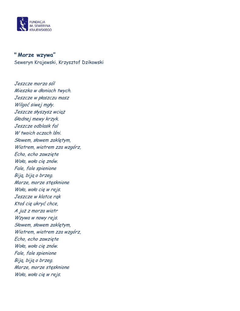 " Morze wzywa” Seweryn Krajewski, Krzysztof Dzikowski Jeszcze morza sól Mieszka w dłoniach twych. Jeszcze w płaszczu masz Wilgoć siwej mgły. Jeszcze słyszysz wciąż Głodnej mewy krzyk. Jeszcze odblask fal W twoich oczach lśni. Słowem, słowem zaklętym, Wiatrem, wiatrem zza wzgórz, Echo, echo zawzięte Woła, woła cię znów. Fale, fale spienione Biją, biją o brzeg. Morze, morze stęsknione Woła, woła cię w rejs. Jeszcze w klatce rąk Ktoś cię ukryć chce, A już z morza wiatr Wzywa w nowy rejs. Słowem, słowem zaklętym, Wiatrem, wiatrem zza wzgórz, Echo, echo zawzięte Woła, woła cię znów. Fale, fale spienione Biją, biją o brzeg. Morze, morze stęsknione Woła, woła cię w rejs.