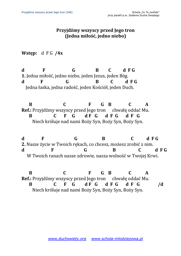 Przyjdźmy wszyscy przed Jego tron (346) Schola „In Te confido” przy parafii p.w. Zesłania Ducha Świętego Przyjdźmy wszyscy przed Jego tron (Jedna miłość, jedno niebo) Wstęp: d F G /4x d F G B C d FG 1. Jedna miłość, jedno niebo, jeden Jezus, jeden Bóg. d F G B C d FG Jedna łaska, jedna radość, jeden Kościół, jeden Duch. B C F G B C A Ref.: Przyjdźmy wszyscy przed Jego tron chwałę oddać Mu. B C F G dF G d F G d F G Niech króluje nad nami Boży Syn, Boży Syn, Boży Syn. d F G B C d FG 2. Nasze życie w Twoich rękach, co chcesz, możesz zrobić z nim. d F G B C d FG W Twoich ranach nasze zdrowie, nasza wolność w Twojej Krwi. B C F G B C A Ref.: Przyjdźmy wszyscy przed Jego tron chwałę oddać Mu. B C F G dF G d F G d F G Niech króluje nad nami Boży Syn, Boży Syn, Boży Syn. www.duchswiety.org www.schola-mlodziezowa.pl /d