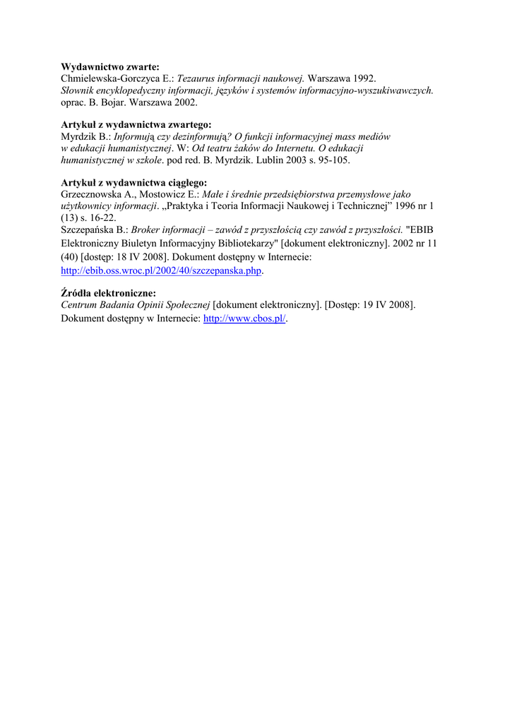 Wydawnictwo zwarte: Chmielewska-Gorczyca E.: Tezaurus informacji naukowej. Warszawa 1992. Słownik encyklopedyczny informacji, języków i systemów informacyjno-wyszukiwawczych. oprac. B. Bojar. Warszawa 2002. Artykuł z wydawnictwa zwartego: Myrdzik B.: Informują czy dezinformują? O funkcji informacyjnej mass mediów w edukacji humanistycznej. W: Od teatru żaków do Internetu. O edukacji humanistycznej w szkole. pod red. B. Myrdzik. Lublin 2003 s. 95-105. Artykuł z wydawnictwa ciągłego: Grzecznowska A., Mostowicz E.: Małe i średnie przedsiębiorstwa przemysłowe jako użytkownicy informacji. „Praktyka i Teoria Informacji Naukowej i Technicznej” 1996 nr 1 (13) s. 16-22. Szczepańska B.: Broker informacji – zawód z przyszłością czy zawód z przyszłości. "EBIB Elektroniczny Biuletyn Informacyjny Bibliotekarzy" [dokument elektroniczny]. 2002 nr 11 (40) [dostęp: 18 IV 2008]. Dokument dostępny w Internecie: http://ebib.oss.wroc.pl/2002/40/szczepanska.php. Źródła elektroniczne: Centrum Badania Opinii Społecznej [dokument elektroniczny]. [Dostęp: 19 IV 2008]. Dokument dostępny w Internecie: http://www.cbos.pl/.