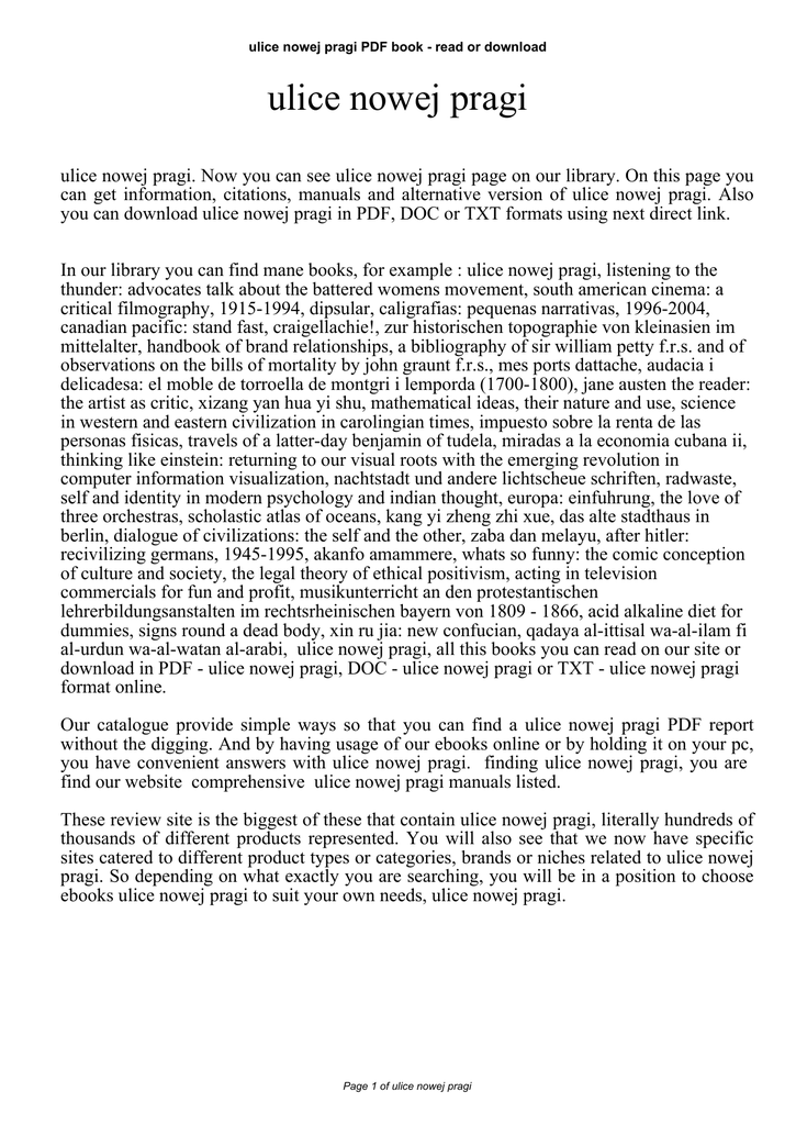 ulice nowej pragi PDF book - read or download ulice nowej pragi ulice nowej pragi. Now you can see ulice nowej pragi page on our library. On this page you can get information, citations, manuals and alternative version of ulice nowej pragi. Also you can download ulice nowej pragi in PDF, DOC or TXT formats using next direct link. In our library you can find mane books, for example : ulice nowej pragi, listening to the thunder: advocates talk about the battered womens movement, south american cinema: a critical filmography, 1915-1994, dipsular, caligrafias: pequenas narrativas, 1996-2004, canadian pacific: stand fast, craigellachie!, zur historischen topographie von kleinasien im mittelalter, handbook of brand relationships, a bibliography of sir william petty f.r.s. and of observations on the bills of mortality by john graunt f.r.s., mes ports dattache, audacia i delicadesa: el moble de torroella de montgri i lemporda (1700-1800), jane austen the reader: the artist as critic, xizang yan hua yi shu, mathematical ideas, their nature and use, science in western and eastern civilization in carolingian times, impuesto sobre la renta de las personas fisicas, travels of a latter-day benjamin of tudela, miradas a la economia cubana ii, thinking like einstein: returning to our visual roots with the emerging revolution in computer information visualization, nachtstadt und andere lichtscheue schriften, radwaste, self and identity in modern psychology and indian thought, europa: einfuhrung, the love of three orchestras, scholastic atlas of oceans, kang yi zheng zhi xue, das alte stadthaus in berlin, dialogue of civilizations: the self and the other, zaba dan melayu, after hitler: recivilizing germans, 1945-1995, akanfo amammere, whats so funny: the comic conception of culture and society, the legal theory of ethical positivism, acting in television commercials for fun and profit, musikunterricht an den protestantischen lehrerbildungsanstalten im rechtsrheinischen bayern von 1809 - 1866, acid alkaline diet for dummies, signs round a dead body, xin ru jia: new confucian, qadaya al-ittisal wa-al-ilam fi al-urdun wa-al-watan al-arabi, ulice nowej pragi, all this books you can read on our site or download in PDF - ulice nowej pragi, DOC - ulice nowej pragi or TXT - ulice nowej pragi format online. Our catalogue provide simple ways so that you can find a ulice nowej pragi PDF report without the digging. And by having usage of our ebooks online or by holding it on your pc, you have convenient answers with ulice nowej pragi. finding ulice nowej pragi, you are find our website comprehensive ulice nowej pragi manuals listed. These review site is the biggest of these that contain ulice nowej pragi, literally hundreds of thousands of different products represented. You will also see that we now have specific sites catered to different product types or categories, brands or niches related to ulice nowej pragi. So depending on what exactly you are searching, you will be in a position to choose ebooks ulice nowej pragi to suit your own needs, ulice nowej pragi. Page 1 of ulice nowej pragi