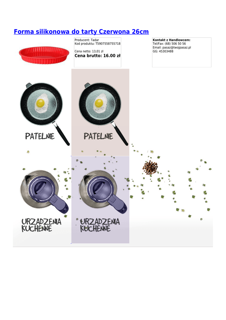 Forma silikonowa do tarty Czerwona 26cm Producent: Tadar Kod produktu: T5907558755718 Cena netto: 13,01 zł Cena brutto: 16.00 zł Kontakt z Handlowcem: Tel/Fax: (68) 506 50 56 Email: [email protected] GG: 45303488 Forma silikonowa do tarty czerwona - Tadar Kod produktu: T5907558755718 Forma silikonowa do tarty czerwona Praktyczna i funkcjonalna, okrągła forma silikonowa do pieczenia. Produkt wykonany z wysokiej jakości silikonu. Dzięki właściwościom silikonu ciasto delikatnie odchodzi od formy, nie przywierając do niej. Forma idealnie sprawdzi się przy pieczeniu tart z owocami lub innych deserów. Zalety: -odporność na niskie i wysokie temperatury -silikon nie pochłania zapachów -niezwykle lekka -łatwa w utrzymaniu czystości - można czyścić w zmywarce -elastyczna -łatwość przechowywania Informacje dodatkowe: -średnica: 26 cm / wysokość: 3 cm -Forma do tarty okrągła wykonana z silikonu -Kolor: czerwony -Max. temp. pieczenia 250°C Użytkowanie: -piekarnik -lodówka -kontakt z żywnością Kod produktu:T5907558755718 ID produktu:155940 Granos Group sp. z o.o. ul. Sulechowska 4a budynek 45 65-001 Zielona Góra