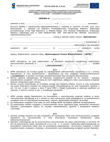 INVICOM SP. Z O.O. Projekt współfinansowany ze środków Europejskiego Funduszu Rozwoju Regionalnego w ramach Programu Operacyjnego Innowacyjna Gospodarka „Dotacje na Innowacje” „Inwestujemy w Waszą przyszłość” UMOWA nr …........................... zawarta w dniu …......................................... r. w ………………………………………………… pomiędzy: Invicom Spółka z ograniczoną odpowiedzialnością z siedzibą w Ustroniu 43-450, przy ulicy Partyzantów 1, wpisana do Rejestru Przedsiębiorców Krajowego Rejestru Sądowego prowadzonego przez Sąd Rejonowy w Bielsku-Białej, VIII Wydział Gospodarczy Krajowego Rejestru Sądowego pod nr KRS 0000347399, NIP: 548-260-87-99, REGON: 241476121, reprezentowaną przez: ............................................................... zwaną w dalszej części umowy „Operatorem”, a …............................................................................................................, zamieszkały w …..........................................................................................., legitymujący się dowodem osobistym serii ….......................... nr …..........................., wydanym przez …..............................................................................................., PESEL: ….................... będący Właścicielem, zwanym dalej „Wykonującym Prawa Właścicielskie” („WPW”) § 1. WPW oświadcza, że jest właścicielem na zasadach wspólnoty majątkowej małżeńskiej nieruchomości położonej w ………………………………………………………………………………………….. - działka nr …............................................. („nieruchomość”). §2 1. WPW oświadcza, że wyraża zgodę na udostępnienie nieruchomości określonej w § 1 umowy Operatorowi w celu posadowienia i eksploatacji na niej urządzeń telekomunikacyjnych („urządzenia”) w postaci rurociągu światłowodowego oraz przyłącza abonenckiego. 2. Strony zgodnie oświadczają, że dokonały wzajemnych ustaleń co do miejsca i sposobu posadowienia urządzeń i nie wnoszą do nich zastrzeżeń. Załączony szkic usytuowania urządzeń stanowi integralną część umowy. 3. Strony umowy stwierdzają, że niniejsza umowa jest zawarta między innymi w celu wykazania się przez Operatora prawem do dysponowania nieruchomością na cele budowlane zgodnie z art. 32 ust. 4 pkt 2 ustawy z dnia 7 lipca 1994 r. Prawo budowlane w zakresie zgodnym ze szkicem, o którym mowa w ust. 2 niniejszego paragrafu. §3 1. WPW wyraża zgodę Operatorowi na korzystanie z nieruchomości poprzez wejście w teren nieruchomości określonej w § 1 umowy w celu wykonania robót polegających na posadowieniu urządzeń oraz ich późniejszej konserwacji, napraw, eksploatacji bieżącej i przyszłej. 2. Za ulokowanie urządzeń oraz stały do nich dostęp WPW nie będzie pobierał wynagrodzenia. 3. Za ewentualne szkody związane z wykonywaniem przez Operatora jego uprawnień umownych Operator zobowiązany będzie do wypłaty odszkodowania zgodnie z przepisami Kodeksu cywilnego. §4 1. Umowa zostaje zawarta na czas niezbędny do wykonania robót oraz funkcjonowania urządzeń Operatora na nieruchomości w celu stworzenia możliwości świadczenia usług telekomunikacyjnych. 2. Operator zobowiązuje się do przywrócenia nieruchomości do stanu pierwotnego w terminie 30 dni od zakończenia robót, określonych w § 2 ust. 1 i 2 umowy. Całkowitą odpowiedzialność za prawidłowe wykonanie robót oraz za prawidłową eksploatację i utrzymanie urządzeń, a także wszelkie koszty związane z budową i utrzymaniem oraz eksploatacją urządzeń ponosi Operator. 1/2 INVICOM SP. Z O.O. Projekt współfinansowany ze środków Europejskiego Funduszu Rozwoju Regionalnego w ramach Programu Operacyjnego Innowacyjna Gospodarka „Dotacje na Innowacje” „Inwestujemy w Waszą przyszłość” 3. Przed wejściem na teren nieruchomości w celu wykonania przedmiotu niniejszej umowy Operator jest zobowiązany powiadomić WPW z co najmniej trzydniowym wyprzedzeniem. 4. Wszystkie urządzenia, zamontowane przez Operatora są połączone z nieruchomością dla przemijającego użytku i jako takie wypełniają definicję z art. 49 Kodeksu Cywilnego (należą do Operatora, a nie do właściciela nieruchomości). Po wygaśnięciu umowy Operator będzie uprawniony, wedle własnego wyboru: urządzenia zabrać (i naprawić wszelkie szkody takim działaniem wyrządzone) lub pozostawić je na nieruchomości (nie żądając jakiegokolwiek wynagrodzenia z tego tytułu od WPW). 5. Niniejsza umowa wyczerpuje wszelkie wzajemne roszczenia stron w wykonaniu jej przedmiotu, za wyjątkiem tych, które mogą powstać w trakcie jej trwania wskutek niewykonania lub nienależytego jej wykonania czy też czynów niedozwolonych. §5 1. WPW zobowiązuje się, w przypadku przeniesienia prawa do nieruchomości (lub części nieruchomości – na której znajdować się będą urządzenia) , do: a) poinformowania jej nabywcy o treści niniejszej umowy; oraz b) zawarcia w umowie sprzedaży nieruchomości klauzuli, na mocy której nowy właściciel zobowiąże się do zawarcia z operatorem umowy o treści przedmiotowo tożsamej z niniejszą umową; 2. WPW wyraża zgodę na przetwarzanie przez Operatora oraz podmioty wykonawcze działające na jego rzecz swych danych osobowych wyłącznie w celu realizacji postanowień niniejszej umowy. 3. WPW wyraża niniejszym zgodę na przeniesienie przez Operatora jego praw i obowiązków, wskazanych w niniejszej umowie na podmiot trzeci. O dokonaniu takiej cesji Operator jest zobowiązany do powiadomienia WPW w terminie 14 dni od daty jej dokonania. §6 1. W sprawach nieuregulowanych w niniejszej umowie mają zastosowanie właściwe przepisy Kodeksu Cywilnego, ustawy z dnia 7 maja 2010 r. o wspieraniu rozwoju usług i sieci telekomunikacyjnych (Dz.U. Nr 106 poz. 67