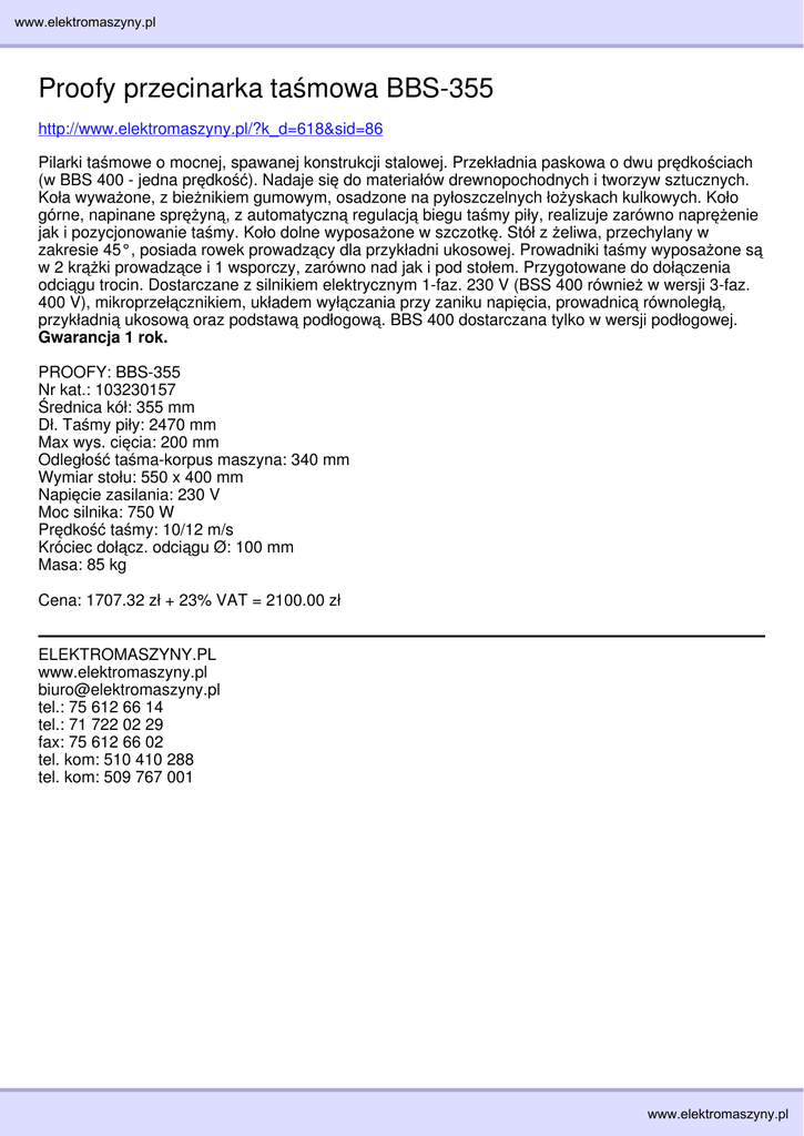 www.elektromaszyny.pl Proofy przecinarka taśmowa BBS-355 http://www.elektromaszyny.pl/?k_d=618&sid=86 Pilarki taśmowe o mocnej, spawanej konstrukcji stalowej. Przekładnia paskowa o dwu prędkościach (w BBS 400 - jedna prędkość). Nadaje się do materiałów drewnopochodnych i tworzyw sztucznych. Koła wyważone, z bieżnikiem gumowym, osadzone na pyłoszczelnych łożyskach kulkowych. Koło górne, napinane sprężyną, z automatyczną regulacją biegu taśmy piły, realizuje zarówno naprężenie jak i pozycjonowanie taśmy. Koło dolne wyposażone w szczotkę. Stół z żeliwa, przechylany w zakresie 45°, posiada rowek prowadzący dla przykładni ukosowej. Prowadniki taśmy wyposażone są w 2 krążki prowadzące i 1 wsporczy, zarówno nad jak i pod stołem. Przygotowane do dołączenia odciągu trocin. Dostarczane z silnikiem elektrycznym 1-faz. 230 V (BSS 400 również w wersji 3-faz. 400 V), mikroprzełącznikiem, układem wyłączania przy zaniku napięcia, prowadnicą równoległą, przykładnią ukosową oraz podstawą podłogową. BBS 400 dostarczana tylko w wersji podłogowej. Gwarancja 1 rok. PROOFY: BBS-355 Nr kat.: 103230157 Średnica kół: 355 mm Dł. Taśmy piły: 2470 mm Max wys. cięcia: 200 mm Odległość taśma-korpus maszyna: 340 mm Wymiar stołu: 550 x 400 mm Napięcie zasilania: 230 V Moc silnika: 750 W Prędkość taśmy: 10/12 m/s Króciec dołącz. odciągu Ø: 100 mm Masa: 85 kg Cena: 1707.32 zł + 23% VAT = 2100.00 zł ELEKTROMASZYNY.PL www.elektromaszyny.pl [email protected] tel.: 75 612 66 14 tel.: 71 722 02 29 fax: 75 612 66 02 tel. kom: 510 410 288 tel. kom: 509 767 001 www.elektromaszyny.pl
