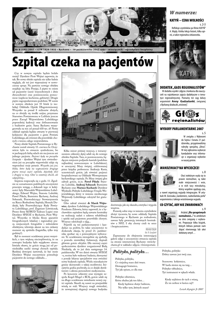 W numerze: KATYŃ – CENA WOLNOŚCI s. 2-3 Refleksje czytelników po filmie KATYŃ” A. Wajdy. Krótka lekcja historii, kilka opinii, a także regionalna ciekawostka. N r 8 ( 1 9 2 ) 2 0 0 7 • I S S N 1 4 2 9 - 1 9 3 2 • Byc h awa • 1 9 p a źd z i e r n i k a 2 0 0 7 ro k u • m i e s i ę c z n i k • e g ze m p l a r z b e z p ł at ny Szpital czeka na pacjentów Czy w nowym szpitalu będzie bolało mniej? Dyrektor Piotr Wojtaś zapewnia, że tak. Bo nowy obiekt szpitala nie tylko ładnie wygląda, ale też jest wyposażony w nowoczesny sprzęt. Na parterze nowego obiektu znajduje się Izba Przyjęć, I piętro to osiem sal pacjentów (sześć trzyosobowych i dwie dwuosobowe) oraz pomieszczenia pomocnicze (zaplecze kuchenne, gabinety). Drugie piętro zagospodarowano podobnie. W sumie w nowym obiekcie jest 55 łóżek (z izolatką) Oddziału Opieki Długoterminowej. Wszystko za ponad 8 milionów złotych, na co złożyły się środki unijne, przyznane Starostwu Powiatowemu w Lublinie jeszcze przez Zarząd Województwa Lubelskiego poprzedniej kadencji oraz dofinansowanie z budżetów gmin. Sama Bychawa wyasygnowała na ten cel ponad 610 tys. zł! Nowy oddział szpitala będzie otwarty w pierwszej kolejności dla pacjentów z gmin Powiatu Lubelskiego, ale również dla przewlekle chorych z terenu całego województwa. Nowy obiekt Szpitala Powiatowego w Bychawie został otwarty 13. czerwca br. Oczywiście było to otwarcie symboliczne, bo w pachnących farbą salach nie ma jeszcze ani jednego pacjenta. Pacjenci będą na początku listopada - dyrektor Wojtaś tym stwierdzeniem już na początku wypowiedzi zdaje się wyprzedzać moje pytanie. Wszystko już jest, łóżka, które będą na wyposażeniu drugiego piętra nowej części szpitala, dojechały dziś o drugiej w nocy. Choć w ostatniej chwili, ale zdążyliśmy... Impreza rozpoczęła się o godz. 11. Zgodnie ze scenariuszem podobnych uroczystości przecięto wstęgę, a dokonali tego w kolejności: były Marszałek Województwa Lubelskiego, Edward Wojtas, Starosta Lubelski, Paweł Pikula, Burmistrz Bychawy, Andrzej Sobaszek, Przewodniczący Stowarzyszenia na Rzecz Rozbudowy Szpitala, Henryk Dudziak, były Przewodniczący Rady Powiatu Lubelskiego, prof. Zygmunt Litwińczuk, Prezes firmy KOBUD Tadeusz Legieć oraz Dyrektor SPZOZ w Bychawie, Piotr Wojtaś. Wszystko w błysku fleszy aparatów fotograficznych lokalnej i regionalnej prasy, miejscowych fotografów i miłośników obiektywu; telewizja akurat na ten ciekawy moment się spóźniła (bagatelka, tylko trzy godziny!). Był to moment oczekiwany przez wszystkich, z tym większą niecierpliwością, że na zewnątrz budynku było wyjątkowo zimno. Istniała obawa, że goście mogą już od poniedziałku zasilić szeregi chorych szpitala. Bardziej dowcipni żartowali, że być może Dyrektor Wojtaś rzeczywiście potrzebuje pacjentów do nowego oddziału… DODATEK „GŁOS REGIONALISTÓW” W dodatku wyniki i zdjęcia z konkursu dla nauczycieli na najciekawsze zajęcia dydaktyczne o tematyce regionalistycznej. Poznamy też ciąg dalszy wspomnień Anny Gadzalanki, związanej z Bychawą działaczki „wiciowej”. WYBORY PARLAMENTARNE 2007 s. 5 Kilka minut później wszyscy, z towarzyszeniem orkiestry dętej udali się do nowego obiektu Szpitala. Tam, w pomieszczeniu, będącym miejscem podjazdu karetek (podobno najbardziej nowoczesnym w Lubelskiem), w uroczystej Mszy świętej, celebrowanej przez księdza proboszcza Andrzeja Kusia, uczestniczyli goście, jak również pacjenci hospitalizowani na Oddziale Wewnętrznym bychawskiego szpitala. Po Mszy świętej głos zabrali goście, m.in. Paweł Pikula Starosta Lubelski, Andrzej Sobaszek Burmistrz Bychawy oraz Mariusz Kucharek Dyrektor Wydziału Polityki Lubelskiego Urzędu Wojewódzkiego, który w imieniu nieobecnego Wojewody Lubelskiego odczytał list gratulacyjny. Głos zabrał również dr Marek Wójtowicz, dyrektor Lubelskiego Wojewódzkiego Funduszu Zdrowia, który zapewnił, że z bychawskim szpitalem będą zawarte kontrakty na realizację zadań z zakresu rehabilitacji i opieki nad pacjentem przewlekle chorym. Wszyscy odetchnęli z ulgą... Pojawili się też parlamentarzyści i kandydaci na posłów, bo takie uroczystości to doskonała okazja, by przed 21. października spotkać się z potencjalnymi wyborcami. Te oczekiwania niezupełnie się spełniły, z powodu niewielkiej frekwencji, dopisali głównie goście oficjalni. Dla szerszej części społeczeństwa dyrektor zorganizował Białą Niedzielę, ale to już dnia następnego 14. października. W ten dzień otwarty SPZOZ -u, można było wykonać badania, skorzystać z porady lekarzy specjalistów oraz zwiedzić nowy budynek szpitala. Wielu mieszkańców gminy skorzystało z takiej możliwości. Inicjatywa godna pochwały, za co dzięki dyrektorowi i całemu personelowi medycznemu. Po koncercie orkiestry oraz występie zespołu Kogel-Mogel z BCK, goście udali się na długo oczekiwane zwiedzanie nowej części szpitala. Skusili się nawet na przejażdżki windą ze stali. Wszyscy mogli stwierdzić, że zewnętrznej elegancji nowego budynku W związku z Wyborami do Sejmu i Senatu 21 października, przygotowaliśmy rubrykę specjalną „Głosu”. W niej ogłoszenia wyborcze kandydatów oraz informacje o organizacji wyborów w naszej gminie. WANDZINIACY NA WYCIECZCE! s. 8 Choć niektórym wyda się to prawie niemożliwe, są takie małe miejscowości i wsie, a w nich tacy mieszkańcy, którzy wspólnie spędzają czas, a nawet organizują wyjazdy integracyjne. W artykule M. Grzesiaka:„Sandomierz, nadwiślańska perła” wspomnienia z takiego wrześniowego wypadu. dorównuje, jak się okazało, estetyka i wygoda wnętrza. Pozwolę sobie więc w imieniu czytelników złożyć życzenia, by nowe oddziały Szpitala Powiatowego w Bychawie po rozbudowie, zawsze były gwarancją intratnych kontraktów z NFZ. I oby chorzy czuli tu serce i bezpieczeństwo. Moni
