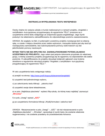 INSTRUKCJA WYPEŁANIANIA TESTU WSTĘPNEGO Osoby chętne do wzięcia udziału w kursie realizowanym w ramach projektu „Angielski z certyfikatem- kurs językowy przygotowujący do egzaminów TELC” proszone są o uzupełnienie online testu wstępnego ze znajomości języka angielskiego. Jego wynik posłużyć ma właściwemu zakwalifikowaniu do odpowiedniego poziomu zaawansowania. UWAGA: Ze względu na fakt, iż potencjalni uczestnicy projektu rozwiązują test na własną rękę, w czasie i miejscu dowolnie przez siebie wybranym, niezwykle istotne jest aby test był rozwiązywany samodzielnie, bez wykorzystywania pomocy osób trzecich czy też jakichkolwiek pomocy naukowych. WYNIK TESTU NIE MA WPŁYWU NA ZAKWALIFIKOWANIE POTENCJALNEGO UCZESTNIKA DO PROJEKTU. Jego celem jest jedynie dokonanie przydziału do właściwej grupy, w której uczestnicy projektu przygotowują się do egzaminu na odpowiednim dla siebie poziomie. O zakwalifikowaniu do projektu decyduje kolejność zgłoszeń oraz kryteria określone w regulaminie rekrutacji projektu "Angielski z certyfikatem- kurs językowy przygotowujący do egzaminów TELC ". W celu uzupełnienia testu wstępnego należy: a) przejść na stronę: http://www.profi-lingua.pl/placement/angielski/ b) uzupełnić test jednokrotnego wyboru, c) po zakończeniu testu kliknąć: „zakończ test” d) uzupełnić swoje dane teleadresowe, e) w polu „Najbliższa placówka* wybierz filię szkoły, do której masz najbliżej” zaznaczyć „Wrocław” f) w polu „Uwagi” wpisać „AZC” g) po uzupełnieniu formularza kliknąć „Wyślij formularz i zakończ test” UWAGA: Niezaznaczenie w polu „Uwagi” – „AZC” lub też niezaznaczenia w polu „Najbliższa placówka” – „Wrocław”, spowoduje iż wynik testu nie zostanie właściwie wygenerowany i nie zostanie przesłany do przedstawiciela Advance.
