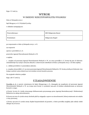 Sygn. I C 206/13 WYROK W IMIENIU RZECZYPOSPOLITEJ POLSKIEJ Dnia 27 listopada 2013 r. Sąd Okręgowy w S. I Wydział Cywilny w składzie następującym: Przewodniczący: SSO Małgorzata Banaś Protokolant: Małgorzata Bugiel po rozpoznaniu w dniu 15 listopada 2013 r. w S. na rozprawie sprawy z powództwa A. Z. przeciwko Agencji Nieruchomości Rolnych w W. o zapłatę 1. zasądza od pozwanej Agencji Nieruchomości Rolnych w W. na rzecz powódki A. Z. kwotę 83.400 zł (słownie: osiemdziesiąt trzy tysiące czterysta złotych) z ustawowymi odsetkami od dnia 15 listopada 2013 r. do dnia zapłaty; 2. oddala powództwo w pozostałym zakresie; 3. zasądza od powódki A. Z. na rzecz pozwanej Agencji Nieruchomości Rolnych w W. kwotę 3.608,50 zł (słownie: trzy tysiące sześćset osiem złotych 50/100 tytułem zwrotu kosztów procesu. Na oryginale właściwy podpis Sygn. akt I C 206/13 UZASADNIENIE Powódka A. Z. w pozwie wniesionym do Sądu Okręgowego w S., domagała się zasądzenie od pozwanej Agencji Nieruchomości Rolnych w W. na swoją rzecz kwoty w wysokości 323.400 zł tytułem odszkodowania za utracone korzyści z czego; a) kwoty 75.000 zł z tytułu utraconego dofinasowania przyznanego przez Agencję Restrukturyzacji i Modernizacji Rolnictwa na zakup nieruchomości, b) kwoty 90.000 zł z tytułu utraty dochodu jaki by osiągnęła z upraw na nieruchomości, której ostatecznie nie nabyła z winy pozwanej, c) kwoty 150.000 zł z tytułu utraty dopłat bezpośrednich od gruntów, o które powódka mogłaby jako młody rolnik ubiegać się od 2012r. d) kwoty 3.400 zł z tytułu utraconej prowizji przygotowawczej pobranej przez Bank przy podpisaniu umowy kredytowej, na zakup nieruchomości, do sfinalizowania której nie doszło z winy pozwanej, e) kwoty 5.000 zł z tytułu utraconego zadatku wpłaconego na poczet zawarcia umowy zakupu ciągnika dla potrzeb prowadzenia planowanej działalności rolniczej. Uzasadniając żądania strona powodowa wskazała, że zamierzając rozpocząć przy wsparciu swojego narzeczonego mającego w tym przedmiocie doświadczenie, własną działalność rolniczą, i posiadając już decyzję o przyznaniu na ten cel dotacji przez Agencję Restrukturyzacji i Modernizacji Rolnictwa, zdecydowała się na zakup od pozwanego w ramach ogłoszonego przetargu, nieruchomości obejmującej działkę (...) dla której uprzednio opracowała biznes plan zaakceptowany przez Agencję Restrukturyzacji i Modernizacji Rolnictwa. Pomimo wygrania przetargu i uzyskania kredytu na zakup nieruchomości nie doszło do sfinalizowania z winy pozwanego transakcji umowy sprzedaży, bowiem w dniu jej zawarcia okazało się, że na działce (...) znajdują się kurhany – cmentarzyska kultury łużyckiej, które objęte są pełną ochroną konserwatorską, i istnieje konieczność wydzielenia geodezyjnie terenu cmentarzysk oraz pozostawienia go w zasobach Skarbu Państwa, o czym Wojewódzki Urząd Ochrony Zabytków już w sierpniu 2011r. poinformował pisemnie pozwaną. Nakazem zapłaty wydanym w postępowaniu upominawczy z dnia 14 czerwca 2013 roku Sąd Okręgowy w S. w osobie Referendarza sądowego uwzględnił powództwo zgodnie z żądaniem pozwu. Od powyższego nakazu zapłaty pozwana Agencja Nieruchomości Rolnych w W. wniosła sprzeciw domagając się uchylenia nakazu i oddalenia powództwa jako bezzasadnego i pozbawionego podstaw prawnych. W uzasadnieniu podniosła, iż nie kwestionuje wprawdzie faktu, iż pismem z dnia 8 sierpnia 2011r. Wojewódzki Urząd Ochrony Zabytków w G. Delegatura w S. poinformował Agencję o ewentualnej możliwości sprzedaży przedmiotowej nieruchomości, jednakże po wcześniejszym geodezyjnym wydzieleniu wyodrębnionej części działki nr (...) na obszarze której zlokalizowane jako cmentarzysko kurhanowe kultury łużyckiej, czego istotnie nie dopełnione, jak również nie zawarto informacji o powyższym w ogłoszeniu o przetargu do którego przystąpiła powódka, to jednak gdyby powódka nie przesunęła terminu podpisania umowy na luty 2012r. to w okresie od listopada 2011r. do marca 2012r. mogła ona dokonać zmiany działki dla potrzeb uzyskania dotacji z Agencji Restrukturyzacji i Modernizacji Rolnictwa przystępując do innych przetargów organizowanych przez Agencję w ramach których oferowano do sprzedaży działki rolne. Niezależnie od tego pozwana wskazała, iż powódka nie udowodniła wysokości dochodzonego roszczenia stanowiącego szkodę. Obie strony wnosiły o zasądzenie od strony przeciwnej na swoją rzecz kosztów postępowania, w tym kosztów zastępstwa prawnego według norm przepisanych. Sąd ustalił następujący stan faktyczny: W dniu 6 czerwca 2011r. A. Z. inspirowana i wspierana przez swojego narzeczonego R. D. prowadzącego od kilku lat działalność rolniczą, planując rozpoczęcie własnej działalności tego samego rodzaju, złożyła w Agencji Restrukturyzacji i Modernizacji Rolnictwa Oddział w G. wniosek o przyznanie pomocy w ramach działania programu „Ułatwianie startu młodym rolnikom” obowiązującego w okresie od 26 kwietnia do 24 czerwca 2011 r. i był to ostatni nabór kandydatów. Jednym z warunków otrzymania dotacji było posiadanie gruntu rolnego. Powódka dla potrzeb wniosku opracowała biznes plan dla przykładowej nieruchomości i rozpoczęła poszukiwania nieruchomości spełniającej odpowiednie kryteria w tym co do powierzchni. Decyzją z dnia (...). nr (...) przyznano powódce w ramach wspierania rozwoju obszarów wiejskich z udziałem środków (...) Funduszu Rolnego na rzecz rozwoju obszarów wiejskich pomoc finansową w wysokości 75.000zł z zastrzeżeniem dopełnienia przez A. Z. w terminie nie dłuższym niż 180 dni od dnia doręczenia decyzji (14.09.2012r.) warunków w postaci 1) nabycia lub wejścia w posiadanie gospodarstwa wskazanego w biznes-planie, o powierzchni użytków rolnych nie mniejszej niż średnia powierzchnia gruntów rolnych w gospodarstwie rolnym w kraju 
