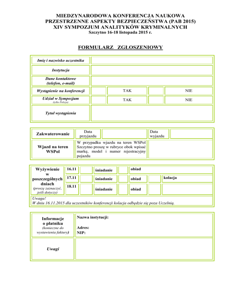 MIEDZYNARODOWA KONFERENCJA NAUKOWA PRZESTRZENNE ASPEKTY BEZPIECZEŃSTWA (PAB 2015) XIV SYMPOZJUM ANALITYKÓW KRYMINALNYCH Szczytno 16-18 listopada 2015 r. FORMULARZ ZGŁOSZENIOWY Imię i nazwisko uczestnika Instytucja Dane kontaktowe (telefon, e-mail) Wystąpienie na konferencji TAK NIE Udział w Sympozjum TAK NIE (tylko Policja) Tytuł wystąpienia Zakwaterowanie Wjazd na teren WSPol Data przyjazdu Data wyjazdu W przypadku wjazdu na teren WSPol Szczytno proszę w rubryce obok wpisać markę, model i numer rejestracyjny pojazdu 16.11 Wyżywienie w poszczególnych 17.11 dniach śniadanie obiad śniadanie obiad (proszę zaznaczyć, jeśli dotyczy) śniadanie obiad 18.11 kolacja Uwaga! W dniu 16.11.2015 dla uczestników konferencji kolacja odbędzie się poza Uczelnią. Informacje o płatniku (konieczne do wystawienia faktury) Uwagi Nazwa instytucji: Adres: NIP: WARUNKI UCZESTNICTWA Konferencja: Koszt uczestnictwa w konferencji: dla prelegentów – jest bezpłatny, dla funkcjonariuszy MSW – to ryczałt w ramach delegacji służbowej, dla pozostałych gości – to koszt wyżywienia i zakwaterowania na terenie WSPol Szczytno. Dodatkowo dla uczestników konferencji przewidziany jest serwis kawowy, materiały konferencyjne, zdjęcie pamiątkowe. Zgłoszenia: Formularz zgłoszeniowy dostępny jest na stronie www.wspol.edu.pl/ibpkt/ w zakładce konferencje. Wypełniony, podpisany i zeskanowany formularz zgłoszeniowy należy przesłać do dnia: 10.11.2015 r. pocztą elektroniczną na adres: [email protected]. Ilość miejsc w warsztatach i konferencji jest ograniczona. Do dnia 13.11.2015 r. potwierdzony zostanie drogą mailową udział w przedsięwzięciach i ze względu na ograniczoną ilość miejsc noclegowych dostępność zakwaterowania na terenie WSPol. Do kontaktów w przedsięwzięciu wyznaczone są następujące osoby: kom. Wojciech Szczepański (WSPol) tel. (89) 621-55-18 i kom. Grzegorz Sieńczewski (BSK KGP) tel. (22) 60-128-20 Data i podpis osoby zlecającej wyjazd Data i podpis uczestnika Oświadczamy, że nasza instytucja jest/nie jest płatnikiem VAT i upoważniamy Wyższą Szkołę Policji w Szczytnie do wystawiania faktury VAT bez podpisu odbiorcy. Pieczątka instytucji Podpis Głównego Księgowego/osoby upoważnionej Wyrażam zgodę na przetwarzanie moich danych osobowych zwartych w niniejszym formularzu do celów niezbędnych dla realizacji projektu Zjazd Katedr Kryminalistyki zgodnie z przepisami ustawy z dnia 29 sierpnia 1997 roku o ochronie danych osobowych (Dz.U. 1997 nr 133 poz. 883). PODPIS UCZESTNIKA