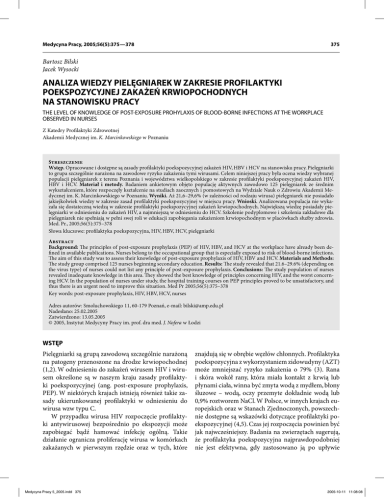 Medycyna Pracy, 2005;56(5):375 — 378 375 Bartosz Bilski Jacek Wysocki ANALIZA WIEDZY PIELĘGNIAREK W ZAKRESIE PROFILAKTYKI POEKSPOZYCYJNEJ ZAKAŻEŃ KRWIOPOCHODNYCH NA STANOWISKU PRACY THE LEVEL OF KNOWLEDGE OF POST-EXPOSURE PROHYLAXIS OF BLOOD-BORNE INFECTIONS AT THE WORKPLACE OBSERVED IN NURSES Z Katedry Profilaktyki Zdrowotnej Akademii Medycznej im. K. Marcinkowskiego w Poznaniu Streszczenie Wstęp. Opracowane i dostępne są zasady profilaktyki poekspozycyjnej zakażeń HIV, HBV i HCV na stanowisku pracy. Pielęgniarki to grupa szczególnie narażona na zawodowe ryzyko zakażenia tymi wirusami. Celem niniejszej pracy była ocena wiedzy wybranej populacji pielęgniarek z terenu Poznania i województwa wielkopolskiego w zakresie profilaktyki poekspozycyjnej zakażeń HIV, HBV i HCV. Materiał i metody. Badaniem ankietowym objęto populację aktywnych zawodowo 125 pielęgniarek ze średnim wykształceniem, które rozpoczęły kształcenie na studiach zaocznych i pomostowych na Wydziale Nauk o Zdrowiu Akademii Medycznej im. K. Marcinkowskiego w Poznaniu. Wyniki. Aż 21,6–29,6% (w zależności od rodzaju wirusa) pielęgniarek nie posiadało jakiejkolwiek wiedzy w zakresie zasad profilaktyki poekspozycyjnej w miejscu pracy. Wnioski. Analizowana populacja nie wykazała się dostateczną wiedzą w zakresie profilaktyki poekspozycyjnej zakażeń krwiopochodnych. Największą wiedzę posiadały pielęgniarki w odniesieniu do zakażeń HIV, a najmniejszą w odniesieniu do HCV. Szkolenie podyplomowe i szkolenia zakładowe dla pielęgniarek nie spełniają w pełni swej roli w edukacji zapobiegania zakażeniom krwiopochodnym w placówkach służby zdrowia. Med. Pr., 2005;56(5):375–378 Słowa kluczowe: profilaktyka poekspozycyjna, HIV, HBV, HCV, pielęgniarki Abstract Background: The principles of post-exposure prophylaxis (PEP) of HIV, HBV, and HCV at the workplace have already been defined in available publications. Nurses belong to the occupational group that is especially exposed to risk of blood-borne infections. The aim of this study was to assess their knowledge of post-exposure prophylaxis of HIV, HBV and HCV. Materials and Methods: The study group comprised 125 nurses beginning secondary education. Results: The study revealed that 21.6–29.6% (depending on the virus type) of nurses could not list any principle of post-exposure prophylaxis. Conclusions: The study population of nurses revealed inadequate knowledge in this area. They showed the best knowledge of principles concerning HIV, and the worst concerning HCV. In the population of nurses under study, the hospital training courses on PEP principles proved to be unsatisfactory, and thus there is an urgent need to improve this situation. Med Pr 2005;56(5):375–378 Key words: post-exposure prophylaxis, HIV, HBV, HCV, nurses Adres autorów: Smoluchowskiego 11, 60-179 Poznań, e-mail: [email protected] Nadesłano: 25.02.2005 Zatwierdzono: 13.05.2005 © 2005, Instytut Medycyny Pracy im. prof. dra med. J. Nofera w Łodzi WSTĘP Pielęgniarki są grupą zawodową szczególnie narażoną na patogeny przenoszone na drodze krwiopochodnej (1,2). W odniesieniu do zakażeń wirusem HIV i wirusem określone są w naszym kraju zasady profilaktyki poekspozycyjnej (ang. post-exposure prophylaxis, PEP). W niektórych krajach istnieją również takie zasady ukierunkowanej profilaktyki w odniesieniu do wirusa wzw typu C. W przypadku wirusa HIV rozpoczęcie profilaktyki antywirusowej bezpośrednio po ekspozycji może zapobiegać bądź hamować infekcję ogólną. Takie działanie ogranicza proliferację wirusa w komórkach zakażanych w pierwszym rzędzie oraz w tych, które Medycyna Pracy 5_2005.indd 375 znajdują się w obrębie węzłów chłonnych. Profilaktyka poekspozycyjna z wykorzystaniem zidowudyny (AZT) może zmniejszać ryzyko zakażenia o 79% (3). Rana i skóra wokół rany, która miała kontakt z krwią lub płynami ciała, winna być zmyta wodą z mydłem, błony śluzowe – wodą, oczy przemyte dokładnie wodą lub 0,9% roztworem NaCl. W Polsce, w innych krajach europejskich oraz w Stanach Zjednoczonych, powszechnie dostępne są wskazówki dotyczące profilaktyki poekspozycyjnej (4,5). Czas jej rozpoczęcia powinien być jak najwcześniejszy. Badania na zwierzętach sugerują, że profilaktyka poekspozycyjna najprawdopodobniej nie jest efektywna, gdy zastosowano ją po upływie 2005-10-11 11:08:08 376 B. Bilski, J. Wysocki 24–36 godzin (6,7). Polskie i zagraniczne wskazówki dotyczące postępowania poekspozycyjnego określają zakres profilaktyki i jej zasadność pod kątem: stopnia ryzyka charakterystycznego dla ekspozycji oraz poziomu ryzyka zakaźności (4). Wybór leków do profilaktyki musi uwzględniać równowagę między istniejącym ryzykiem infekcji a potencjalnym działaniem toksycznym stosowanych środków. Ponieważ PEP jest potencjalnie toksyczna, jest ona nieuzasadniona w przypadkach ekspozycji bez ściśle określonych czynników ryzyka. W skład podstawowego schematu profilaktyki poekspozycyjnej wchodzi zidowudyna (AZT) i lamiwudyna (3TC), które są nukleozydowymi inhibitorami odwrotnej transkryptazy. Schemat rozszerzony (stosowany w przypadku zwiększonego ryzyka zakażenia) dodatkowo zawiera jeden z inhibitorów proteazy – indinawir lub nelfinawir (4). W niektórych sytuacjach klinicznych (występowanie objawów ubocznych, źródło leczone AZT lub 3TC) zaleca się rozważenie podania zestawu alternatywnego (stawudyny i didanozyny). Badania serologiczne w kierunku obecności HIV u osoby eksponowanej należy wykonać bezpośrednio po narażeniu, tj. po 6 tygodniach, a następnie po 3 miesiącach i po pół roku. W przypadku wirusa wzw typu B swoista profilaktyka poekspozycyjna może obejmować podanie szczepionki, immunoglobulin anty-HBs, a także ocenę miana przeciwciał anty-HBs u narażonych pracowników. W przypadku narażenia osoby nieszczepionej podaje się immunoglobuliny oraz rozpoczyna cykl szc