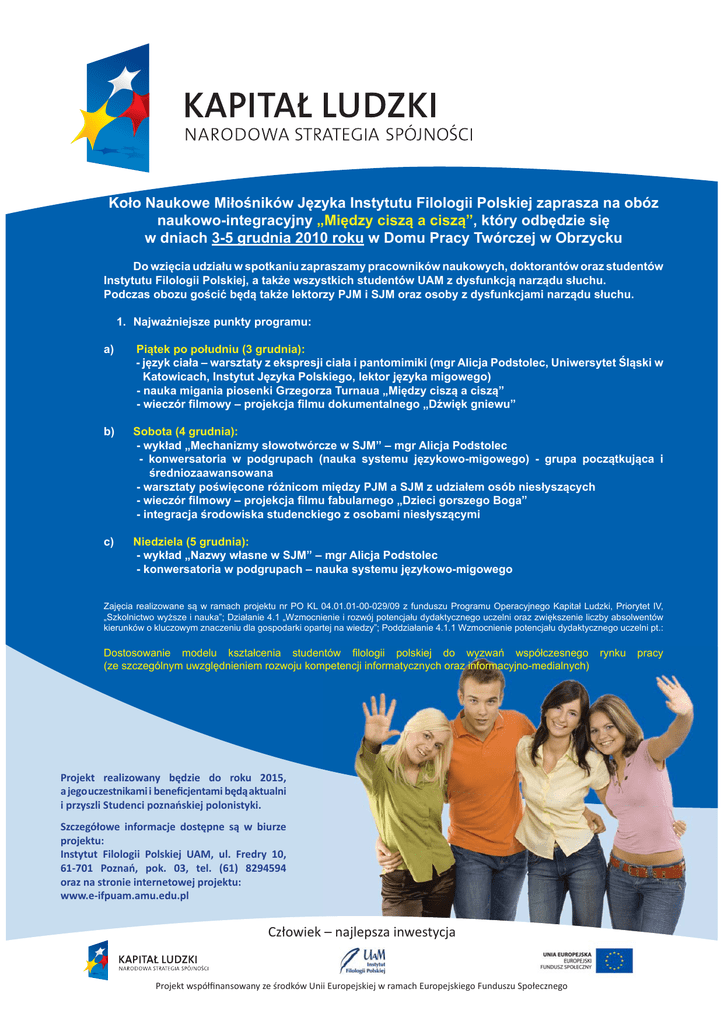 Koło Naukowe Miłośników Języka Instytutu Filologii Polskiej zaprasza na obóz naukowo-integracyjny „Między ciszą a ciszą”, który odbędzie się w dniach 3-5 grudnia 2010 roku w Domu Pracy Twórczej w Obrzycku Do wzięcia udziału w spotkaniu zapraszamy pracowników naukowych, doktorantów oraz studentów Instytutu Filologii Polskiej, a także wszystkich studentów UAM z dysfunkcją narządu słuchu. Podczas obozu gościć będą także lektorzy PJM i SJM oraz osoby z dysfunkcjami narządu słuchu. 1. Najważniejsze punkty programu: a) Piątek po południu (3 grudnia): - język ciała – warsztaty z ekspresji ciała i pantomimiki (mgr Alicja Podstolec, Uniwersytet Śląski w Katowicach, Instytut Języka Polskiego, lektor języka migowego) - nauka migania piosenki Grzegorza Turnaua „Między ciszą a ciszą” - wieczór filmowy – projekcja filmu dokumentalnego „Dźwięk gniewu” b) Sobota (4 grudnia): - wykład „Mechanizmy słowotwórcze w SJM” – mgr Alicja Podstolec - konwersatoria w podgrupach (nauka systemu językowo-migowego) - grupa początkująca i średniozaawansowana - warsztaty poświęcone różnicom między PJM a SJM z udziałem osób niesłyszących - wieczór filmowy – projekcja filmu fabularnego „Dzieci gorszego Boga” - integracja środowiska studenckiego z osobami niesłyszącymi c) Niedziela (5 grudnia): - wykład „Nazwy własne w SJM” – mgr Alicja Podstolec - konwersatoria w podgrupach – nauka systemu językowo-migowego Zajęcia realizowane są w ramach projektu nr PO KL 04.01.01-00-029/09 z funduszu Programu Operacyjnego Kapitał Ludzki, Priorytet IV, „Szkolnictwo wyższe i nauka”; Działanie 4.1 „Wzmocnienie i rozwój potencjału dydaktycznego uczelni oraz zwiększenie liczby absolwentów kierunków o kluczowym znaczeniu dla gospodarki opartej na wiedzy”; Poddziałanie 4.1.1 Wzmocnienie potencjału dydaktycznego uczelni pt.: Dostosowanie modelu kształcenia studentów filologii polskiej do wyzwań współczesnego (ze szczególnym uwzględnieniem rozwoju kompetencji informatycznych oraz informacyjno-medialnych) Projekt realizowany będzie do roku 2015, a jego uczestnikami i beneficjentami będą aktualni i przyszli Studenci poznańskiej polonistyki. Szczegółowe informacje dostępne są w biurze projektu: Instytut Filologii Polskiej UAM, ul. Fredry 10, 61-701 Poznań, pok. 03, tel. (61) 8294594 oraz na stronie internetowej projektu: www.e-ifpuam.amu.edu.pl Człowiek – najlepsza inwestycja Projekt współfinansowany ze środków Unii Europejskiej w ramach Europejskiego Funduszu Społecznego rynku pracy