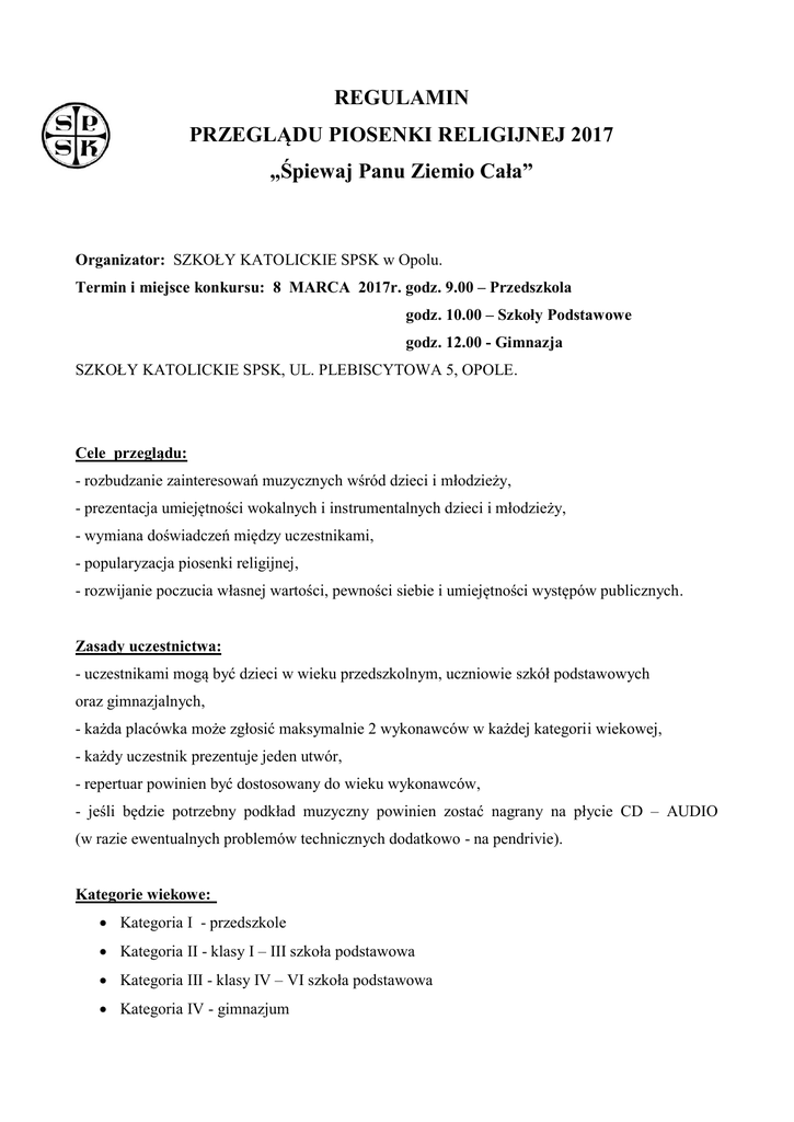 REGULAMIN PRZEGLĄDU PIOSENKI RELIGIJNEJ 2017 „Śpiewaj Panu Ziemio Cała” Organizator: SZKOŁY KATOLICKIE SPSK w Opolu. Termin i miejsce konkursu: 8 MARCA 2017r. godz. 9.00 – Przedszkola godz. 10.00 – Szkoły Podstawowe godz. 12.00 - Gimnazja SZKOŁY KATOLICKIE SPSK, UL. PLEBISCYTOWA 5, OPOLE. Cele przeglądu: - rozbudzanie zainteresowań muzycznych wśród dzieci i młodzieży, - prezentacja umiejętności wokalnych i instrumentalnych dzieci i młodzieży, - wymiana doświadczeń między uczestnikami, - popularyzacja piosenki religijnej, - rozwijanie poczucia własnej wartości, pewności siebie i umiejętności występów publicznych. Zasady uczestnictwa: - uczestnikami mogą być dzieci w wieku przedszkolnym, uczniowie szkół podstawowych oraz gimnazjalnych, - każda placówka może zgłosić maksymalnie 2 wykonawców w każdej kategorii wiekowej, - każdy uczestnik prezentuje jeden utwór, - repertuar powinien być dostosowany do wieku wykonawców, - jeśli będzie potrzebny podkład muzyczny powinien zostać nagrany na płycie CD – AUDIO (w razie ewentualnych problemów technicznych dodatkowo - na pendrivie). Kategorie wiekowe: Kategoria I - przedszkole Kategoria II - klasy I – III szkoła podstawowa Kategoria III - klasy IV – VI szkoła podstawowa Kategoria IV - gimnazjum Warunki uczestnictwa: Warunkiem uczestnictwa w konkursie jest przesłanie karty zgłoszeniowej (załącznik nr 1) w terminie do 3 marca 2017r. https://goo.gl/forms/r1jeZ0l6DPxoOQ7p1 [email protected] Można lub to zrobić wysłać skan on-line na pod adres linkiem: mailowy: Prosimy także o wypełnienie i przywiezienie ze sobą zgód na wykorzystanie wizerunku oraz przetwarzania danych osobowych (załącznik nr 2). Kryteria oceny: - walory głosowe, - umiejętności wokalne/instrumentalne wykonawców/dykcja, - ogólny wyraz artystyczny (pomysłowość, strój, prezentacja sceniczna). Postanowienia końcowe - każdy uczestnik otrzyma dyplom w zależności od zajętego miejsca. Decyzją Jury mogą również zostać przyznane wyróżnienia, - zdobywcy trzech pierwszych miejsc w każdej kategorii otrzymają cenne nagrody rzeczowe, - wzięcie udziału w konkursie jest równoznaczne z wyrażeniem zgody przez uczestnika konkursu oraz jego rodziców (prawnych opiekunów) na umieszczenie zdjęć i nazwisk laureatów na stronach internetowych organizatorów. Razem z kartą zgłoszenia należy dostarczyć oświadczenie o wyrażeniu zgody na przetwarzanie danych osobowych oraz zgodę na wykorzystanie wizerunku, - szkoła, do której uczęszcza uczestnik konkursu, ma obowiązek zapoznać uczestnika konkursu oraz jego rodziców (prawnych opiekunów) z regulaminem konkursu. Regulamin konkursu jest dostępny na stronie internetowej szkoły www.szkolykatolickie.opole.pl, oraz na stronie konkursu https://tackk.com/przegladpiosenkireligijnej Organizator zastrzega sobie prawo do zmian w organizacji konkursu. Kwestie sporne będą rozstrzygane przez organizatora. W przerwach na obrady jury wystąpią uczniowie Katolickiego Liceum, uczestnicy warsztatów artystycznych. Organizatorzy: Maria Dragon – dyrektor szkół katolickich SPSK w Opolu. Zofia Honisch – nauczycielka języka angielskiego. tel. 77 4000234, kom. 608377226 ZAŁĄCZNIK NR 1 KARTA ZGŁOSZENIOWA1 PRZEGLĄD PIOSENKI RELIGIJNEJ SPSK Opole Nazwisko i imię solisty/ duetu/ nazwa zespołu (ilość osób) ………………………………………………………………………………………………… ………………………………………………………………………………………………… Kategoria wiekowa …………………………………………………………………………. Imię i nazwisko opiekuna ………………………………………………………………….. Nazwa i adres placówki ( telefon - mail) ………………………………………………………………………………………………… ………………………………………………………………………………………………… Tytuł wykonywanej piosenki ………………………………………………………………………………………………… Informacje o potrzebnym sprzęcie (ilość mikrofonów, instrumentów z podpięciami, odtwarzacz CD, itd.) ………….………………..…………………………………………………………………….. …………………………………………………………………………………………………. ………………………………….. ………………………. pieczęć szkoły/przedszkola podpis nauczyciela ZAŁĄCZNIK NR 2 1 Proszę o wypełnienie drukowanymi literami OŚWIADCZENIE O WYRAŻENIU ZGODY NA PRZETWARZANIE DANYCH OSOBOWYCH Ja niżej podpisany/a: (imię i nazwisko rodzica/opiekuna prawnego) ................................................................. wyrażam zgodę na przetwarzanie danych osobowych mojego dziecka / podopiecznego (imię i nazwisko dziecka) ............................................................................................... na potrzeby związane z organizacją Przeglądu Piosenki Religijnej „Śpiewaj Panu Ziemio Cała”, w tym na opublikowanie imienia, nazwiska oraz zdjęcia na liście laureatów na stronie internetowej Organizatora oraz przekazanie danych laureata do organu prowadzącego i organu nadzoru pedagogicznego, zgodnie z ustawą z dnia 29 lipca 1997 r. o ochronie danych osobowych (tekst jedn. Dz. U. 2016 nr 0 poz. 922 z późniejszymi zmianami). ................................................................. (czytelny podpis rodzica/opiekuna prawnego) ZGODA NA WYKORZYSTANIE WIZERUNKU DZIECKA Ja niżej podpisany/a: (imię i nazwisko rodzica/opiekuna prawnego) ................................................................. wyrażam nieograniczoną w czasie zgodę na nieodpłatne wykorzystanie przez organizatora wizerunku mojego dziecka /