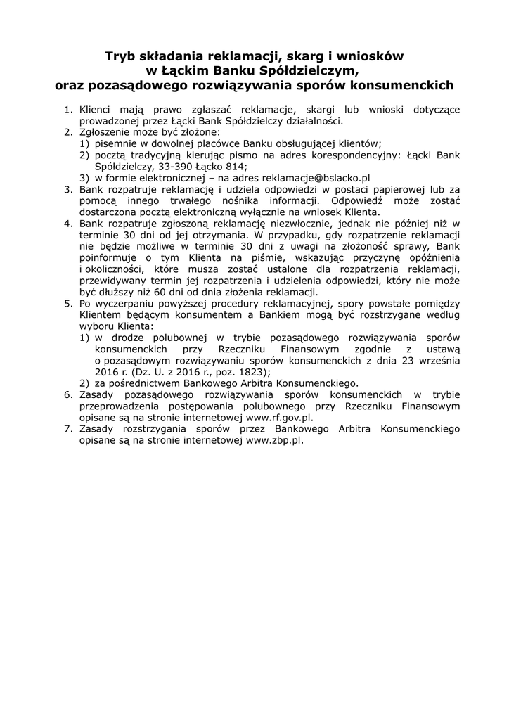 Tryb składania reklamacji, skarg i wniosków w Łąckim Banku Spółdzielczym, oraz pozasądowego rozwiązywania sporów konsumenckich 1. Klienci mają prawo zgłaszać reklamacje, skargi lub wnioski dotyczące prowadzonej przez Łącki Bank Spółdzielczy działalności. 2. Zgłoszenie może być złożone: 1) pisemnie w dowolnej placówce Banku obsługującej klientów; 2) pocztą tradycyjną kierując pismo na adres korespondencyjny: Łącki Bank Spółdzielczy, 33-390 Łącko 814; 3) w formie elektronicznej – na adres [email protected] 3. Bank rozpatruje reklamację i udziela odpowiedzi w postaci papierowej lub za pomocą innego trwałego nośnika informacji. Odpowiedź może zostać dostarczona pocztą elektroniczną wyłącznie na wniosek Klienta. 4. Bank rozpatruje zgłoszoną reklamację niezwłocznie, jednak nie później niż w terminie 30 dni od jej otrzymania. W przypadku, gdy rozpatrzenie reklamacji nie będzie możliwe w terminie 30 dni z uwagi na złożoność sprawy, Bank poinformuje o tym Klienta na piśmie, wskazując przyczynę opóźnienia i okoliczności, które musza zostać ustalone dla rozpatrzenia reklamacji, przewidywany termin jej rozpatrzenia i udzielenia odpowiedzi, który nie może być dłuższy niż 60 dni od dnia złożenia reklamacji. 5. Po wyczerpaniu powyższej procedury reklamacyjnej, spory powstałe pomiędzy Klientem będącym konsumentem a Bankiem mogą być rozstrzygane według wyboru Klienta: 1) w drodze polubownej w trybie pozasądowego rozwiązywania sporów konsumenckich przy Rzeczniku Finansowym zgodnie z ustawą o pozasądowym rozwiązywaniu sporów konsumenckich z dnia 23 września 2016 r. (Dz. U. z 2016 r., poz. 1823); 2) za pośrednictwem Bankowego Arbitra Konsumenckiego. 6. Zasady pozasądowego rozwiązywania sporów konsumenckich w trybie przeprowadzenia postępowania polubownego przy Rzeczniku Finansowym opisane są na stronie internetowej www.rf.gov.pl. 7. Zasady rozstrzygania sporów przez Bankowego Arbitra Konsumenckiego opisane są na stronie internetowej www.zbp.pl.