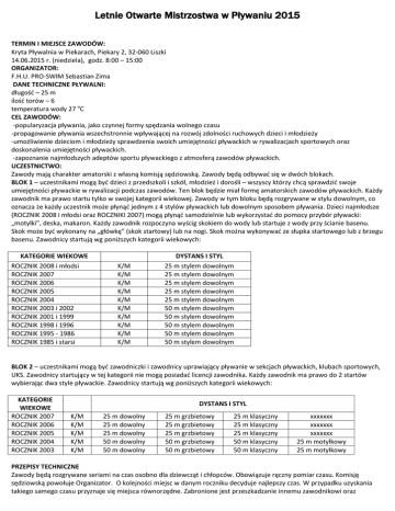 Letnie Otwarte Mistrzostwa w Pływaniu 2015 TERMIN I MIEJSCE ZAWODÓW: Kryta Pływalnia w Piekarach, Piekary 2, 32-060 Liszki 14.06.2015 r. (niedziela), godz. 8:00 – 15:00 ORGANIZATOR: F.H.U. PRO-SWIM Sebastian Zima DANE TECHNICZNE PŁYWALNI: długość – 25 m ilość torów – 6 temperatura wody 27 oC CEL ZAWODÓW: -popularyzacja pływania, jako czynnej formy spędzania wolnego czasu -propagowanie pływania wszechstronnie wpływającej na rozwój zdolności ruchowych dzieci i młodzieży -umożliwienie dzieciom i młodzieży sprawdzenia swoich umiejętności pływackich w rywalizacjach sportowych oraz doskonalenia umiejętności pływackich. -zapoznanie najmłodszych adeptów sportu pływackiego z atmosferą zawodów pływackich. UCZESTNICTWO: Zawody mają charakter amatorski z własną komisją sędziowską. Zawody będą odbywać się w dwóch blokach. BLOK 1 – uczestnikami mogą być dzieci z przedszkoli i szkół, młodzież i dorośli – wszyscy którzy chcą sprawdzić swoje umiejętności pływackie w rywalizacji podczas zawodów. Ten blok będzie miał formę amatorskich zawodów pływackich. Każdy zawodnik ma prawo startu tylko w swojej kategorii wiekowej. Zawody w tym bloku będą rozgrywane w stylu dowolnym, co oznacza że każdy uczestnik może płynąć jednym z 4 stylów pływackich lub dowolnym sposobem pływania. Dzieci najmłodsze (ROCZNIK 2008 i młodsi oraz ROCZNIKI 2007) mogą płynąć samodzielnie lub wykorzystać do pomocy przybór pływacki: „motylki”, deska, makaron. Każdy zawodnik rozpoczyna wyścig skokiem do wody lub startuje z wody przy ścianie basenu. Skok może być wykonany na „główkę” (skok startowy) lub na nogi. Skok można wykonywać ze słupka startowego lub z brzegu basenu. Zawodnicy startują wg poniższych kategorii wiekowych: KATEGORIE WIEKOWE ROCZNIK 2008 i młodsi ROCZNIK 2007 ROCZNIK 2006 ROCZNIK 2005 ROCZNIK 2004 ROCZNIK 2003 i 2002 ROCZNIK 2001 i 1999 ROCZNIK 1998 i 1996 ROCZNIK 1995 - 1986 ROCZNIK 1985 i starsi K/M K/M K/M K/M K/M K/M K/M K/M K/M K/M DYSTANS I STYL 25 m stylem dowolnym 25 m stylem dowolnym 25 m stylem dowolnym 25 m stylem dowolnym 25 m stylem dowolnym 50 m stylem dowolnym 50 m stylem dowolnym 50 m stylem dowolnym 50 m stylem dowolnym 50 m stylem dowolnym BLOK 2 – uczestnikami mogą być zawodniczki i zawodnicy uprawiający pływanie w sekcjach pływackich, klubach sportowych, UKS. Zawodnicy startujący w tej kategorii nie mogą posiadać licencji zawodnika. Każdy zawodnik ma prawo do 2 startów wybierając dwa style pływackie. Zawodnicy startują wg poniższych kategorii wiekowych: KATEGORIE WIEKOWE ROCZNIK 2007 ROCZNIK 2006 ROCZNIK 2005 ROCZNIK 2004 ROCZNIK 2003 DYSTANS I STYL K/M K/M K/M K/M K/M 25 m dowolny 25 m dowolny 25 m dowolny 50 m dowolny 50 m dowolny 25 m grzbietowy 25 m grzbietowy 25 m grzbietowy 50 m grzbietowy 50 m grzbietowy 25 m klasyczny 25 m klasyczny 25 m klasyczny 50 m klasyczny 50 m klasyczny xxxxxxx xxxxxxx xxxxxxx 25 m motylkowy 25 m motylkowy PRZEPISY TECHNICZNE Zawody będą rozgrywane seriami na czas osobno dla dziewcząt i chłopców. Obowiązuje ręczny pomiar czasu. Komisję sędziowską powołuje Organizator. O kolejności miejsc w danym roczniku decyduje najlepszy czas. W przypadku uzyskania takiego samego czasu przyznaje się miejsca równorzędne. Zabronione jest przeszkadzanie innemu zawodnikowi oraz używanie urządzeń lub ubioru, które pomagałyby zwiększać szybkość, pływalność lub wytrzymałość – np. płetwy, łapki, rękawice, deski, itp. W czasie trwania zawodów obowiązują aktualne przepisy PZP. W przypadku małej ilości zgłoszeń w danej kategorii, organizator dopuszcza przeprowadzenie wyścigu bez podziału na kategorię wiekową. Po zakończeniu konkurencji, zostaną ogłoszone wyniki z podziałem na kategorie wiekowe. ZGŁOSZENIA DO ZAWODÓW: BLOK 1 Zgłoszenia do zawodów poprzez wypełnienie „Karty zgłoszenia” i opłacenie „Opłaty startowej” (wpłaty gotówkowe). Karty zgłoszenia będą dostępne u organizatora. Na karcie zgłoszenia należy koniecznie podpisać oświadczenie zapoznaniu się z regulaminem zawodów i o braku przeciwwskazań zdrowotnych do udziału w zawodach. W przypadku osób niepełnoletnich, takie oświadczenie podpisuje rodzic. Wypełnioną kartę zgłoszenia oraz opłatę startową należy złożyć u organizatora do 06.06.2015 roku. Zgłoszenia do zawodów można również dokonać elektronicznie wypełniając Formularz Zgłoszenia-INDYWIDUALNIE. Zgłoszenie w takiej formie należy wysłać do dnia 6.06.2015 roku. Każda osoba która zgłosi swój udział w takiej formie zobowiązuje się uiszczenia opłaty startowej najpóźniej w dniu zawodów do godziny 8:30. BLOK 2 Zgłoszenia zawodników należy wysłać w formie zbiorczej na adres [email protected], podając: nazwisko i imię zawodnika, rok urodzenia, wybrane konkurencje (2 style) w jakich zawodnik będzie startował oraz czas na dystansie dodatkowo nazwisko i imię trenera, telefon kontaktowy. Dodatkowo kierownicy drużyn muszą przekazać do organizatora (w dniu zawodów) listę potwierdzająca zdolność lekarską i oświadczenie o odpowiedzialności za zawodników. Zgłoszenie należy wysłać do dnia 6.06.2015 roku. Opłatę startową kierownicy drużyn wpłacają u organizatora w dniu zawodów. Uwaga !!! Zgłoszenia po terminie 6.06.2015 będą rozpatrywane indywidualnie , w zależności od ilości wolnych miejsc. W przypadku takiego zgłoszenia zawodnik zostanie dopuszczony do zawodów, jednak może nie otrzymać pamiątkowej koszulki wchodzącej w skład pakietu startowego. Ilość miejsc ograniczona – decyduje kolejność zgłoszeń. Organizator zastrzega sobie prawo do wcześniejszego zakończenia zgłoszeń. ZASADY FINANSOWANIA Koszty organizacyjne pokrywa F.H.U. PRO-SWIW Sebastian Zima Koszty uczestnictwa pokrywają zawodnicy – opłata startowa: 20 zł od zawodnika BLOK 1 / 25 zł od zawodnika BLOK 2 Opłata startowa zawiera: wejści