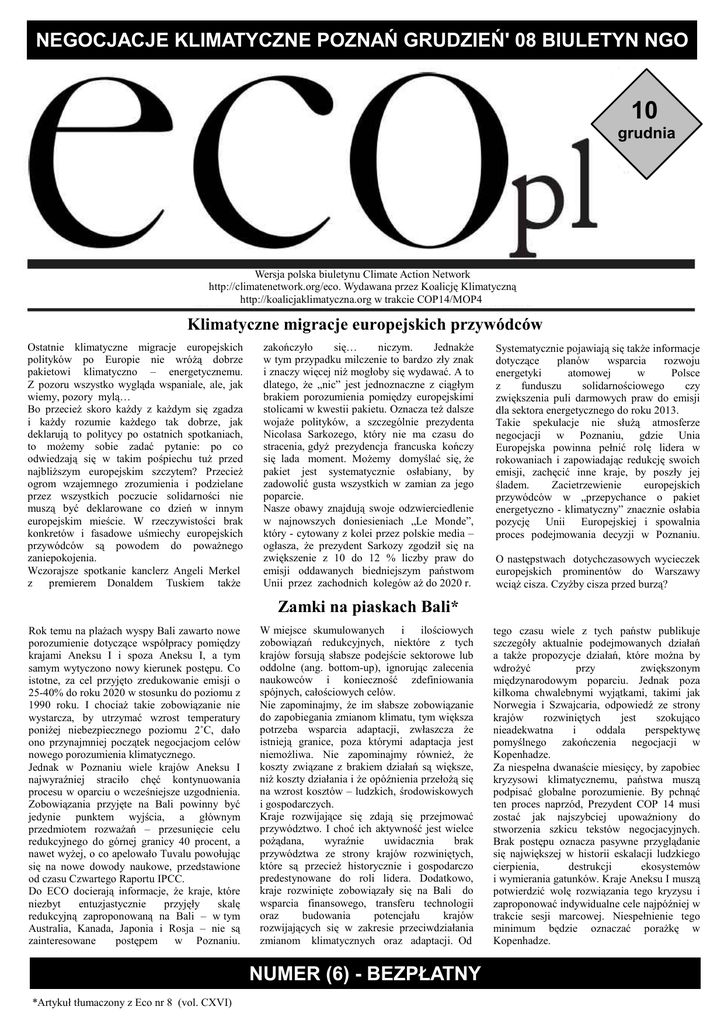 NEGOCJACJE KLIMATYCZNE POZNAŃ GRUDZIEŃ' 08 BIULETYN NGO 10 grudnia Wersja polska biuletynu Climate Action Network http://climatenetwork.org/eco. Wydawana przez Koalicję Klimatyczną http://koalicjaklimatyczna.org w trakcie COP14/MOP4 Klimatyczne migracje europejskich przywódców Ostatnie klimatyczne migracje europejskich polityków po Europie nie wróżą dobrze pakietowi klimatyczno – energetycznemu. Z pozoru wszystko wygląda wspaniale, ale, jak wiemy, pozory mylą… Bo przecież skoro każdy z każdym się zgadza i każdy rozumie każdego tak dobrze, jak deklarują to politycy po ostatnich spotkaniach, to możemy sobie zadać pytanie: po co odwiedzają się w takim pośpiechu tuż przed najbliższym europejskim szczytem? Przecież ogrom wzajemnego zrozumienia i podzielane przez wszystkich poczucie solidarności nie muszą być deklarowane co dzień w innym europejskim mieście. W rzeczywistości brak konkretów i fasadowe uśmiechy europejskich przywódców są powodem do poważnego zaniepokojenia. Wczorajsze spotkanie kanclerz Angeli Merkel z premierem Donaldem Tuskiem także zakończyło się… niczym. Jednakże w tym przypadku milczenie to bardzo zły znak i znaczy więcej niż mogłoby się wydawać. A to dlatego, że „nic” jest jednoznaczne z ciągłym brakiem porozumienia pomiędzy europejskimi stolicami w kwestii pakietu. Oznacza też dalsze wojaże polityków, a szczególnie prezydenta Nicolasa Sarkozego, który nie ma czasu do stracenia, gdyż prezydencja francuska kończy się lada moment. Możemy domyślać się, że pakiet jest systematycznie osłabiany, by zadowolić gusta wszystkich w zamian za jego poparcie. Nasze obawy znajdują swoje odzwierciedlenie w najnowszych doniesieniach „Le Monde”, który - cytowany z kolei przez polskie media – ogłasza, że prezydent Sarkozy zgodził się na zwiększenie z 10 do 12 % liczby praw do emisji oddawanych biedniejszym państwom Unii przez zachodnich kolegów aż do 2020 r. Systematycznie pojawiają się także informacje dotyczące planów wsparcia rozwoju energetyki atomowej w Polsce z funduszu solidarnościowego czy zwiększenia puli darmowych praw do emisji dla sektora energetycznego do roku 2013. Takie spekulacje nie służą atmosferze negocjacji w Poznaniu, gdzie Unia Europejska powinna pełnić rolę lidera w rokowaniach i zapowiadając redukcję swoich emisji, zachęcić inne kraje, by poszły jej śladem. Zacietrzewienie europejskich przywódców w „przepychance o pakiet energetyczno - klimatyczny” znacznie osłabia pozycję Unii Europejskiej i spowalnia proces podejmowania decyzji w Poznaniu. O następstwach dotychczasowych wycieczek europejskich prominentów do Warszawy wciąż cisza. Czyżby cisza przed burzą? Zamki na piaskach Bali* Rok temu na plażach wyspy Bali zawarto nowe porozumienie dotyczące współpracy pomiędzy krajami Aneksu I i spoza Aneksu I, a tym samym wytyczono nowy kierunek postępu. Co istotne, za cel przyjęto zredukowanie emisji o 25-40% do roku 2020 w stosunku do poziomu z 1990 roku. I chociaż takie zobowiązanie nie wystarcza, by utrzymać wzrost temperatury poniżej niebezpiecznego poziomu 2˚C, dało ono przynajmniej początek negocjacjom celów nowego porozumienia klimatycznego. Jednak w Poznaniu wiele krajów Aneksu I najwyraźniej straciło chęć kontynuowania procesu w oparciu o wcześniejsze uzgodnienia. Zobowiązania przyjęte na Bali powinny być jedynie punktem wyjścia, a głównym przedmiotem rozważań – przesunięcie celu redukcyjnego do górnej granicy 40 procent, a nawet wyżej, o co apelowało Tuvalu powołując się na nowe dowody naukowe, przedstawione od czasu Czwartego Raportu IPCC. Do ECO docierają informacje, że kraje, które niezbyt entuzjastycznie przyjęły skalę redukcyjną zaproponowaną na Bali – w tym Australia, Kanada, Japonia i Rosja – nie są zainteresowane postępem w Poznaniu. W miejsce skumulowanych i ilościowych zobowiązań redukcyjnych, niektóre z tych krajów forsują słabsze podejście sektorowe lub oddolne (ang. bottom-up), ignorując zalecenia naukowców i konieczność zdefiniowania spójnych, całościowych celów. Nie zapominajmy, że im słabsze zobowiązanie do zapobiegania zmianom klimatu, tym większa potrzeba wsparcia adaptacji, zwłaszcza że istnieją granice, poza którymi adaptacja jest niemożliwa. Nie zapominajmy również, że koszty związane z brakiem działań są większe, niż koszty działania i że opóźnienia przełożą się na wzrost kosztów – ludzkich, środowiskowych i gospodarczych. Kraje rozwijające się zdają się przejmować przywództwo. I choć ich aktywność jest wielce pożądana, wyraźnie uwidacznia brak przywództwa ze strony krajów rozwiniętych, które są przecież historycznie i gospodarczo predestynowane do roli lidera. Dodatkowo, kraje rozwinięte zobowiązały się na Bali do wsparcia finansowego, transferu technologii oraz budowania potencjału krajów rozwijających się w zakresie przeciwdziałania zmianom klimatycznych oraz adaptacji. Od NUMER (6) - BEZPŁATNY *Artykuł tłumaczony z Eco nr 8 (vol. CXVI) tego czasu wiele z tych państw publikuje szczegóły aktualnie podejmowanych działań a także propozycje działań, które można by wdrożyć przy zwiększonym międzynarodowym poparciu. Jednak poza kilkoma chwalebnymi wyjątkami, takimi jak Norwegia i Szwajcaria, odpowiedź ze strony krajów rozwiniętych jest szokująco nieadekwatna i oddala perspektywę pomyślnego zakończenia negocjacji w Kopenhadze. Za niespełna dwanaście miesięcy, by zapobiec kryzysowi klimatycznemu, państwa muszą podpisać globalne porozumienie. By pchnąć ten proces naprzód, Prezydent COP 14 musi zostać jak najszybciej upoważniony do stworzenia szkicu tekstów negocjacyjnych. Brak postępu oznacza pasywne przyglądanie się największej w historii eskalacji ludzkiego cierpienia, destrukcji ekosystemów i wymierania gatunków. Kraje Aneksu I muszą potwierdzić wolę rozwi