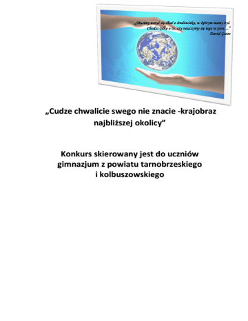 „Musimy uczyć się dbać o środowisko, w którym mamy żyć. Chodzi tylko o to, czy nauczymy się tego w porę…” David Gates „Cudze chwalicie swego nie znacie -krajobraz najbliższej okolicy” Konkurs skierowany jest do uczniów gimnazjum z powiatu tarnobrzeskiego i kolbuszowskiego I. Cele konkursu: 1. Pomoc w identyfikacji z „małą ojczyzną”. 2. Zapoznanie się ze środowiskiem geograficzno-przyrodniczym najbliższej okolicy. 3. Uwrażliwienie młodzieży na piękno najbliższego regionu. 4. Kształtowanie postaw patriotycznych. 5. Przeprowadzenie obserwacji terenowych. 6. Kształtowanie umiejętności selekcjonowania informacji. 7. Wykorzystanie umiejętności multimedialnych (przetwarzanie informacji). 8. Pobudzanie twórczej wyobraźni i pomysłowości młodzieży. 9. Promowanie techniki komputerowej. 10. Możliwość zaprezentowania prac na stronach wirtualnej galerii internetowej. 11. Inspirowanie uczniów do twórczości artystycznej. II. Informacje o konkursie: 1. W konkursie mogą brać udział uczniowie indywidualni lub grupy 2-4 osobowe; 2. Każda praca musi posiadać elementy metodyki badań: a) temat pracy, b) krótka charakterystyka wybranego regionu, miejsc, (maksymalnie strona formatu A4), c) forma prezentacji pracy do wyboru- przewodnik informacyjny w formie prezentacji multimedialnej, album multimedialny, album w formie papierowej, d) praca musi zawierać fotografie (od 4 -10 sztuk) dotyczące tematu pracy, e) ostateczny termin składania prac: 26.04.2014r.(do sekretariatu Zespołu Szkół nr 2 w Nowej Dębie), f) o wynikach konkursu szkoły zostaną poinformowane do dnia 30.04.2014r., g) uroczyste wręczenie nagród, wyróżnień i podziękowań odbędzie się 08.05.2014r. w Zespole Szkół nr 2 w Nowej Dębie. 3. Regulamin do prac konkursowych: a) prace powinny być wykonane w dowolnym programie wyposażonym w funkcję elektronicznego albumu do zdjęć i grafiki, b) każde zdjęcie umieszczone w albumie powinno posiadać krótki opis, c) praca powinna zawierać do 10 kart, slajdów, d) każdy z uczestników może zgłosić tylko jedną pracę, e) prace należy zapisać na płycie CD-ROM z opisem: imię, nazwisko ucznia, klasa, do której uczęszcza, nazwa szkoły, program, w którym praca została utworzona, literatura źródłowa, nazwisko opiekuna konkursu w szkole, f) albumy w formie papierowej muszą zawierać następujące informacje: imię, nazwisko ucznia, klasa, do której uczęszcza, nazwa szkoły, literatura źródłowa, nazwisko opiekuna konkursu w szkole, g) najlepsze prace zostaną opublikowane na stronie internetowej pod adresem:www.zs2nd.pl, h) organizatorzy nie zwracają prac, i) dodatkowych informacji udzielają nauczyciele: p. B. Sado, p. E. Konefał, p. M. Jachyra. III. Literatura 1. „Geografia środowisko przyrodnicze” – W. Wiecki, E. Lipińska, M. Sobańska. Wyd. OPERON 2. „Oblicza geografii cz.1” – R. Malarz, M. Więckowski. Wyd. Nowa Era 3. „Oblicza geografii – książka Nauczyciela cz.1” - Wyd. Nowa Era.
