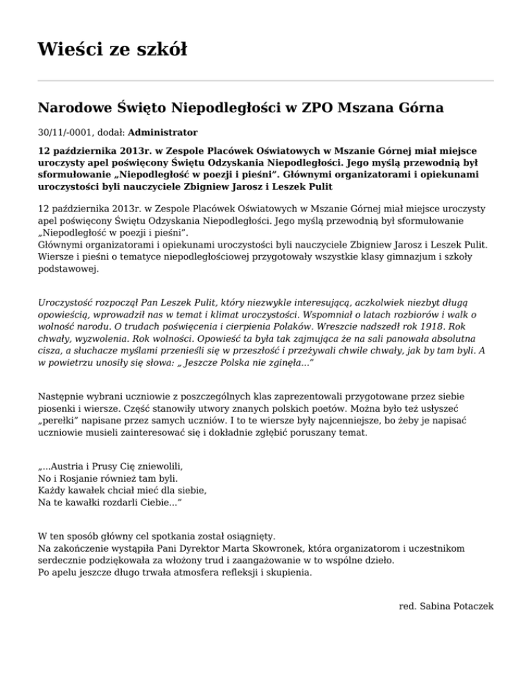 Wieści ze szkół Narodowe Święto Niepodległości w ZPO Mszana Górna 30/11/-0001, dodał: Administrator 12 października 2013r. w Zespole Placówek Oświatowych w Mszanie Górnej miał miejsce uroczysty apel poświęcony Świętu Odzyskania Niepodległości. Jego myślą przewodnią był sformułowanie „Niepodległość w poezji i pieśni”. Głównymi organizatorami i opiekunami uroczystości byli nauczyciele Zbigniew Jarosz i Leszek Pulit 12 października 2013r. w Zespole Placówek Oświatowych w Mszanie Górnej miał miejsce uroczysty apel poświęcony Świętu Odzyskania Niepodległości. Jego myślą przewodnią był sformułowanie „Niepodległość w poezji i pieśni”. Głównymi organizatorami i opiekunami uroczystości byli nauczyciele Zbigniew Jarosz i Leszek Pulit. Wiersze i pieśni o tematyce niepodległościowej przygotowały wszystkie klasy gimnazjum i szkoły podstawowej. Uroczystość rozpoczął Pan Leszek Pulit, który niezwykle interesującą, aczkolwiek niezbyt długą opowieścią, wprowadził nas w temat i klimat uroczystości. Wspomniał o latach rozbiorów i walk o wolność narodu. O trudach poświęcenia i cierpienia Polaków. Wreszcie nadszedł rok 1918. Rok chwały, wyzwolenia. Rok wolności. Opowieść ta była tak zajmująca że na sali panowała absolutna cisza, a słuchacze myślami przenieśli się w przeszłość i przeżywali chwile chwały, jak by tam byli. A w powietrzu unosiły się słowa: „ Jeszcze Polska nie zginęła...” Następnie wybrani uczniowie z poszczególnych klas zaprezentowali przygotowane przez siebie piosenki i wiersze. Część stanowiły utwory znanych polskich poetów. Można było też usłyszeć „perełki” napisane przez samych uczniów. I to te wiersze były najcenniejsze, bo żeby je napisać uczniowie musieli zainteresować się i dokładnie zgłębić poruszany temat. „...Austria i Prusy Cię zniewolili, No i Rosjanie również tam byli. Każdy kawałek chciał mieć dla siebie, Na te kawałki rozdarli Ciebie...” W ten sposób główny cel spotkania został osiągnięty. Na zakończenie wystąpiła Pani Dyrektor Marta Skowronek, która organizatorom i uczestnikom serdecznie podziękowała za włożony trud i zaangażowanie w to wspólne dzieło. Po apelu jeszcze długo trwała atmosfera refleksji i skupienia. red. Sabina Potaczek zdjęcia