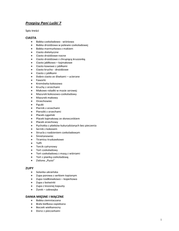 Przepisy Pani Luśki 7 Spis treści CIASTA Babka czekoladowo - wiśniowa Babka drożdżowa w polewie czekoladowej Babka marmurkowa z makiem Ciasto dietetyczne Ciasto drożdżowe nocne Ciasto drożdżowe z chrupiącą kruszonką Ciasto jabłkowo – kajmakowe Ciasto kawowe z jabłkami Ciasto krucho - drożdżowe Ciasto z jabłkami Dobre ciasto ze śliwkami – ucierane Faworki Kremówka kokosowa Kruchy z orzechami Makowe roladki w masie serowej Mazurek kokosowo-czekoladowy Mazurek makowy Orzechowiec Pączki Piernik z orzechami Pierożki z orzechami Placek cygaoski Placek kajmakowy ze słonecznikiem Placek orzechowy Pychotka z płatków kukurydzianych bez pieczenia Sernik z kokosem Strucla z nadzieniem czekoladowym Śmietanowiec Tiramisu truskawkowe Toffi Torcik cytrynowy Tort czekoladowy Tort czekoladowy z masą z wiśniami Tort z pianką czekoladową Zielone „Pysio” ZUPY Solanka ukraioska Zupa porowa z serkiem topionym Zupa rzodkiewkowo – koperkowa Zupa z botwinki Zupa z kiszonej kapusty Żurek – zalewajka DANIA MIĘSNE I MĄCZNE Babka ziemniaczana Biała kiełbasa zapiekana Boczek wielkanocny Dorsz z pieczarkami 1 Drób w cieście Jajka faszerowane wiosenne Karkówka po królewsku Karkówka zapiekana Kulki drobiowe Kurczak faszerowany mięsem Makaron z pieczarkami Mięso pietruszkowe Muszle makaronowe faszerowane Pieczone ziemniaki Piersi nadziewane Polędwiczki wieprzowe w sosie kurkowym Rolada z indyka Ryba smażona Schab nadziewany polędwicą Schab zapiekany z porami i marchewką Słone babeczki z mięsem Spaghetti z kurczakiem i warzywami Śliwki z boczkiem zapiekane Wątróbki drobiowe z jabłkiem Żeberka z warzywami SAŁATKI, SURÓWKI Sałatka bankietowa Sałatka chrzanowa Sałatka imieninowa Sałatka śledziowa Sałatka wielowarstwowa Sałatka z białej kapusty Sałatka z brokuła I Sałatka z brokuła II Sałatka z cebulką Sałatka z kalarepą Sałatka z kurczakiem Sałatka z makaronem i kurczakiem Sałatka z pierożkami „Tortellini” Sałatka z rzodkiewek Sałatka z szynką Sałatka z tuoczykiem Surówka z białej kapusty Surówka z białej kapusty i buraczków Surówka z białej kapusty z koperkiem i kminkiem PRZETWORY Pikle z ogórków kiszone Sałatka warzywna na zimę Sałatka z buraków na zimę Śliwki w zalewie octowej DOBRE RADY 2