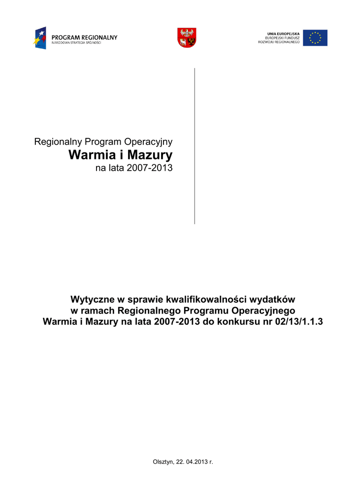 Regionalny Program Operacyjny Warmia i Mazury na lata 2007-2013 Wytyczne w sprawie kwalifikowalności wydatków w ramach Regionalnego Programu Operacyjnego Warmia i Mazury na lata 2007-2013 do konkursu nr 02/13/1.1.3 Olsztyn, 22. 04.2013 r. Spis treści CZĘŚĆ PIERWSZA - ZASADY OGÓLNE ............................................................................... 6 1. Pojęcie kwalifikowalności wydatków. .................................................................................................. 6 2. Podmiot ponoszący wydatki. .................................................................................................................. 7 3. Uznanie wydatku za poniesiony. ........................................................................................................... 7 4. Termin poniesienia wydatku. .................................................................................................................. 8 5. Ogólne warunki uznania wydatku za kwalifikowalny. .................................................................... 10 6. Podatek VAT oraz inne obciążenia publicznoprawne. ................................................................... 11 7. Projekty generujące dochód, dochód incydentalny oraz kary umowne ................................... 12 CZĘŚĆ DRUGA - WARUNKI UZNANIA ZA KWALIFIKOWALNE POSZCZEGÓLNYCH RODZAJÓW WYDATKÓW ...................................................................................................... 14 A. Wydatki związane z przygotowaniem projektu. .......................................................... 14 8. Prace przygotowawcze. ......................................................................................................................... 14 B. Wydatki związane bezpośrednio z realizacją projektu. ............................................. 15 9. Nabycie nieruchomości. ........................................................................................................................ 15 10. Zakup środków trwałych. .................................................................................................................... 18 11. Instalacja środków trwałych. .............................................................................................................. 19 12. Amortyzacja środków trwałych – zgodnie z częścią D punkt 35.3. ............................................. 19 13. Zakup wartości niematerialnych lub prawnych. ............................................................................ 19 14. Leasing oraz inne techniki finansowania nieruchomości, środków trwałych i wartości niematerialnych i prawnych................................................................................................................ 19 15. Roboty budowlane. ............................................................................................................................... 20 16. Opłaty za usunięcie drzew i krzewów, opłaty za zajęcie pasa drogowego wydatki związane z odtworzeniem nawierzchni drogi poza pasem prowadzonych robót. ..................................... 21 17. Wydatki związane z działaniami kompensacyjnymi w przypadku projektu realizowanego na terenie cennym przyrodniczo, w tym na obszarach sieci Natura 2000. .................................. 21 18. Najem nieruchomości lub ich części. ............................................................................................... 22 19. Wydatki na instrumenty finansowe (dokapitalizowanie funduszy). ......................................... 22 20. Wkład niepieniężny. .............................................................................................................................. 22 21. Pozostałe wydatki.................................................................................................................................. 23 22. Postanowienia szczególne w zakresie wydatków na mieszkalnictwo. .................................... 23 23. Działania termomodernizacyjne. ....................................................................................................... 23 C. Wydatki związane z zarządem, wynagradzaniem i zarządzaniem projektem...... 23 24. Postanowienia ogólne. ......................................................................................................................... 23 25.Wynagrodzenia. ...................................................................................................................................... 24 26. Inne świadczenia dla osób fizycznych. ............................................................................................ 24 27. Pozostałe wydatki bieżące. ................................................................................................................. 24 28. Wydatki związane z ogólnym zarządem. ......................................................................................... 24 29. Kwalifikowalność nadzoru. ................................................................................................................. 25 30. Inwestor zastępczy................................................................................................................................ 25 31 .Wydatki na zarządzanie projektem. .................................................................................................. 25 32. Wydatki na usługi finansowe i zabezpieczenia. ............................................................................ 26 33. Wydatki na promocję projektu. .......................................................................................................... 26 34. Wydatki dotyczące projektów promocyjnych i informacyjnych. .............................................. 26 D. Wydatki niekwalifikowalne................................................................................................. 27 35. Wydatki niekwalifkowal