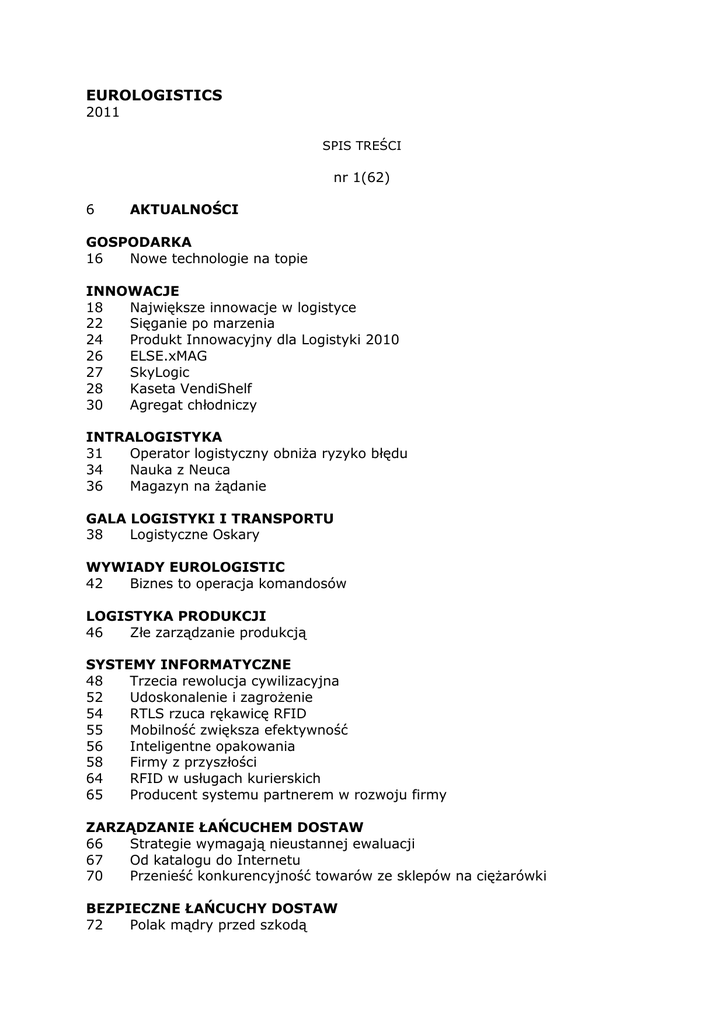 EUROLOGISTICS 2011 SPIS TREŚCI nr 1(62) 6 AKTUALNOŚCI GOSPODARKA 16 Nowe technologie na topie INNOWACJE 18 Największe innowacje w logistyce 22 Sięganie po marzenia 24 Produkt Innowacyjny dla Logistyki 2010 26 ELSE.xMAG 27 SkyLogic 28 Kaseta VendiShelf 30 Agregat chłodniczy INTRALOGISTYKA 31 Operator logistyczny obniŜa ryzyko błędu 34 Nauka z Neuca 36 Magazyn na Ŝądanie GALA LOGISTYKI I TRANSPORTU 38 Logistyczne Oskary WYWIADY EUROLOGISTIC 42 Biznes to operacja komandosów LOGISTYKA PRODUKCJI 46 Złe zarządzanie produkcją SYSTEMY INFORMATYCZNE 48 Trzecia rewolucja cywilizacyjna 52 Udoskonalenie i zagroŜenie 54 RTLS rzuca rękawicę RFID 55 Mobilność zwiększa efektywność 56 Inteligentne opakowania 58 Firmy z przyszłości 64 RFID w usługach kurierskich 65 Producent systemu partnerem w rozwoju firmy ZARZĄDZANIE ŁAŃCUCHEM DOSTAW 66 Strategie wymagają nieustannej ewaluacji 67 Od katalogu do Internetu 70 Przenieść konkurencyjność towarów ze sklepów na cięŜarówki BEZPIECZNE ŁAŃCUCHY DOSTAW 72 Polak mądry przed szkodą UBEZPIECZENIA 74 Znikające cięŜarówki 76 Ryzyko kosztuje 78 Jaka konstrukcja magazynu - takie ubezpieczenie TRANSPORT 80 Partnerstwo konkurentów 82 Potencjał transportu kombinowanego 83 Powrót na rzeki 85 Centra logistyczne nad Bałtykiem 86 Ostatni wolny port znika z mapy Europy 86 Odprawa celna w porcie Hamburg 87 Gdzie odprawiać towary? POWIERZCHNIE MAGAZYNOWE 88 Więcej znaczy efektywniej REKOMENDOWANE PRAKTYKI 89 Polacy nie gęsi, swój język mają POSTACIE LOGISTYKI 90 Skok na głęboką wodę nr 2(63) 6 AKTUALNOŚCI GOSPODARKA 16 Kooperencja nakręca rozwój ZARZĄDZANIE ŁAŃCUCHEM DOSTAW 18 Kierunek - stabilizacja 22 Kultura organizacji 25 Logistyka dla sieci 26 Partyzanci transformacji 29 Niekończąca się rewolucja 32 Zerwanie umowy 34 W kierunku doskonałości 36 Automatyzacja w przemysle odzieŜowym 38 Zrozumieć potrzeby klientów 40 Gra o lojalność SYSTEMY INFORMATYCZNE 45 IT na usługach logistyki 50 Innowacje cyfrowego świata 53 Data center dla kaŜdej firmy 54 Budowa mądrzejszego świata 56 Wyciekające dane 58 Informacje na wyciągnięcie ręki 61 Mobilność - klucz do sukcesu w logistyce WYWIADY EUROLOGISTIC 62 Myślenie procesowe ZAKUPY 65 Pułapki systemów motywacyjnych 66 Motywacja do lepszych zakupów LOGISTYKA PRODUKCJI 68 System Produkcji Ludzi Myślących 70 Uczymy się z najlepszymi 72 Zanim gazeta trafi do czytelnika 74 Ster w rękach szefa TRANSPORT 76 Zwiększona mobilność 77 Szkody w transporcie towarów 80 Przetarg poza szarą strefą 82 Siedem grzechów głównych PKP 84 Chińczycy na kolei 85 Podwójny skok przewozów 90 Wzrost przeładunków BEZPIECZNE ŁAŃCUCHY DOSTAW 92 Ochrona ładunków 94 Zbyt modna kradzieŜ SPORT 95 Slalom logistyków HUMAN RESOURCES 96 Rynek kandydata POWIERZCHNIE MAGAZYNOWE 98 Spadek pustostanów RELACJE 100 W dąŜeniu do świata bez tarć 102 Wiedza na trudne czasy POSTACIE LOGISTYKI 103 Lubię wiedzieć REFLEKTOR 104 Przeszczepienie chińskich innowacji nr 3(64) 6 AKTUALNOŚCI WYDARZENIA 16 Innowacyjność wyznacznikiem konkurencyjności GOSPODARKA 18 Generatory innowacji ZARZĄDZANIE ŁAŃCUCHEM DOSTAW 22 Gra w firmie 24 Tort e-commerce dla kurierów 30 Internetowe delikatesy 32 Amazon 34 Farmacja wymaga specjalizacji 38 Efektywne przetargi IT WYWIADY "EUROLOGISTICS” 40 Przyczółkiem była Polska SYSTEMY INFORMATYCZNE 42 Przesyłki z chmury 44 Smartbox 46 Inwestycje w oszczędność 48 Światłowody zmieniają świat 50 Standardy elektronicznej wymiany dokumentów 52 Mobilność kluczem do sukcesu INTRALOGISTYKA 54 Innowacje dla intralogistyka 56 Widłak na wynajem LOGISTYKA PRODUKCJI 58 Skarb ukryty w skałach 61 Szklana fabryka TRANSPORT 64 Hamburg Europy Wschodniej 66 e-myto RELACJE 68 Liczy się wartość intelektualna 70 Tryptyk polskiej logistyki 71 Lean zaczyna się od przywódcy 72 Strategiczna rola liderów POSTACIE LOGISTYKI 75 Dyscyplina zespołowa TOP 500 74 Mocne podstawy logistycznego biznesu REFLEKTOR 96 „MY" i „ONI" nr 4(65) 6 AKTUALNOŚCI GOSPODARKA 20 W ogonie świata 22 Między młotem a kowadłem 28 Smart Logistics 29 Stały monitoring firmy 30 OPEK celuje w e-commerce 31 Kupno wózka to nie wyliczanka 33 Wszechstronna kostka 34 NajdroŜszy jest operator 36 Stawiamy na szybkość działania 38 PrzewoŜenie cieczy 40 Liczy się rozwiązanie - nie system BEZPIECZNE ŁAŃCUCHY DOSTAW 42 Zdrowe i bezpieczne miejsca pracy WYWIADY "EUROLOGISTICS" 44 Prawo wynalazcy OUTSOURCING 46 Outsourcing w odwrocie ZARZĄDZANIE ŁAŃCUCHEM DOSTAW 50 Efektywne zarządzanie budynkiem 52 Nieustanne innowacje 54 Zrozumieć rozwiązanie LOGISTYKA PRODUKCJI 56 Sprzedawca bohaterem 57 NajwaŜniejsi są ludzie SYSTEMY INFORMATYCZNE 58 RFID a ślad węglowy 60 Rewolucja internetowa w Polsce. TRANSPORT 62 Zielone samochody 65 Narzędzia do zarządzania podwykonawcami 66 Planer podróŜy 68 Daleka droga 72 Euroobligacje na drogi 75 Drogi niczyje 76 E-myto po kilku miesiącach 78 Wrota do Stanów Zjednoczonych 80 Wokół myta HUMAN RESOURCES 81 Niedobór talentów 82 Elastyczny logistyk SPORT 83 Transport pod Ŝaglami. POWIERZCHNIE MAGAZYNOWE 84 Prym wiodą biura POSTACIE LOGISTYKI 85 Dostawca rozwiązań. REFLEKTOR 86 Dwanaście sekund do wiedzy nr 5(66) 6 AKTUALNOŚCI GOSPODARKA 18 Koniunktura w regionie ZARZĄDZANIE ŁAŃCUCHEM DOSTAW 20 Globalizacja wyzwaniem dla logistyki 22 Lean jest podróŜą 24 Łączenie transportów drobnicowych z całopojazdowymi 25 Wszystko pod kontrolą INTRALOGISTYKA 26 Dotowana automatyka 29 Zarządzanie paletami w firmie 30 Palety pod lupą 32 Kryształowa kula magazynu SYSTEMY INFORMATYCZNE 34 Logistyka jest nadrzędna 37 Kable, automatyka i … WMS 38 Wszystko dla klienta 39 Precyzyjna kompletacja 40 Kierowca z terminalem WYWIADY „EUROLOGISTICS” 42 Odwaga bycia pionierem LOGISTYKA PRODUKCJI 44 Ujarzmić kluczowe decyzje 46 Ultranowoczesna fabryka TRANSPORT 49 Okiełznać viaTOLL 50 CięŜarówki na wagi 52 Oferta dla kaŜdego 5