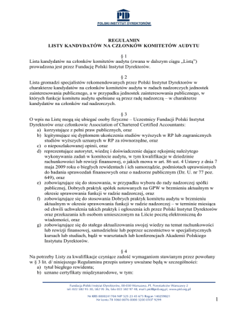 REGULAMIN LISTY KANDYDATÓW NA CZŁONKÓW KOMITETÓW AUDYTU §1 Lista kandydatów na członków komitetów audytu (zwana w dalszym ciągu „Listą”) prowadzona jest przez Fundację Polski Instytut Dyrektorów. §2 Lista gromadzi specjalistów rekomendowanych przez Polski Instytut Dyrektorów w charakterze kandydatów na członków komitetów audytu w radach nadzorczych jednostek zainteresowania publicznego, a w przypadku jednostek zainteresowania publicznego, w których funkcje komitetu audytu spełniane są przez radę nadzorczą – w charakterze kandydatów na członków rad nadzorczych. §3 O wpis na Listę mogą się ubiegać osoby fizyczne – Uczestnicy Fundacji Polski Instytut Dyrektorów oraz członkowie Association of Chartered Certified Accountants: a) korzystające z pełni praw publicznych, oraz b) legitymujące się dyplomem ukończenia studiów wyższych w RP lub zagranicznych studiów wyższych uznanych w RP za równorzędne, oraz c) o nieposzlakowanej opinii, oraz d) reprezentujące autorytet, wiedzę i doświadczenie dające rękojmię należytego wykonywania zadań w komitecie audytu, w tym kwalifikacje w dziedzinie rachunkowości lub rewizji finansowej, o jakich mowa w art. 86 ust. 4 Ustawy z dnia 7 maja 2009 roku o biegłych rewidentach i ich samorządzie, podmiotach uprawnionych do badania sprawozdań finansowych oraz o nadzorze publicznym (Dz. U. nr 77 poz. 649), oraz e) zobowiązujące się do stosowania, w przypadku wyboru do rady nadzorczej spółki publicznej, Dobrych praktyk spółek notowanych na GPW w brzmieniu aktualnym w okresie sprawowania funkcji w radzie nadzorczej, oraz f) zobowiązujące się do stosowania Dobrych praktyk komitetu audytu w brzmieniu aktualnym w okresie sprawowania funkcji w radzie nadzorczej – w terminie miesiąca od chwili uchwalenia takich praktyk i ogłoszenia ich przez Polski Instytut Dyrektorów oraz przekazania ich osobom umieszczonym na Liście pocztą elektroniczną do wiadomości, oraz g) zobowiązujące się do stałego aktualizowania swojej wiedzy na temat rachunkowości lub rewizji finansowej, samodzielnie lub poprzez uczestnictwo w specjalistycznych kursach lub studiach, bądź w warsztatach lub konferencjach Akademii Polskiego Instytutu Dyrektorów. §4 Na potrzeby Listy za kwalifikacje czyniące zadość wymaganiom stawianym przez powołany w § 3 lit. d/ niniejszego Regulaminu przepis ustawy uważane będą w szczególności: a) tytuł biegłego rewidenta; b) uznane certyfikaty międzynarodowe, w tym: 1 ACCA (kwalifikacje nadawane przez Association of Chartered Certified Accountants i afiliacje); CGPA (kwalifikacje Certified Government Auditing Professional, nadawane przez The Institute of Internal Auditors i afiliacje); CFA (kwalifikacje Chartered Financial Analyst, nadawane przez CFA Institute i afiliacje); CFE (kwalifikacje Certified Fraud Examiner, nadawane przez Association of Certified Fraud Examiners i afiliacje); CFSA (kwalifikacje Certfied Financial Services Auditor, nadawane przez The Institute of Internal Auditors i afiliacje); CGAP (kwalifikacje Certfied Government Auditing Professional, nadawane przez The Institute of Internal Auditors i afiliacje); CIA (kwalifikacje Certified Internal Auditor, nadawane przez The Institute of Internal Auditors i afiliacje); CIMA (kwalifikacje nadawane przez The Chartered Institute of Management Accountants i afiliacje); CMA (kwalifikacje Certified Management Accountant, nadawane przez The Institute of Management Accountants i afiliacje); CPA (kwalifikacje Certified Public Accountant, nadawane przez American Institute of Certified Accountants); c) dyplom wyższej uczelni w zakresie rachunkowości, tytuł naukowy z tej dyscypliny, ukończenie podyplomowych studiów w zakresie rachunkowości lub rewizji finansowej, udokumentowanie odbycia wielogodzinnych specjalistycznych kursów z zakresu rachunkowości, międzynarodowych standardów rachunkowości, międzynarodowych standardów sprawozdawczości finansowej; d) szczególne doświadczenia i osiągnięcia w komitetach audytu rad nadzorczych lub na stanowisku dyrektora finansowego w spółkach notowanych na GPW. Ewentualne wątpliwości w kwestii kwalifikacji dających miejsce na Liście rozstrzyga ostatecznie Zespół Kwalifikacyjny, o którym mowa w § 9 niniejszego Regulaminu. §5 Osoby ubiegające się o wpis na Listę przedkładają Polskiemu Instytutowi Dyrektorów pobrany ze strony http://www.pid.org.pl lub ze strony http://poland.accaglobal.com formularz zgłoszeniowy wraz z kopiami dokumentów poświadczających kwalifikacje, oraz wnoszą na konto PID opłatę administracyjną w kwocie 500,00 (pięćset) zł. §6 Utrata statusu Uczestnika Polskiego Instytutu Dyrektorów bądź członkostwa Association of Chartered Certified Accountants powoduje skreślenie z Listy. W innych uzasadnionych okolicznościami przypadkach decyzję o skreśleniu z Listy może podjąć ostatecznie Zespół Kwalifikacyjny, o którym mowa w § 9 niniejszego Regulaminu. §7 Imiona i nazwiska wraz ze wskazaniem miejscowości stałego pobytu lub wykonywania zawodu oraz kwalifikacji zawodowych i adresów poczty elektronicznej osób umieszczonych 2 na Liście będą powszechnie dostępne na stronie internetowej Polskiego Instytutu Dyrektorów (www.pid.org.pl). §8 Jednostki zainteresowania publicznego mogą kontaktować się bezpośrednio, pocztą elektroniczną, z osobami umieszczonymi na Liście, nie ponosząc żadnych opłat z tytułu korzystania z Listy. §9 O wpisie na Listę decyduje ostatecznie, zwykłą większością głosów w obecności co najmniej 3 członków, powoływany przez Zarząd Polskiego Instytutu Dyrektorów pięcioosobowy Zespół Kwalifikacyjny, złożony z przedstawiciela Polskiego Instytutu Dyrektorów jako przewodniczącego, przedstawiciela Association of Chartered Certified Accountants (ACCA Polska) oraz przedstawicieli środowisk akademickich i praktyków rachunkowości i rewizji finansowej. Zespół rozstrzyga takż