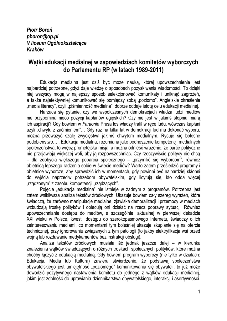 Piotr Boroń [email protected] V liceum Ogólnokształcące Kraków Wątki edukacji medialnej w zapowiedziach komitetów wyborczych do Parlamentu RP (w latach 1989-2011) Edukacja medialna jest dziś być może nauką, której upowszechnienie jest najbardziej potrzebne, gdyż daje wiedzę o sposobach pozyskiwania wiadomości. To dzięki niej wszyscy mogą w najlepszy sposób selekcjonować komunikaty i uniknąć zagrożeń, a także najefektywniej komunikować się pomiędzy sobą „poziomo”. Angielskie określenie „media literacy”, czyli „piśmienność medialna”, dobrze oddaje istotę celu edukacji medialnej. Narzuca się pytanie, czy we współczesnych demokracjach władza ludzi mediów nie przypomina nieco pozycji kapłanów egipskich? Czy nie jest w jakimś stopniu miarą ich aspiracji? Gdy bowiem w Faraonie Prusa los władzy trafił w ręce ludu, wówczas kapłani użyli „chwytu z zaćmieniem”… Gdy raz na kilka lat w demokracji lud ma dokonać wyboru, można przeważyć szalę zwycięstwa jakimś chwytem medialnym. Rysuje się bolesne podobieństwo… . Edukacja medialna, rozumiana jako podnoszenie kompetencji medialnych społeczeństwa, to wręcz prometejska misja, a można odnieść wrażenie, że partie polityczne nie przejawiają większej woli, aby ją rozpowszechniać. Czy rzeczywiście politycy nie chcą – dla zdobycia większego poparcia społecznego – „przymilić się wyborcom”, również obietnicą lepszego radzenia sobie w świecie mediów? Warto zatem prześledzić programy i obietnice wyborcze, aby sprawdzić ich w momentach, gdy powinni być najbardziej skłonni do wyjścia naprzeciw potrzebom obywatelskim, gdy licytują się, kto odda więcej „rządzonym” z zasobu kompetencji „rządzących”. Pojęcie „edukacja medialna” nie istnieje w żadnym z programów. Potrzebna jest zatem wnikliwsza analiza tekstów źródłowych. Ukazuje bowiem cały szereg wyrażeń, które świadczą, że zarówno manipulacje medialne, zjawiska demoralizacji i przemocy w mediach wzbudzają troskę polityków i obiecują oni działać na rzecz poprawy sytuacji. Również upowszechnianie dostępu do mediów, a szczególnie, aktualnej w pierwszej dekadzie XXI wieku w Polsce, kwestii dostępu do szerokopasmowego Internetu, świadczy o ich zainteresowaniu mediami, co momentami tym boleśniej ukazuje skupianie się na ofercie technicznej, przy ignorowaniu związanych z tym patologii (to jakby elektryfikacja wsi przed wojną lub rozdawanie medykamentów bez instrukcji obsługi). Analiza tekstów źródłowych musiała iść jednak jeszcze dalej – w kierunku znalezienia wątków świadczących o różnych troskach społecznych polityków, które można choćby łączyć z edukacją medialną. Gdy bowiem program wyborczy (nie tylko w działach: Edukacja, Media lub Kultura) zawiera stwierdzenie, że podstawą społeczeństwa obywatelskiego jest umiejętność „poziomego” komunikowania się obywateli, to już może dowodzić pozytywnego nastawienia komitetu do jednego z wątków edukacji medialnej, jakim jest zdolność do uprawiania dziennikarstwa obywatelskiego, interakcji i asertywności. 1 Jeżeli tak zagłębimy się w treści kampanii wyborczych, to okazuje się, że w różnych środowiskach politycznych istnieje niezły grunt dla zainteresowania edukacją medialną. Cały okres 1989-2011 nie może być traktowany jako stan jednakowy dla edukacji medialnej. Uwzględnić bowiem należy, że programy wyborcze budowane są zawsze na bazie aktualnych potrzeb. Gdy chodzi o badane zjawisko, to należy rozpatrywać treści kampanii dodatkowo na tle rozwoju edukacji medialnej w Polsce i na świecie. Bowiem, co prawda, w najlepiej rozwiniętych państwach edukacja medialna przebiła się do świadomości już pół wieku temu, ale w Polsce zyskała rozgłos dopiero pod koniec lat dziewięćdziesiątych, co może usprawiedliwiać polityków. Z drugiej strony, gdy edukacja medialna funkcjonowała już jako ścieżka międzyprzedmiotowa w programach Ministerstwa Edukacji Narodowej i w działalności Krajowej Rady Radiofonii i Telewizji, a nawet stała się ważnym polem zainteresowania Komisji Europejskiej, która zleciła państwom członkowskim Unii Europejskiej składanie sprawozdań z dokonań na tym polu, to możemy mówić wręcz o złej woli partii politycznych, które ignorując etos prometejski, preferują etos Herhora. Warto też odnotować pewne fakty, które świadczą o tym, że same komitety doceniały media i manipulacje. Wybory do Sejmu Rzeczypospolitej Polskiej z 4 czerwca 1989 roku były w części demokratyczne. Pospieszna kampania polegała przede wszystkim na przedstawianiu się wyborcom na zasadzie: kim jesteśmy. Z licznych dokumentów przedwyborczych przebija zainteresowanie kwestiami suwerenności państwa, stosunku do socjalizmu. Rzadko który komitet odnosił się w ogóle do mediów czy edukacji. To interesujące, bo przecież władze PZPR doceniały media od zawsze, a i opozycja ruszyła do boju, dbając zarówno o dostęp do mediów publicznych, jak i zaczęła tworzyć z powodzeniem własne. Np. 8 maja 1989 ukazał się pierwszy numer „Gazety Wyborczej”, której nakład wzrósł w ciągu miesiąca do 400 tys. egzemplarzy, 2 czerwca wznowiono wydawanie „Tygodnika Solidarność”, a według krakowskiego Ośrodka Badań Prasoznawczych zaczęto wtedy wydawać 2-2,5 tys. gazetek lokalnych komitetów obywatelskich [Piasecki, 2003, s. 17]. Na tym tle jasno przedstawiał się nowocześnie skonstruowany program Komitetu Obywatelskiego „Solidarność”. Zawierał też bezpośredni zwrot: Pełny dostęp do wszechstronnej informacji, do publicznego wyrażania swoich poglądów jest prawem każdego obywatela. Będziemy dążyć do zniesienia cenzury i do zniesienia monopolu państwa na emisję radiową i telewizyjną [Programy…, 1995, s. 56]. We wrześniu 1990 r. tzw. sejm kontraktowy podjął decyzję o skróceniu kadencji. „Drużyna 