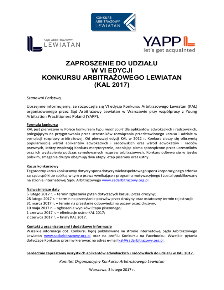 ZAPROSZENIE DO UDZIAŁU W VI EDYCJI KONKURSU ARBITRAŻOWEGO LEWIATAN (KAL 2017) Szanowni Państwo, Uprzejmie informujemy, że rozpoczęła się VI edycja Konkursu Arbitrażowego Lewiatan (KAL) organizowanego przez Sąd Arbitrażowy Lewiatan w Warszawie przy współpracy z Young Arbitration Practitioners Poland (YAPP). Formuła konkursu KAL jest pierwszym w Polsce konkursem typu moot court dla aplikantów adwokackich i radcowskich, polegającym na przygotowaniu przez uczestników rozwiązania przedstawionego kazusu i udziale w symulacji rozprawy arbitrażowej. Od pierwszej edycji KAL w 2012 r. Konkurs cieszy się olbrzymią popularnością wśród aplikantów adwokackich i radcowskich oraz wśród adwokatów i radców prawnych, którzy wspierają Konkurs merytorycznie, oceniając pisma sporządzone przez uczestników oraz ich wystąpienia podczas symulowanych rozpraw arbitrażowych. Konkurs odbywa się w języku polskim, zmagania drużyn obejmują dwa etapy: etap pisemny oraz ustny. Kazus konkursowy Tegoroczny kazus konkursowy dotyczy sporu dotyczy wieloaspektowego sporu korporacyjnego członka zarządu spółki ze spółką, w tym o prawa wynikające z programu motywacyjnego i został opublikowany na stronie internetowej Sądu Arbitrażowego www.sadarbitrazowy.org.pl. Najważniejsze daty 5 lutego 2017 r. – termin zgłaszania pytań dotyczących kazusu przez drużyny; 28 lutego 2017 r. – termin na przesyłanie pozwów przez drużyny oraz ostateczny termin rejestracji; 31 marca 2017 r. – termin na przesłanie odpowiedzi na pozew przez drużyny; 10 maja 2017 r. – ogłoszenie wyników Etapu pisemnego; 1 czerwca 2017 r. – eliminacje ustne KAL 2017; 2 czerwca 2017 r. – finały KAL 2017. Kontakt z organizatorami i dodatkowe informacje Wszelkie informacje dot. Konkursu będą publikowane na stronie internetowej Sądu Arbitrażowego Lewiatan www.sadarbitrazowy.org.pl oraz na profilu Konkursu na Facebooku. Wszelkie pytania dotyczące Konkursu prosimy kierować na adres e-mail [email protected]. Serdecznie zapraszamy wszystkich aplikantów adwokackich i radcowskich do udziału w KAL 2017. Komitet Organizacyjny Konkursu Arbitrażowego Lewiatan Warszawa, 3 lutego 2017 r.