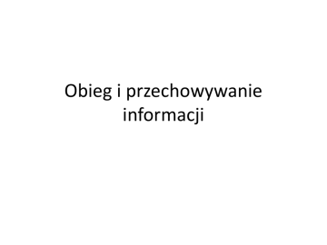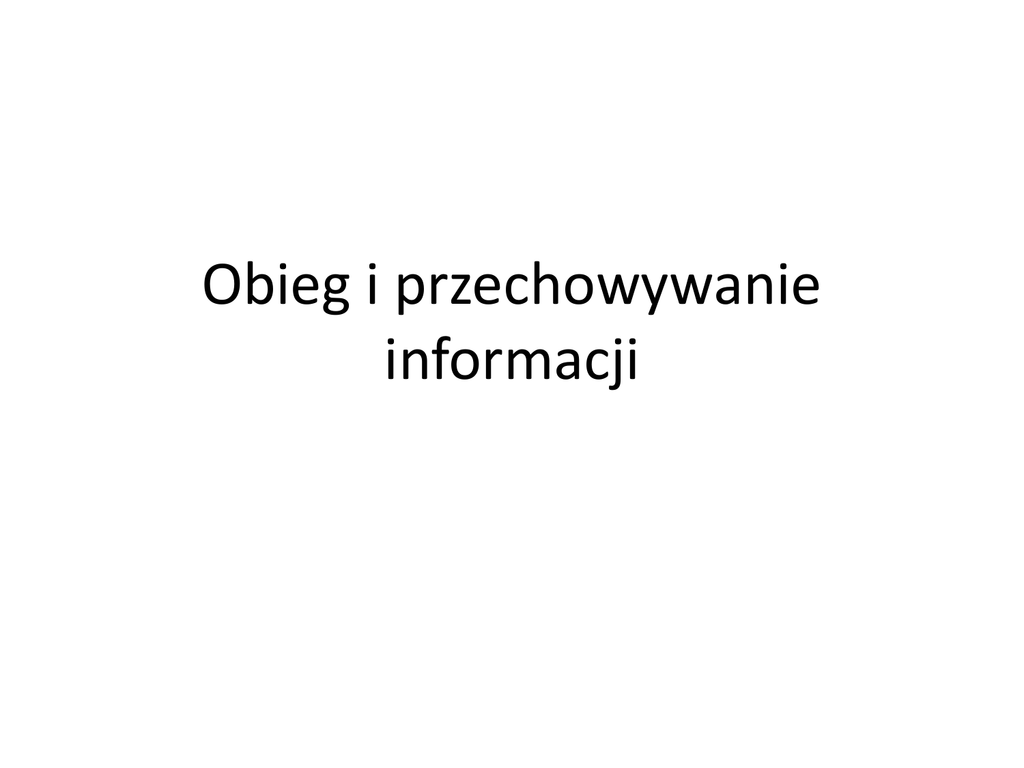 Obieg i przechowywanie informacji Obieg informacji dzielimy na następujące etapy • • • • zbieranie, segregacja, przekazywanie, archiwizacja. System zapisu pocztowego nazywany systemem kancelaryjnym został określony w zbiorze przepisów, norm, zasad ustalających i regulujących czynności biurowe Wyróżniamy trzy rodzaje systemu kancelaryjnego: • dziennikowy, • bezdziennikowy, • mieszany. SYSTEM DZIENNIKOWY • System dziennikowy nazywany jest często systemem urzędowym. Jego celem jest zabezpieczenie wszelkich dokumentów powstających w ramach przedsiębiorstwa. Polega na rejestrowaniu pism w specjalnie do tego przeznaczonym dzienniku, prowadzonym zazwyczaj przez pracowników sekretariatu lub kancelarii. Wady • pracochłonny, • czasochłonny, • ograniczony bieg dokumentów. Zalety • • • • szczegółowy, chronologiczność ułożenia, łatwość zapisu, kontrola pisma na każdym etapie obiegu dokumentu. W systemie dziennikowym wyróżniamy: • system jednodziennikowy, • system dwudziennikowy. SYSTEM BEZDZIENNIKOWY • System bezdziennikowy jest przeciwieństwem systemu dziennikowego. Odrzuca się możliwość rejestracji listów. Uwagę skupia się na sprawach załatwionych i tylko te podlegają kontroli. Wady • brak rejestracji, daty przyjęcia i wyjścia pisma, • nieobecność referenta wstrzymuje obieg dokumentów, • większe prawdopodobieństwo zagubienia dokumentów. Zalety • • • • • szybki obieg pisma, mało pracochłonny, rejestracja sprawy, odpowiedzialność za właściwe funkcjonowanie ponosi jeden pracownik. Segregacja polega na klasyfikacji zdobytych informacji pod względem ich ważności, podobieństw i różnicowaniu ich na działy. Funkcjonujący w przedsiębiorstwach system klasyfikacji zależy od rodzą’, przedsiębiorstwa i indywidualnego wyboru. • Klasyfikacja alfabetyczna • Klasyfikacja rzeczowa • Klasyfikacja geograficzna • Klasyfikacja chronologiczna • W procesie przekazywania informacji wykorzystuje się środki komunikacji masowej, tj. Internet, faks, telefon, telegram, poczta. Osoba przekazująca informacje powinna skupić się na przekazywaniu odbiorcom tylko najważniejszych informacji w formie zwięzłej, treściwej i jasnej dla adresata. Archiwizacja jest ostatecznym etapem w procesie obiegu informacji. Dokumenty przeznaczone do archiwizacji dzielimy na: • dokumenty spraw ostatecznie załatwionych, • dokumenty spraw bieżących. • Dokumenty są przechowywane zgodnie z klasyfikacją pod względem czasu i rodzaju dokumentu. Przyjęto dwa typy oznakowania dokumentów archiwalnych: kategoria A i B • Kategoria A obejmuje akta o znaczeniu historycznym. Nazywane są one także aktami trwałymi, gdyż nie wolno ich zniszczyć lub zaniechać ich archiwizacji. • Kategoria B zajmuje się aktami o określonej wartości czasowej. W oznakowaniu w indeksie dolnym zapisana jest cyframi arabskimi liczba oznaczająca czas przechowywania, np. B5, B10.