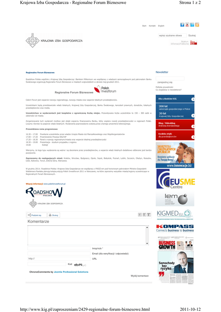 Krajowa Izba Gospodarcza - Regionalne Forum Biznesowe Strona 1 z 2 Start Kontakt English wpisz szukane słowa Szukaj Newsletter Regionalne Forum Biznesowe Roadshow Polska wspólnie z Krajową Izbą Gospodarczą i Bankiem Millennium we współpracy z władzami samorządowymi pod patronatem Banku Światowego organizują Regionalne Forum Biznesowe w miastach wojewódzkich w okresie maj-grudzień 2011. zarejestruj się Polityka prywatności Co znajdziesz w newsletterze? Regionalne Forum Biznesowe Celem Forum jest wsparcie rozwoju regionalnego, rozwoju miasta oraz wsparcie lokalnych przedsiębiorców. Uczestnikami będą przedstawiciele władz lokalnych, Krajowej Izby Gospodarczej, Banku Światowego, kancelarii prawnych, doradców, lokalnych przedsiębiorców oraz media. Uczestnictwo w wydarzeniach jest bezpłatne z ograniczoną liczbą miejsc. Przewidywana liczba uczestników to 150 – 300 osób w zależności od miasta. Zorganizowanie tych wydarzeń możliwe jest dzięki wsparciu finansowemu Banku, który wspiera rozwój przedsiębiorczości w regionach Polski. Liczymy również na poparcie władz lokalnych. Wydarzenia poprowadzone zostaną przez znanego prezentera telewizyjnego. Przewidziana rama programowa: 16.30 17.00 17.20 18.30 19.00 – 17.00 – 17.20 – 18.30 – 19.00 Powitanie uczestników przez władze Urzędu Miasta lub Marszałkowskiego oraz Współorganizatorów Przemówienie Prezesa KIG/VIP Panel o rozwoju regionalnym/miasta oraz wsparcie lokalnej przedsiębiorczości Prezentacja - studium przypadku z regionu Koktajl Wierzymy, że tego typu wydarzenia są ważne i są doceniane przez przedsiębiorców, a wsparcie władz lokalnych dodatkowo odbierane jest bardzo pozytywnie. Zapraszamy do następujących miast: Kraków, Wrocław, Bydgoszcz, Opole, Sopot, Białystok, Poznań, Lublin, Szczecin, Olsztyn, Rzeszów, Łódź, Katowice, Toruń, Zielona Góra, Warszawa. W grudniu 2011r. Roadshow Polska i Krajowa Izba Gospodarcza we współpracy z PAIiIZ-em pod honorowym patronatem Ministra Gospodarki Waldemara Pawlaka planują kolejną edycję Polish Investforum 2011 w Warszawie, na które zaprosimy wszystkie miasta/regiony uczestniczące w Regionalnych Forach Biznesowych. Więcej informacji www.polishinvestforum.pl Podziel się Drukuj Komentarze Imię/nick * Email (dla weryfikacji i odpowiedzi) http:// URL Kod ChronoComments by Joomla Professional Solutions Wyślij komentarz http://www.kig.pl/zaproszeniam/2429-regionalne-forum-biznesowe.html 2011-10-12 Krajowa Izba Gospodarcza - Regionalne Forum Biznesowe Strona 2 z 2 Krajowa Izba Gospodarcza 00-074 Warszawa, ul. Trębacka 4 tel: (48) 22 630 96 00 fax: (48) 22 827 46 73 więcej więcej Partnerzy medialni: Copyright © 2010 KIG | Realizacja: KIG http://www.kig.pl/zaproszeniam/2429-regionalne-forum-biznesowe.html 2011-10-12