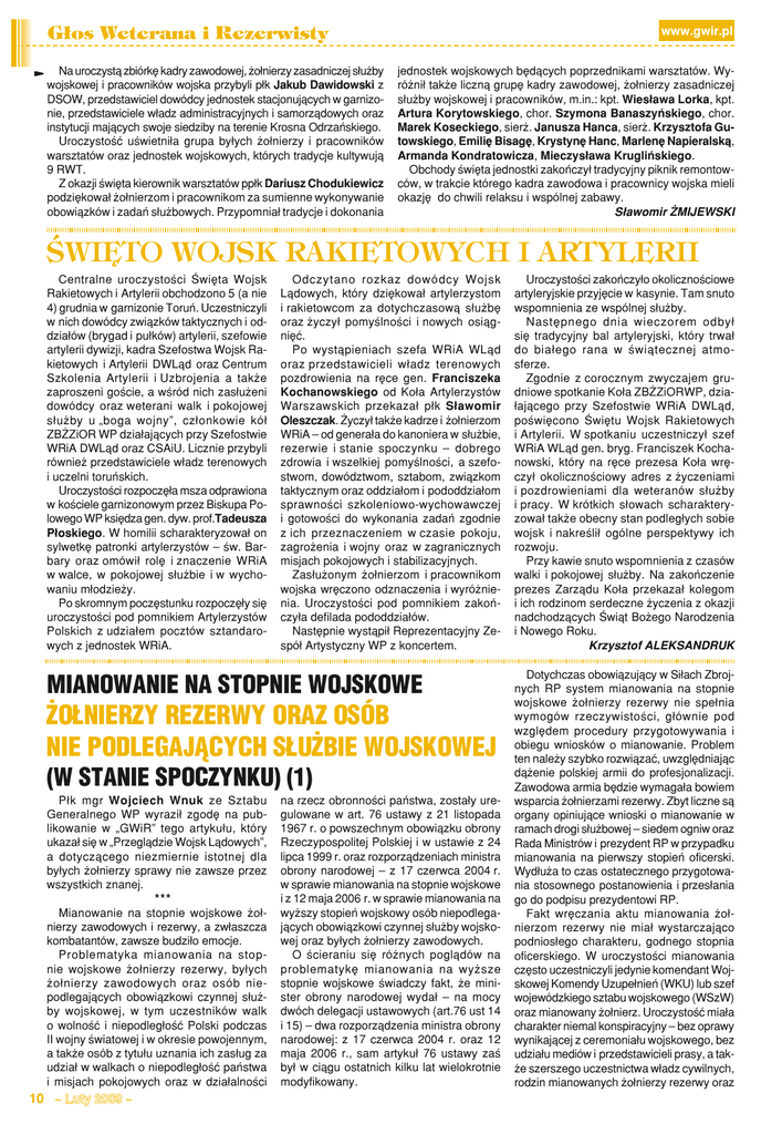 G³os Weterana i Rezerwisty Na uroczystą zbiórkę kadry zawodowej, żołnierzy zasadniczej służby wojskowej i pracowników wojska przybyli płk Jakub Dawidowski z DSOW, przedstawiciel dowódcy jednostek stacjonujących w garnizonie, przedstawiciele władz administracyjnych i samorządowych oraz instytucji mających swoje siedziby na terenie Krosna Odrzańskiego. Uroczystość uświetniła grupa byłych żołnierzy i pracowników warsztatów oraz jednostek wojskowych, których tradycje kultywują 9 RWT. Z okazji święta kierownik warsztatów ppłk Dariusz Chodukiewicz podziękował żołnierzom i pracownikom za sumienne wykonywanie obowiązków i zadań służbowych. Przypomniał tradycje i dokonania www.gwir.pl jednostek wojskowych będących poprzednikami warsztatów. Wyróżnił także liczną grupę kadry zawodowej, żołnierzy zasadniczej służby wojskowej i pracowników, m.in.: kpt. Wiesława Lorka, kpt. Artura Korytowskiego, chor. Szymona Banaszyńskiego, chor. Marek Koseckiego, sierż. Janusza Hanca, sierż. Krzysztofa Gutowskiego, Emilię Bisagę, Krystynę Hanc, Marlenę Napieralską, Armanda Kondratowicza, Mieczysława Kruglińskiego. Obchody święta jednostki zakończył tradycyjny piknik remontowców, w trakcie którego kadra zawodowa i pracownicy wojska mieli okazję do chwili relaksu i wspólnej zabawy. Sławomir ŻMIJEWSKI Święto Wojsk Rakietowych i Artylerii Centralne uroczystości Święta Wojsk Rakietowych i Artylerii obchodzono 5 (a nie 4) grudnia w garnizonie Toruń. Uczestniczyli w nich dowódcy związków taktycznych i oddziałów (brygad i pułków) artylerii, szefowie artylerii dywizji, kadra Szefostwa Wojsk Rakietowych i Artylerii DWLąd oraz Centrum Szkolenia Artylerii i Uzbrojenia a także zaproszeni goście, a wśród nich zasłużeni dowódcy oraz weterani walk i pokojowej służby u „boga wojny”, członkowie kół ZBŻZiOR WP działających przy Szefostwie WRiA DWLąd oraz CSAiU. Licznie przybyli również przedstawiciele władz terenowych i uczelni toruńskich. Uroczystości rozpoczęła msza odprawiona w kościele garnizonowym przez Biskupa Polowego WP księdza gen. dyw. prof.Tadeusza Płoskiego. W homilii scharakteryzował on sylwetkę patronki artylerzystów – św. Barbary oraz omówił rolę i znaczenie WRiA w walce, w pokojowej służbie i w wychowaniu młodzieży. Po skromnym poczęstunku rozpoczęły się uroczystości pod pomnikiem Artylerzystów Polskich z udziałem pocztów sztandarowych z jednostek WRiA. Odczytano rozkaz dowódcy Wojsk Lądowych, który dziękował artylerzystom i rakietowcom za dotychczasową służbę oraz życzył pomyślności i nowych osiągnięć. Po wystąpieniach szefa WRiA WLąd oraz przedstawicieli władz terenowych pozdrowienia na ręce gen. Franciszeka Kochanowskiego od Koła Artylerzystów Warszawskich przekazał płk Sławomir Oleszczak. Życzył także kadrze i żołnierzom WRiA – od generała do kanoniera w służbie, rezerwie i stanie spoczynku – dobrego zdrowia i wszelkiej pomyślności, a szefostwom, dowództwom, sztabom, związkom taktycznym oraz oddziałom i pododdziałom sprawności szkoleniowo-wychowawczej i gotowości do wykonania zadań zgodnie z ich przeznaczeniem w czasie pokoju, zagrożenia i wojny oraz w zagranicznych misjach pokojowych i stabilizacyjnych. Zasłużonym żołnierzom i pracownikom wojska wręczono odznaczenia i wyróżnienia. Uroczystości pod pomnikiem zakończyła defilada pododdziałów. Następnie wystąpił Reprezentacyjny Zespół Artystyczny WP z koncertem. Mianowanie na stopnie wojskowe żołnierzy rezerwy oraz osób nie podlegających służbie wojskowej (w stanie spoczynku) (1) Płk mgr Wojciech Wnuk ze Sztabu Generalnego WP wyraził zgodę na publikowanie w „GWiR” tego artykułu, który ukazał się w „Przeglądzie Wojsk Lądowych”, a dotyczącego niezmiernie istotnej dla byłych żołnierzy sprawy nie zawsze przez wszystkich znanej. *** Mianowanie na stopnie wojskowe żołnierzy zawodowych i rezerwy, a zwłaszcza kombatantów, zawsze budziło emocje. Problematyka mianowania na stopnie wojskowe żołnierzy rezerwy, byłych żołnierzy zawodowych oraz osób niepodlegających obowiązkowi czynnej służby wojskowej, w tym uczestników walk o wolność i niepodległość Polski podczas II wojny światowej i w okresie powojennym, a także osób z tytułu uznania ich zasług za udział w walkach o niepodległość państwa i misjach pokojowych oraz w działalności 10 ~ Luty 2009 ~ na rzecz obronności państwa, zostały uregulowane w art. 76 ustawy z 21 listopada 1967 r. o powszechnym obowiązku obrony Rzeczypospolitej Polskiej i w ustawie z 24 lipca 1999 r. oraz rozporządzeniach ministra obrony narodowej – z 17 czerwca 2004 r. w sprawie mianowania na stopnie wojskowe i z 12 maja 2006 r. w sprawie mianowania na wyższy stopień wojskowy osób niepodlegających obowiązkowi czynnej służby wojskowej oraz byłych żołnierzy zawodowych. O ścieraniu się różnych poglądów na problematykę mianowania na wyższe stopnie wojskowe świadczy fakt, że minister obrony narodowej wydał – na mocy dwóch delegacji ustawowych (art.76 ust 14 i 15) – dwa rozporządzenia ministra obrony narodowej: z 17 czerwca 2004 r. oraz 12 maja 2006 r., sam artykuł 76 ustawy zaś był w ciągu ostatnich kilku lat wielokrotnie modyfikowany. Uroczystości zakończyło okolicznościowe artyleryjskie przyjęcie w kasynie. Tam snuto wspomnienia ze wspólnej służby. Następnego dnia wieczorem odbył się tradycyjny bal artyleryjski, który trwał do białego rana w świątecznej atmosferze. Zgodnie z corocznym zwyczajem grudniowe spotkanie Koła ZBŻZiORWP, działającego przy Szefostwie WRiA DWLąd, poświęcono Świętu Wojsk Rakietowych i Artylerii. W spotkaniu uczestniczył szef WRiA WLąd gen. bryg. Franciszek Kochanowski, który na ręce prezesa Koła wręczył okolicznościowy adres z życzeniami i pozdrowieniami dla weteranów służby i pracy. W krótkich słowach 