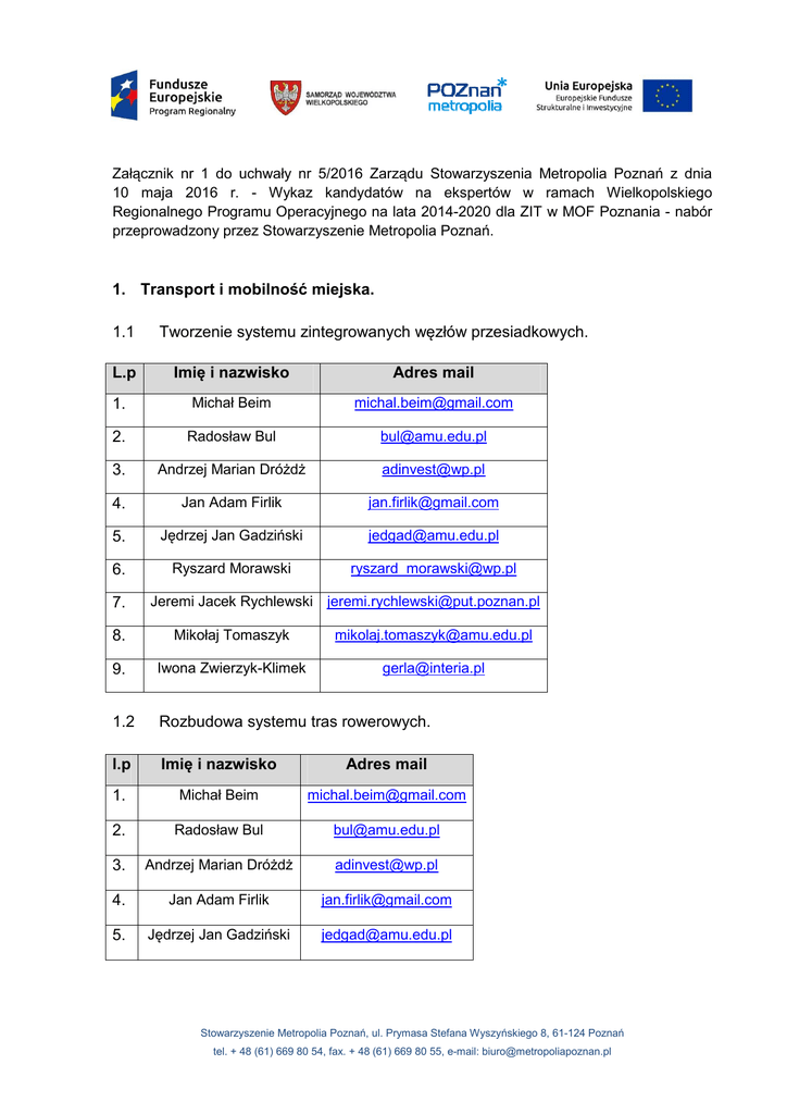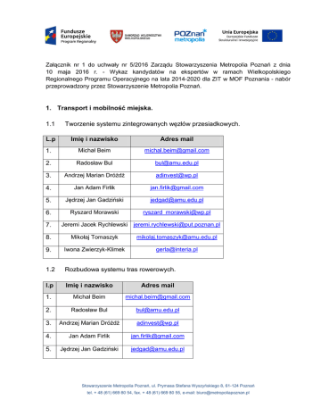 Załącznik nr 1 do uchwały nr 5/2016 Zarządu Stowarzyszenia Metropolia Poznań z dnia 10 maja 2016 r. - Wykaz kandydatów na ekspertów w ramach Wielkopolskiego Regionalnego Programu Operacyjnego na lata 2014-2020 dla ZIT w MOF Poznania - nabór przeprowadzony przez Stowarzyszenie Metropolia Poznań. 1. Transport i mobilność miejska. 1.1 L.p Tworzenie systemu zintegrowanych węzłów przesiadkowych. Imię i nazwisko Adres mail 1. Michał Beim [email protected] 2. Radosław Bul [email protected] 3. Andrzej Marian Dróżdż [email protected] 4. Jan Adam Firlik [email protected] 5. Jędrzej Jan Gadziński [email protected] 6. Ryszard Morawski [email protected] 7. Jeremi Jacek Rychlewski [email protected] 8. Mikołaj Tomaszyk [email protected] 9. Iwona Zwierzyk-Klimek [email protected] 1.2 Rozbudowa systemu tras rowerowych. l.p Imię i nazwisko Adres mail 1. Michał Beim [email protected] 2. Radosław Bul [email protected] 3. Andrzej Marian Dróżdż [email protected] 4. Jan Adam Firlik [email protected] 5. Jędrzej Jan Gadziński [email protected] Stowarzyszenie Metropolia Poznań, ul. Prymasa Stefana Wyszyńskiego 8, 61-124 Poznań tel. + 48 (61) 669 80 54, fax. + 48 (61) 669 80 55, e-mail: [email protected] 6. Tomasz Mikołaj Kossowski [email protected] 7. Jeremi Jacek Rychlewski [email protected] 8. Iwona Zwierzyk-Klimek [email protected] 2. Efektywność energetyczna - kompleksowa termomodernizacja obiektów użyteczności publicznej. l.p Imię i nazwisko Adres mail 1. Tomasz Cisek [email protected] 2. Andrzej Marian Dróżdż [email protected] 3. Piotr Grajda [email protected] 4. Tomasz Grajda [email protected] 5. Zbigniew Bogumił Kaszycki [email protected] 6. Ireneusz Ratajczak [email protected] 7. Roman Szczygieł [email protected] 8. Kinga Agata Świtalska [email protected] 3. Dziedzictwo kulturowe - ochrona i modernizacja obiektów użyteczności publicznej stanowiących dziedzictwo kulturowe. l.p Imię i nazwisko Adres mail 1. Tomasz Cisek [email protected] 2. Renata Kodym [email protected] 3. Mikołaj Tomaszyk [email protected] 4. Edukacja. 4.1 System kształcenia ogólnego oraz jego dostosowanie do potrzeb rynku pracy. l.p Imię i nazwisko Adres mail 1. Ewa Magdalena Bednarek [email protected] 2. Anna Bera [email protected] 3. Paweł Churski [email protected] 4. Tomasz Cisek [email protected] 5. Arkadiusz Dąbrowski [email protected] 6. Marek Derski [email protected] 7. Hanna Kądziołka-Sabanty [email protected] 8. Przemysław Krawczyk [email protected] 9. Grzegorz Królczyk [email protected] 10. Jolanta Królczyk [email protected] 11. Dominik Tadeusz Kubas [email protected] 12. Natalia Barbara Marska-Dzioba [email protected] 13. Izabela Alicja Nawrolska [email protected] 14. Marcin Wiktor Nowak [email protected] 15. Artur Proć [email protected] 16. Jarosław Marcin Przybył [email protected] 17. Katarzyna Maria Rejniak [email protected] 18. Natalia Weronika Rymarczuk [email protected] 19. Bartłomiej Robert Socha [email protected] 20. Mikołaj Tomaszyk [email protected] 21. Marzena Walaszek [email protected] 22. Joanna Walentynowicz [email protected] 23. Beata Woźniak-Jęchorek [email protected] 24. Monika Katarzyna Zajkowska 25. 4.2 Hanna Zielińska [email protected] [email protected] System kształcenia zawodowego (młodzieży i dorosłych) oraz jego dostosowanie do potrzeb rynku pracy. l.p Imię i nazwisko Adres mail 1. Ewa Magdalena Bednarek [email protected] 2. Anna Bera [email protected] 3. Paweł Churski [email protected] 4. Tomasz Cisek [email protected] 5. Arkadiusz Dąbrowski [email protected] 6. Marek Derski [email protected] 7. Hanna Kądziołka-Sabanty [email protected] 8. Justyna Magdalena Kokotowska [email protected] 9. Dominik Andrzej Kozik [email protected] 10. Przemysław Krawczyk [email protected] 11. Grzegorz Królczyk [email protected] 12. Jolanta Królczyk [email protected] 13. Dominik Tadeusz Kubas [email protected] 14. Natalia Barbara Marska-Dzioba [email protected] 15. Patrycja Milecka [email protected] 16. Izabela Alicja Nawrolska [email protected] 17. Ryszard Jan Necel [email protected] 18. Marcin Wiktor Nowak [email protected] 19. Artur Proć [email protected] 20. Jarosław Marcin Przybył [email protected] 21. Katarzyna Maria Rejniak [email protected] 22. Natalia Weronika Rymarczuk [email protected] 23. Bartłomiej Robert Socha [email protected] 24. Marzena Walaszek [email protected] 25. Joanna Walentynowicz [email protected] 26. Jacek Marcin Willecki [email protected] 27. Beata Woźniak-Jęchorek [email protected] 28. Monika Katarzyna Zajkowska 29. 5. Hanna Zielińska [email protected] [email protected] Rynek pracy. 5.1 Wsparcie aktywności zawodowej pracowników poprzez działania prozdrowotne (usługi profilaktyki prozdrowotnej). l.p Imię i nazwisko Adres mail 1. Paweł Churski [email protected] 2. Tomasz Cisek [email protected] 3. Marek Derski [email protected] 4. Hanna Kądziołka-Sabanty [email protected] 5. Natalia Barbara Marska-Dzioba [email protected] 6. Izabela Alicja Nawrolska [email protected] 7. Marcin Wiktor Nowak [email protected] 8. Artur Proć [email protected] 9. Jolanta Radecka [email protected] 10. Katarzyna Maria Rejniak [email protected] 11. Bartłomiej Robert Socha [email protected] 12. Diana Szałajko [email protected] 13. Krystyna Wajda [email protected] 14. Beata Woźniak-Jęchorek [email protected] 15. Monika Katarzyna Zajkowska [email protected] 5.2 Wsparcie aktywności zawodowej osób wyłączonych z rynku pracy z powodu opieki nad małymi dziećmi (usługi opieki nad dziećmi do lat 3). l.p Imię i nazwisko Adres mail 1. Paweł Churski [email protected] 2. Tomasz Cisek [email protected] 3. Marek Derski [email protected] 4. Hanna Kądziołka-Sabanty [email protected] 5. Przemysław Krawczyk [email protected] 6. Dominik Tadeusz Kubas [email protected] 7. Natalia Barbara Marska-Dzioba [email protected] 8. Izabela Alicja Nawrolska [email protected] 9. Ryszard Jan Necel [email protected] 10. Marcin Wiktor Nowak [e
