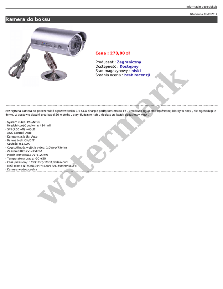 Informacje o produkcie Utworzono 07-03-2017 kamera do boksu Cena : 270,00 zł er m ar k Producent : Zagraniczny Dostępność : Dostępny Stan magazynowy : niski Średnia ocena : brak recenzji zewnętrzna kamera na podczerwień o przetworniku 1/4 CCD Sharp z podłączeniem do TV , umożliwia oglądanie np.źrebnej klaczy w nocy , nie wychodząc z domu. W zestawie złączki oraz kabel 30 metrów , przy dłuższym kablu dopłata za każdy dodatkowy metr . w at - System video: PAL/NTSC - Rozdzielczość pozioma: 420 linii - S/N (AGC off) >48dB - AGC Control: Auto - Kompensacja tła: Auto - Balans bieli: ON/OFF - Czułość: 0,1 LUX - Częstotliwośc wyjścia video: 1,0Vp-p/75ohm - Zasilanie:DC12V <150mA - Pobór energii:DC12V <120mA - Temperatura pracy: -20 +50 - Czas przesłony: 1/50(1/60)-1/100,000second - Ilość pixeli: NTSC:510(H)*492(V) PAL:500(H)*582(V) - Kamera wodoszczelna