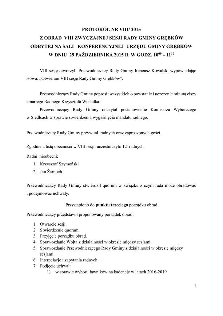 PROTOKÓŁ NR VIII/ 2015 Z OBRAD VIII ZWYCZAJNEJ SESJI RADY GMINY GRĘBKÓW ODBYTEJ NA SALI KONFERENCYJNEJ URZĘDU GMINY GRĘBKÓW W DNIU 29 PAŹDZIERNIKA 2015 R. W GODZ. 1000 – 1110 VIII sesję otworzył Przewodniczący Rady Gminy Ireneusz Kowalski wypowiadając słowa: „Otwieram VIII sesję Rady Gminy Grębków”. Przewodniczący Rady Gminy poprosił wszystkich o powstanie i uczczenie minutą ciszy zmarłego Radnego Krzysztofa Wielądka. Przewodniczący Rady Gminy odczytał postanowienie Komisarza Wyborczego w Siedlcach w sprawie stwierdzenia wygaśnięcia mandatu radnego. Przewodniczący Rady Gminy przywitał radnych oraz zaproszonych gości. Zgodnie z listą obecności w VIII sesji uczestniczyło 12 radnych. Radni nieobecni: 1. Krzysztof Szymoński 2. Jan Żarnoch Przewodniczący Rady Gminy stwierdził quorum w związku z czym rada może obradować i podejmować uchwały. Przystąpiono do punktu trzeciego porządku obrad Przewodniczący przedstawił proponowany porządek obrad: Otwarcie sesji. Stwierdzenie quorum. Przyjęcie porządku obrad. Sprawozdanie Wójta z działalności w okresie między sesjami. Sprawozdanie Przewodniczącego Rady Gminy z działalności w okresie między sesjami. 6. Interpelacje i zapytania radnych. 7. Podjęcie uchwał: 1) w sprawie wyboru ławników na kadencję w latach 2016-2019 1. 2. 3. 4. 5. 1 w sprawie obniżenia ceny skupu żyta do celów wymiaru podatku rolnego na rok 2016 3) w sprawie określenia wysokości stawek podatku od nieruchomości na 2016 rok 4) w sprawie określenia wysokości stawek podatku od środków transportowych na rok 2016 5) w sprawie zwolnień w podatku od nieruchomości 6) w sprawie zatwierdzenia taryf dla zbiorowego zaopatrzenia w wodę na terenie gminy Grębków 8. Informacja o stanie realizacji zadań oświatowych gminy w roku szkolnym 2014/2015. 9. Informacja o oświadczeniach majątkowych radnych Rady Gminy Grębków , wójta , sekretarza gminy, skarbnika gminy, kierowników (dyrektorów) jednostek organizacyjnych gminy oraz osób wydających decyzje administracyjne w imieniu wójta. 10. Odpowiedzi na interpelacje i zapytania radnych. 11. Wolne wnioski i zapytania. 12. Przyjęcie protokołu VII Sesji Rady Gminy. 13. Zamknięcie obrad. 2) Wójt Gminy – Proszę o uzupełnienie porządku obrad w punkcie podjęcie uchwał o uchwały w sprawie zaciągnięcia pożyczki z Wojewódzkiego Funduszu Ochrony Środowiska i Gospodarki Wodnej, w sprawie dokonania zmian w budżecie gminy na 2015 r., w sprawie zmiany Wieloletniej Prognozy Finansowej Gminy Grębków na lata 2015-2021. Uchwała w sprawie pożyczki była już podejmowana teraz chcemy zwiększyć tę pożyczkę o 20.000 zł, celem ograniczenia wydatków z budżetu gminy. Otwarcie sesji. Stwierdzenie quorum. Przyjęcie porządku obrad. Sprawozdanie Wójta z działalności w okresie między sesjami. Sprawozdanie Przewodniczącego Rady Gminy z działalności w okresie między sesjami. 6. Interpelacje i zapytania radnych. 7. Podjęcie uchwał: 1) w sprawie wyboru ławników na kadencję w latach 2016-2019 2) w sprawie obniżenia ceny skupu żyta do celów wymiaru podatku rolnego na rok 2016 3) w sprawie określenia wysokości stawek podatku od nieruchomości na 2016 rok 4) w sprawie określenia wysokości stawek podatku od środków transportowych na rok 2016 5) w sprawie zwolnień w podatku od nieruchomości 2 1. 2. 3. 4. 5. w sprawie zatwierdzenia taryf dla zbiorowego zaopatrzenia w wodę na terenie gminy Grębków 7) w sprawie zaciągnięcia pożyczki z Wojewódzkiego Funduszu Ochrony Środowiska i Gospodarki Wodnej 8) w sprawie dokonania zmian w budżecie gminy na 2015 r. 9) w sprawie zmiany Wieloletniej Prognozy Finansowej Gminy Grębków na lata 2015-2021 8. Informacja o stanie realizacji zadań oświatowych gminy w roku szkolnym 2014/2015. 9. Informacja o oświadczeniach majątkowych radnych Rady Gminy Grębków , wójta , sekretarza gminy, skarbnika gminy, kierowników (dyrektorów) jednostek organizacyjnych gminy oraz osób wydających decyzje administracyjne w imieniu wójta. 10. Odpowiedzi na interpelacje i zapytania radnych. 11. Wolne wnioski i zapytania. 12. Przyjęcie protokołu VII Sesji Rady Gminy. 13. Zamknięcie obrad. 6) Za zmianami w porządku obrad opowiedzieli się wszyscy radni. Głosów „przeciw” i „wstrzymujących się” nie było. Za proponowanym porządkiem obrad opowiedzieli się wszyscy radni. Głosów „przeciw” i „wstrzymujących się” nie było. Przystąpiono do punktu czwartego porządku obrad. Sprawozdanie Wójta z działalności w okresie między sesjami stanowi załącznik do protokołu. Przystąpiono do punktu piątego porządku obrad. Przewodniczący Rady Gminy poinformował, że w okresie między sesjami , dyżury w każdy czwartek , pobyt w urzędzie wg. potrzeb. Udział w zebraniu w Oszczerzach, udział w spotkaniu w Zespole Szkolno-Przedszkolnym przed otwarciem nowego skrzydła , udział w powiatowych obchodach dnia nauczyciela , udział w spotkaniu Lokalnej Grupy Działania „ Bądźmy razem” udział w posiedzeniach komisji. 3 Przystąpiono do punktu szóstego porządku obrad. Przewodniczący Rady Gminy odczytał interpelacje radnej Barbary Pakulak. Przystąpiono do punktu siódmego porządku obrad. Podjęcie uchwały w sprawie wyboru ławników na kadencję w latach 2016- 1) 2019 Przewodniczący Rady Gminy – Kandydatkami na ławników są do Sądu Okręgowego w Siedlcach Pani Danuta Kołak, do Sądu Rejonowego w Węgrowie Pani Krystyna Alicja Rybak Radni wybrali spośród siebie komisję skrutacyjną w celu wyboru ławników w składzie: 1) Michał Pałdyna 2) Beata Bartnicka 3) Katarzyna Polkowska Komisja w ww. składzie dokonała wyboru ławnika do Sądu Okręgowego w Siedlcach. W głosowaniu tajnym wzięło udział 12 radnych. Kandydatka zgłoszona na ławnika do Sądu Okręgowego w Siedlcach otrzymała następująca ilość głosów: 1. Danuta Kołak- 12 głosów Komisja w ww. składzie dokonała wyboru ław