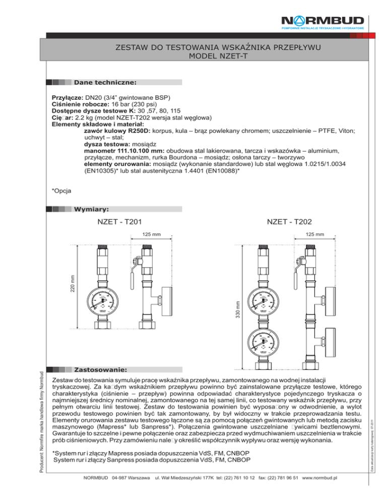 POMPOWNIE INSTALACJE TRYSKACZOWE I HYDRANTOWE ZESTAW DO TESTOWANIA WSKAŹNIKA PRZEPŁYWU MODEL NZET-T Dane techniczne: Przyłącze: DN20 (3/4” gwintowane BSP) Ciśnienie robocze: 16 bar (230 psi) Dostępne dysze testowe K: 30 ,57, 80, 115 Ciężar: 2.2 kg (model NZET-T202 wersja stal węglowa) Elementy składowe i materiał: zawór kulowy R250D: korpus, kula – brąz powlekany chromem; uszczelnienie – PTFE, Viton; uchwyt – stal; dysza testowa: mosiądz manometr 111.10.100 mm: obudowa stal lakierowana, tarcza i wskazówka – aluminium, przyłącze, mechanizm, rurka Bourdona – mosiądz; osłona tarczy – tworzywo elementy orurowania: mosiądz (wykonanie standardowe) lub stal węglowa 1.0215/1.0034 (EN10305)* lub stal austenityczna 1.4401 (EN10088)* *Opcja Wymiary: NZET - T201 NZET - T202 125 mm Zastosowanie: Zestaw do testowania symuluje pracę wskaźnika przepływu, zamontowanego na wodnej instalacji tryskaczowej. Za każdym wskaźnikiem przepływu powinno być zainstalowane przyłącze testowe, którego charakterystyka (ciśnienie – przepływ) powinna odpowiadać charakterystyce pojedynczego tryskacza o najmniejszej średnicy nominalnej, zamontowanego na tej samej linii, co testowany wskaźnik przepływu, przy pełnym otwarciu linii testowej. Zestaw do testowania powinien być wyposażony w odwodnienie, a wylot przewodu testowego powinien być tak zamontowany, by był widoczny w trakcie przeprowadzania testu. Elementy orurowania zestawu testowego łączone są za pomocą połączeń gwintowanych lub metodą zacisku maszynowego (Mapress* lub Sanpress*). Połączenia gwintowane uszczelniane żywicami beztlenowymi. Gwarantuje to szczelne i pewne połączenie oraz zabezpiecza przed wydmuchiwaniem uszczelnienia w trakcie prób ciśnieniowych. Przy zamówieniu należy określić współczynnik wypływu oraz wersję wykonania. *System rur i złączy Mapress posiada dopuszczenia VdS, FM, CNBOP System rur i złączy Sanpress posiada dopuszczenia VdS, FM, CNBOP NORMBUD 04-987 Warszawa ul. Wał Miedzeszyński 177K tel: (22) 761 10 12 fax: (22) 781 96 51 www.normbud.pl Data aktualizacji karty katalogowej: 07-2011 Producent: Normfire marka handlowa firmy Normbud 330 mm 220 mm 125 mm