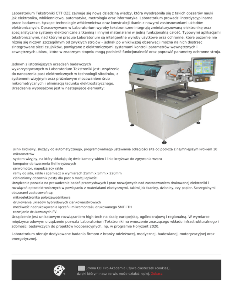 Laboratorium Tekstroniki CTT OZE zajmuje się nową dziedziną wiedzy, która wyodrębniła się z takich obszarów nauki jak elektronika, włókiennictwo, automatyka, metrologia oraz informatyka. Laboratorium prowadzi interdyscyplinarne prace badawcze, łączące technologie włókiennictwa oraz konstrukcji tkanin z nowymi zastosowaniami układów elektronicznych. Opracowywane w Laboratorium wyroby tekstroniczne integrują zminiaturyzowaną elektronikę oraz specjalistyczne systemy elektroniczne z tkaniną i innymi materiałami w jedną funkcjonalną całość. Typowymi aplikacjami tekstronicznymi, nad którymi pracuje Laboratorium są inteligentne wyroby użytkowe oraz ochronne, które pozornie nie różnią się niczym szczególnym od zwykłych strojów - jednak po wnikliwszej obserwacji można na nich dostrzec zintegrowane sieci czujników, powiązane z elektronicznymi systemami kontroli parametrów wewnętrznych i zewnętrznych ubioru, które w znacznym stopniu mogą podnieść funkcjonalność oraz poprawić parametry ochronne stroju. Jednym z istotniejszych urządzeń badawczych wykorzystywanych w Laboratorium Tekstroniki jest urządzenie do nanoszenia past elektronicznych w technologii sitodruku, z systemem wizyjnym oraz próżniowym mocowaniem śrub mikrometrycznych i eliminacją ładunku elektrostatycznego. Urządzenie wyposażone jest w następujące elementy: silnik krokowy, służący do automatycznego, programowalnego ustawiania odległości sita od podłoża z najmniejszym krokiem 10 mikrometrów system wizyjny, na który składają się dwie kamery wideo i linie krzyżowe do zgrywania wzoru komputer do tworzenia linii krzyżowych serwomotor, napędzający rakle ramy do sita, rakle i zgarniacz o wymiarach 25mm x 5mm x 220mm ciśnieniowy dozownik pasty dla past o małej lepkości. Urządzenie pozwala na prowadzenie badań przemysłowych i prac rozwojowych nad zastosowaniem drukowanej elektroniki i rozwiązań optoelektronicznych w powiązaniu z materiałami elastycznymi, takimi jak tkaniny, dzianiny, czy papier. Szczególnymi obszarami zastosowań są: mikroelektronika półprzewodnikowa drukowanie układów hybrydowych cienkowarstwowych możliwość nadrukowywania łączeń i mikromontażu drukowanego SMT i TH rozwijanie drukowanych PV. Urządzenie jest unikatowym rozwiązaniem high-tech na skalę europejską, ogólnokrajową i regionalną. W wymiarze międzynarodowym urządzenie pozwala Laboratorium Tekstroniki na wnoszenie znaczącego wkładu infrastrukturalnego i zdolności badawczych do projektów kooperacyjnych, np. w programie Horyzont 2020. Laboratorium oferuje dedykowane badania firmom z branży odzieżowej, medycznej, budowlanej, motoryzacyjnej oraz energetycznej. Strona CBI Pro-Akademia używa ciasteczek (cookies), dzięki którym nasz serwis może działać lepiej. Zobacz