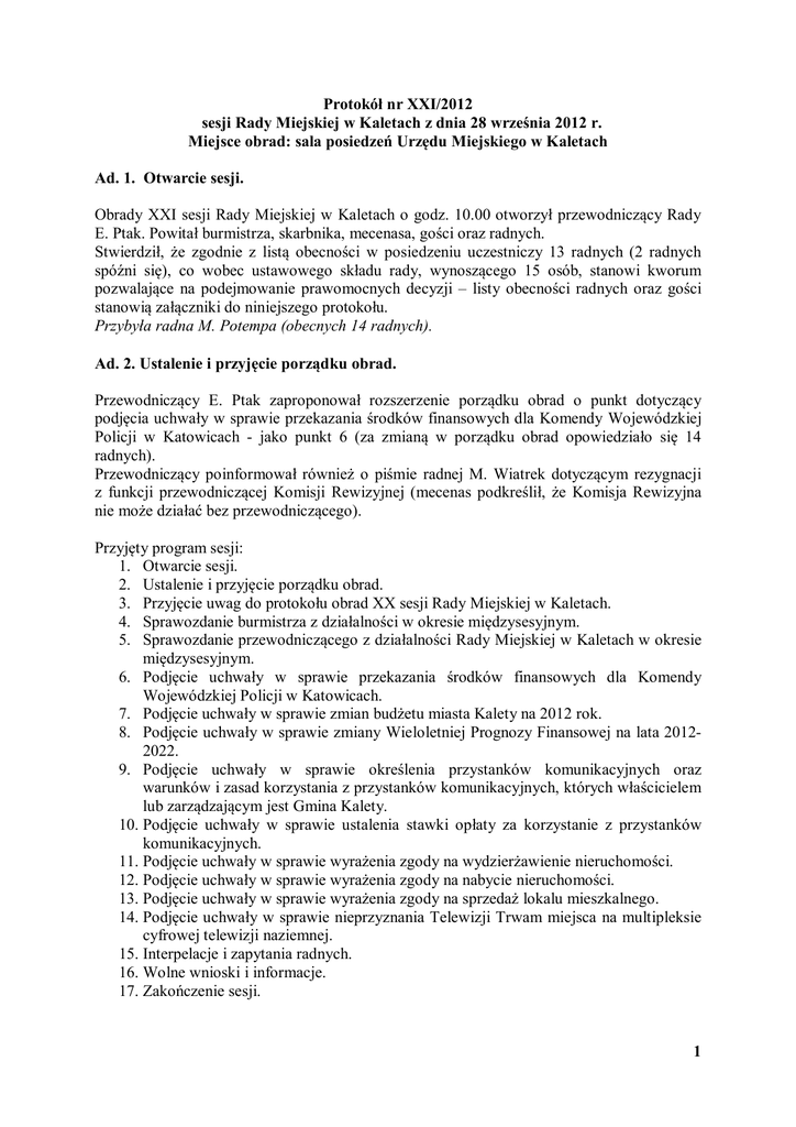 Protokół nr XXI/2012 sesji Rady Miejskiej w Kaletach z dnia 28 września 2012 r. Miejsce obrad: sala posiedzeń Urzędu Miejskiego w Kaletach Ad. 1. Otwarcie sesji. Obrady XXI sesji Rady Miejskiej w Kaletach o godz. 10.00 otworzył przewodniczący Rady E. Ptak. Powitał burmistrza, skarbnika, mecenasa, gości oraz radnych. Stwierdził, że zgodnie z listą obecności w posiedzeniu uczestniczy 13 radnych (2 radnych spóźni się), co wobec ustawowego składu rady, wynoszącego 15 osób, stanowi kworum pozwalające na podejmowanie prawomocnych decyzji – listy obecności radnych oraz gości stanowią załączniki do niniejszego protokołu. Przybyła radna M. Potempa (obecnych 14 radnych). Ad. 2. Ustalenie i przyjęcie porządku obrad. Przewodniczący E. Ptak zaproponował rozszerzenie porządku obrad o punkt dotyczący podjęcia uchwały w sprawie przekazania środków finansowych dla Komendy Wojewódzkiej Policji w Katowicach - jako punkt 6 (za zmianą w porządku obrad opowiedziało się 14 radnych). Przewodniczący poinformował również o piśmie radnej M. Wiatrek dotyczącym rezygnacji z funkcji przewodniczącej Komisji Rewizyjnej (mecenas podkreślił, że Komisja Rewizyjna nie może działać bez przewodniczącego). Przyjęty program sesji: 1. Otwarcie sesji. 2. Ustalenie i przyjęcie porządku obrad. 3. Przyjęcie uwag do protokołu obrad XX sesji Rady Miejskiej w Kaletach. 4. Sprawozdanie burmistrza z działalności w okresie międzysesyjnym. 5. Sprawozdanie przewodniczącego z działalności Rady Miejskiej w Kaletach w okresie międzysesyjnym. 6. Podjęcie uchwały w sprawie przekazania środków finansowych dla Komendy Wojewódzkiej Policji w Katowicach. 7. Podjęcie uchwały w sprawie zmian budżetu miasta Kalety na 2012 rok. 8. Podjęcie uchwały w sprawie zmiany Wieloletniej Prognozy Finansowej na lata 20122022. 9. Podjęcie uchwały w sprawie określenia przystanków komunikacyjnych oraz warunków i zasad korzystania z przystanków komunikacyjnych, których właścicielem lub zarządzającym jest Gmina Kalety. 10. Podjęcie uchwały w sprawie ustalenia stawki opłaty za korzystanie z przystanków komunikacyjnych. 11. Podjęcie uchwały w sprawie wyrażenia zgody na wydzierżawienie nieruchomości. 12. Podjęcie uchwały w sprawie wyrażenia zgody na nabycie nieruchomości. 13. Podjęcie uchwały w sprawie wyrażenia zgody na sprzedaż lokalu mieszkalnego. 14. Podjęcie uchwały w sprawie nieprzyznania Telewizji Trwam miejsca na multipleksie cyfrowej telewizji naziemnej. 15. Interpelacje i zapytania radnych. 16. Wolne wnioski i informacje. 17. Zakończenie sesji. 1 Ad. 3. Przyjęcie uwag do protokołu obrad XX sesji Rady Miejskiej w Kaletach. Przewodniczący zwrócił się do radnych, z zapytaniem, czy ktoś zgłasza uwagi do protokołu XX sesji. Radna B. Kąkol zgłosiła wcześniej uwagi techniczne, które naniesiono. Więcej uwag nie zgłoszono, a protokół został przyjęty. Ad. 4. Sprawozdanie burmistrza z działalności w okresie międzysesyjnym. Sprawozdanie burmistrza z działalności w okresie międzysesyjnym stanowi załącznik do protokołu. Następnie radni zadawali pytania. Radna B. Kąkol pytała o sprawę oddzielenia się od subregionu centralnego (burmistrz wyjaśnił, że znaczyłoby to więcej środków dla miasta) oraz o podjęciu stanowiska w sprawie chipowania psów (burmistrz odpowiedział, że jeśli ościenne gminy nie zdecydują się na chipowanie psów, Kalety również nie). Wiceprzewodniczący R. Sendel pytał o informacje dotyczące kładki drewniano-klejonej w Truszczycy, burmistrz odpowiedział, że byłaby to kładka pieszo-rowerowa, przygotowana ma być szczegółowa oferta firmy zainteresowanej wykonaniem kładki. Ad. 5. Sprawozdanie przewodniczącego z działalności Rady Miejskiej w Kaletach w okresie międzysesyjnym. Przewodniczący Rady Miejskiej przedstawił sprawozdanie z działalności Rady Miejskiej w okresie międzysesyjnym (stanowi ono załącznik do protokołu). Ogłoszono przerwę. W tym czasie na obrady przybyła radna Z. Jelonek (obecnych 15 radnych). Ad. 6. Podjęcie uchwały w sprawie przekazania środków finansowych dla Komendy Wojewódzkiej Policji w Katowicach. Skarbnik poinformowała, że projekt uchwały szczegółowo przedstawiała na posiedzeniach wszystkich komisji stałych Rady Miejskiej, przy tym poinformowała o zmianie w podstawie prawnej (zmianę naniesiono). Komisje pozytywnie zaopiniowały projekt uchwały. Wobec braku pytań przewodniczący zarządził głosowanie nad uchwałą. Uchwała Nr 191/XXI/2012 w sprawie przekazania środków finansowych dla Komendy Wojewódzkiej Policji w Katowicach została przyjęta jednogłośnie. Wynik głosowania: za – 15, przeciw – 0, wstrzymało się – 0 (obecnych 15 radnych). Ad. 7. Podjęcie uchwały w sprawie zmian budżetu miasta Kalety na 2012 rok. Głos zabrała skarbnik R. Sosnica, która poinformowała, że zaznajomiła wszystkie komisje ze zmianami wprowadzanymi do budżetu projektem uchwały. Komisje pozytywnie zaopiniowały projekt uchwały. Wobec powyższego przewodniczący E. Ptak zarządził głosowanie nad uchwałą. Uchwała Nr 192/XXI/2012 w sprawie zmian budżetu miasta Kalety na 2012 rok została przyjęta większością głosów. Wynik głosowania: za – 14, przeciw – 0, wstrzymało się – 1 (obecnych 15 radnych). 2 Ad. 8. Podjęcie uchwały w sprawie zmiany Wieloletniej Prognozy Finansowej na lata 2012-2022. Skarbnik R. Sosnica poinformowała, że projekt uchwały omawiała na posiedzeniu wszystkich komisji, a jej wyjaśnienia nie budziły zastrzeżeń. Komisje pozytywnie zaopiniowały projekt uchwały. Wobec powyższego przewodniczący E. Ptak zarządził głosowanie nad uchwałą. Uchwała Nr 193/XXI/2012 w sprawie zmiany Wieloletniej Prognozy Finansowej na lata 2012- 2022 została przyjęta jednogłośnie. Wynik głosowania: za – 15, przeciw – 0, wstrzymało się – 0 (obecnych 15 radnych). Ad. 9. Podjęcie uchwały w sprawie okreś