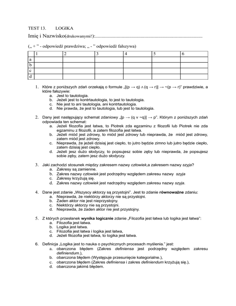 TEST 13. LOGIKA Imię i Nazwisko(drukowanymi!):..................................................................................... („ + ” - odpowiedź prawdziwa; „ - ” odpowiedź fałszywa) 1 2 3 4 5 6 a b c d 1. Które z poniższych zdań orzekają o formule „[(p → q) Λ (q → r)] → ~(p → r)” prawdziwie, a które fałszywie: a. Jest to tautologia. b. Jeżeli jest to kontrtautologia, to jest to tautologia. c. Nie jest to ani tautologia, ani kontrtautologia. d. Nie prawda, że jest to tautologia, lub jest to tautologia. 2. Dany jest następujący schemat zdaniowy „[p → (q v ~q)] → p”. Którym z poniższych zdań odpowiada ten schemat: a. Jeżeli filozofia jest łatwa, to Piotrek zda egzaminu z filozofii lub Piotrek nie zda egzaminu z filozofii, a zatem filozofia jest łatwa. b. Jeżeli miód jest zdrowy, to miód jest zdrowy lub nieprawda, że miód jest zdrowy, zatem miód jest zdrowy. c. Nieprawda, że jeżeli dzisiaj jest ciepło, to jutro będzie zimno lub jutro będzie ciepło, zatem dzisiaj jest ciepło. d. Jeżeli jesz dużo słodyczy, to popsujesz sobie zęby lub nieprawda, że popsujesz sobie zęby, zatem jesz dużo słodyczy. 3. Jaki zachodzi stosunek między zakresem nazwy człowiek,a zakresem nazwy szyja? a. Zakresy są zamienne. b. Zakres nazwy człowiek jest podrzędny względem zakresu nazwy szyja c. Zakresy krzyżują się. d. Zakres nazwy człowiek jest nadrzędny względem zakresu nazwy szyja. 4. Dane jest zdanie „Wszyscy aktorzy są przystojni”. Jest to zdanie równoważne zdaniu: a. b. c. d. Nieprawda, że niektórzy aktorzy nie są przystojni. Żaden aktor nie jest nieprzystojny. Niektórzy aktorzy nie są przystojni. Nieprawda, że żaden aktor nie jest przystojny. 5. Z których przesłanek wynika logicznie zdanie „Filozofia jest łatwa lub logika jest łatwa”: a. b. c. d. Filozofia jest łatwa. Logika jest łatwa. Filozofia jest łatwa i logika jest łatwa, Jeżeli filozofia jest łatwa, to logika jest łatwa. 6. Definicja „Logika jest to nauka o psychicznych procesach myślenia.” jest: a. obarczona błędem (Zakres definiensa jest podrzędny względem zakresu definiendum.), b. obarczona błędem (Występuje przesunięcie kategorialne.), c. obarczona błędem (Zakres definiensa i zakres definiendum krzyżują się.), d. obarczona jakimś błędem.
