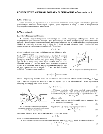 Podstawy elektroniki i metrologii na kierunku Informatyka PODSTAWOWE MIERNIKI I POMIARY ELEKTRYCZNE - Ćwiczenie nr 1 1. Cel ćwiczenia Celem ćwiczenia jest zapoznanie się z podstawowymi miernikami elektrycznymi oraz metodyką pomiarów podstawowych wielkości elektrycznych: napięcia, prądu rezystancji i mocy, a także z komputerowym wspomaganiem obróbki danych pomiarowych. 2. Wprowadzenie 2.1. Mierniki magnetoelektryczne W mierniku magnetoelektrycznym wykorzystuje się zasadę wzajemnego oddziaływania dwóch pól magnetycznych: pola magnesu trwałego i pola pochodzącego od prądu, przepływającego przez przewodnik. Zgodnie z prawem Biota-Savarta-Laplace'a na przewodnik znajdujący się w jednorodnym polu magnetycznym o indukcji B, przez który przepływa prąd I, działa siła F. Jeżeli kierunek przepływu prądu i kierunek linii pola magnetycznego są wzajemnie prostopadłe, to siła F jest równa: F = B ⋅ I ⋅ a, (1) gdzie a jest długością przewodu znajdującego się pod działaniem pola magnetycznego. Jeżeli zatem w stałym polu magnetycznym o indukcji B umieścić prostokątną cewkę o z zwojach i wymiarach a×b (gdzie a - bok prostopadły do kierunku linii sił pola), przez którą przepływa prąd I (rys. 1), to na każdy zwój cewki będzie działała para sił F−F, określona wzorem (1). Jeśli oś obrotu cewki przechodzi w połowie boku b, a ϕ oznacza kąt między płaszczyzną cewki i kierunkiem linii sił pola magnetycznego, to para sił F' - F' stara się obrócić cewkę wokół osi. Powstaje moment napędowy: b b 2 2 F B F’ N S I ϕ F’ F Rys. 1. Zwój cewki w polu magnetycznym Mn = F' + F' = B⋅ I ⋅a⋅ z⋅cosϕ⋅b. (2) Obwód magnetyczny miernika można tak ukształtować, że w kątowym zakresie obrotu cewki Θmin ÷ Θmax (rys. 2) indukcja magnetyczna B i kąt ϕ są stałe. Jak wynika z rys. 2, kąt ϕ jest równy 0o i wobec tego moment napędowy powodujący obrót cewki wynosi: Mn = B ⋅ a ⋅ b ⋅ z ⋅ I Θmax N S Θmin Rys. 2. Geometria nabiegunników magnesu pozwalająca kształtować promieniście skierowane linie sił pola magnetycznego . (3) Ustalenie położenia cewki można uzyskać przeciwdziałając obrotowi momentem siły zwanym momentem zwrotnym. Moment zwrotny MZ jest proporcjonalny do kąta obrotu cewki Θ: M z = kz ⋅ Θ , (4) gdzie: kz - stała. W stanie ustalenia położenia cewki moment napędowy jest równy momentowi zwrotnemu: Mn = Mz (5) Na podstawie (3), (4) i (5) uzyskuje się zależność: B ⋅a ⋅b ⋅ z Θ= ⋅I . kz (6) Odchylenie liniowe α końca wskazówki sprzężonej z cewką jest równe α = k ⋅ Θ, gdzie: k - stała zależna od długości wskazówki. Tak więc wskazanie przyrządu w granicach obrotu cewki o kąt Θmin - Θmax będzie liniową funkcją prądu k ⋅ B ⋅ a ⋅b ⋅ z α= ⋅ I = S ⋅ I, kz (7) (8) Podstawy elektroniki i metrologii na kierunku Informatyka gdzie: S - czułość przyrządu, wyrażona w działkach na 1A, zależna od rozwiązania konstrukcyjnego i długości wskazówki. a) Mn , Mz Mz Mn4 I4 Mn3 I3 Mn2 I2 Mn1 I1 α1 b) α2 α3 α4 α Θmin Θ1 Θ2 Θ3 Θ4 Θ 0 I1 I2 I3 I4 I α0 α1 α2 α3 α4 α Rys.3. Rodzina przebiegów Mn = f(Θ) dla różnych prądów (a) oraz podziałka miernika (b) Podziałkę miernika magnetoelektrycznego można wyznaczyć w sposób graficzny, korzystając z rys. 3, na którym przedstawiono zależność momentu napędowego i momentu zwrotnego w funkcji kąta obrotu cewki w zakresie poprawnej pracy miernika, tzn. w zakresie Θmin ÷ Θmax, a także w funkcji odchylenia wskazówki od położenia zerowego. Parametrem wykresu momentu napędowego jest prąd przepływający przez miernik. Konstrukcję miernika magnetoelektrycznego pokazuje schematycznie 2 3 rys. 4. Organ ruchomy miernika składa się z cewki 5 wskazówki 8 i ośki 6. 1 4 Obwód magnetyczny miernika, składający się z magnesu 1 oraz 0 mA 5 wykonanych z miękkiej stali nabiegunników 2, 3 i rdzenia 4, wytwarza w 8 odpowiednio ukształtowanej szczelinie indukcję B o rozkładzie, jak na rys. 1 2. Cewka 5 nawinięta jest cienkim przewodem na aluminiowej ramce, która 3 2 4 7 pełni rolę elementu wzmacniającego konstrukcję miernika, równocześnie stanowi tłumik elektromagnetyczny. W czasie ruchu cewki w szczelinie w N S zwartym zwoju, jaki stanowi ramka, indukują się prądy wytwarzające 5 6 moment przeciwdziałający ruchowi. Rys. 4. Konstrukcja miernika Moment zwrotny uzyskany jest dzięki parze sprężynek zwrotnych 7, magnetoelektrycznego spełniających równocześnie rolę przewodów doprowadzających prąd do cewki. Podstawowe właściwości miernika magnetoelektrycznego: a) miernik reaguje bezpośrednio na prąd przepływający przez cewkę, b) kierunek przepływającego prądu decyduje o kierunku ruchu organu ruchomego, c) podziałka miernika jest liniowa, d) miernik jest odporny na zakłócenia polami zewnętrznymi ze względu na bardzo dużą indukcję magnetyczną, którą można uzyskać w wąskiej szczelinie między rdzeniem i nabiegunnikami. Dokładność mierników magnetoelektrycznych można scharakteryzować klasą. Klasa jest określona przez wartość modułu maksymalnego błędu bezwględnego otrzymanego podczas wzorcowania miernika odniesionego do wartości zakresowej miernika z godnie z poniższym wyrażeniem: kl = ∆xmax ⋅ 100 x zakr (9) Należy podkreślić, że błąd względny pomiaru jest równy klasie jedynie dla wychylenia wskazówki do wartości zakresowej, dla mniejszych wychyleń uzyskane błędy względne są większe od klasy. 2.2. Woltomierze i amperomierze magnetoelektryczne Mierniki magnetoelektryczne z zasady działania są amperomierzami i mają stałą rezystancję wewnętrzną Ra. Zgodnie z prawem Ohma mogą być stosowane również do pomiaru napięcia, a o tym czy miernik mierzy prąd czy napięcie, decyduje sposób podłączenia go do obwodu. + I Ra Rp A Up Ua Uv Rys. 5. Układ rozszerzający zakres pomiarowy woltomierza 2 − Podstaw