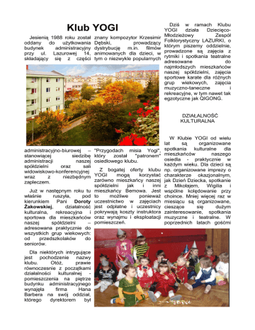 Klub YOGI Jesienią 1988 roku został oddany do użytkowania budynek administracyjny przy ul. Lazurowej 14, składający się z części znany kompozytor Krzesimir Dębski, prowadzący dystrybucję m.in. filmów animowanych dla dzieci, w tym o niezwykle popularnych Dziś w ramach Klubu YOGI działa DziecięcoMłodzieżowy Zespół Folklorystyczny LAZURKI, o którym piszemy oddzielnie, prowadzone są zajęcia z rytmiki i spotkania teatralne adresowane do najmłodszych mieszkańców naszej spółdzielni, zajęcia sportowe karate dla róźnych grup wiekowych, zajęcia muzyczno-taneczne i rekreacyjne, w tym nawet tak egzotyczne jak QIGONG. DZIAŁALNOŚĆ KULTURALNA administracyjno-biurowej – stanowiącej siedzibę administracji naszej spółdzielni oraz sali widowiskowo-konferencyjnej wraz z niezbędnym zapleczem. Już w następnym roku tu właśnie ruszyła, pod kierunkiem Pani Doroty Żakowskiej, działalność kulturalna, rekreacyjna i sportowa dla mieszkańców naszej spółdzielni – adresowana praktycznie do wszystkich grup wiekowych: od przedszkolaków do seniorów. Dla niektórych intrygujące jest pochodzenie nazwy klubu. Otóż, prawie równoczesnie z początkami działalności kulturalnej pomieszczenia na piętrze budynku administracyjnego wynajęła firma Hana Barbera na swój oddział, którego dyrektorem był "Przygodach misia Yogi", który został "patronem" osiedlowego klubu. Z bogatej oferty klubu YOGI mogą korzystać zarówno mieszkańcy naszej spółdzielni jak i inni mieszkańcy Bemowa. Jest to możliwe ponieważ uczestnictwo w zajęciach jest odpłatne i uczestnicy pokrywają koszty instruktora oraz wynajmu i eksploatacji pomieszczeń. W Klubie YOGI od wielu lat są organizowane spotkania kulturalne dla mieszkańców naszego osiedla - praktycznie w każdym wieku. Dla dzieci są np. organizowane imprezy o charakterze okazjonalnym, jak Dzień Dziecka, spotkanie z Mikołajem, Wigilia i wspólne kolędowanie przy choince. Mniej więcej raz w miesiącu są organizowane, cieszące się dużym zainteresowanie, spotkania muzyczne i teatralne. W poprzednich latach gośćmi naszych dzieci byli np. Maciej Damięcki, Laura Łącz, Jan Wysocki i inni artyści, jak np. z grupy Lady Punk oraz wykonawcy muzyki country. O kolejnych imprezach tego typu trzeba szuać informacji na osiedlowych tablicach ogłoszeń i na stronie internetowej. RYTMIKA DLA DZIECI Od 1999 r. prowadzone są zajęcia z rytmiki przeznaczone dla dzieci w wieku od 2 lat. Zajęcia z naszymi pociechami prowadzi Pani Beata Domagała. Podczas zajęć, poza ćwiczeniami dzieci oswajają się z rytmem, muzyką i ruchem tanecznym, a przy okazji uczą integracji z rówieśnikami. W zajęciach mogą uczestniczyć (i uczestniczą) opiekunowie: rodzice, dziadkowie itp. Zajęcia odbywają się w poniedziałki i czwartki od godz. 11.50. GIMNASTYKA USPRAWNIAJĄCA Od 1989 r. w klubie prowadzone były zajęcia gimnastyczne dla pań: aerobik, pilates - czyli ćwiczenia rehabilitacyjne i calanetics (ćwiczenia poprawiające sylwetkę. Od września br. prowadzone są tylko zajęcia usprawniające dla pań – jest to gimnastyka usprawniająca i relaksująca, nieco mniej dynamiczna, ale również podtrzymująca sprawność układu ruchowego i witalność organizmu. Polecana dla pań w każdym SPOTKANIA wieku. Doświadczona MUZYCZNO-TANECZNE I instruktorka – Pani INNE DLA DOROSŁYCH Wiesława Sawicka – zaprasza we wtorki i czwartki Seniorzy bawią się w każdą środę na wieczorkach od godz. 9.30. tanecznych prowadzonych QIGONG przez Mariusza Krakowskiego. QIGONG – (czikung) to starochińskie ćwiczenia Również dla dorosłych, lecznicze, których tradycja zwykle we współpracy z sięga kilku tysięcy lat. bemowskim Ośrodkiem Ćwiczenia te wzmacniają Pomocy Społecznej, organizm, zapewniają odpręprowadzone są spotkania żenie i wewnętrzny spokój kulinarne, warsztaty oraz uodparniają na stres. florystyczne, a także spotkania na temat sportu i Systematyczne uprawianie rekreacji oraz zdrowego ćwiczeń "qigong" daje trwałą żywienia. poprawę zdrowia, wzmacnia pamięć i koncentrację oraz wzmaga witalność, a ponadto spowalnia proces starzenia się organizmu. Styl "lecącego żurawia", bo takie jest poetyckie tłumaczenie określenia "qigong", jest uniwersalny pomaga bowiem zarówno osobom młodym jak i starszym. Ćwiczenia ruchowe są płynne i łagodne, łączą ruch i koncentrację z naturalnym oddechem. Na zajęcia z "qigong" zaprasza Pani Krystyna Cianciara w poniedziałki i środy w godz. 10-12. PLACE ZABAW W ostatnich latach na naszym osiedlu zostało zbudowanych kilka placów zabaw dla dzieci: plac "centralny" – między Rozłogi 12A a Siemiatycką 5-11, między Rozłogi 12 a Rozłogi 12A oraz miniogródek przed budynkiem administracji. Warto podkreślić, że 2007 r., - w konkursie ogłoszonym przez Prezydenta Warszawy – nasz "centralny" plac zabaw zajął I miejsce w Warszawie wśród ogólnodostępnych placów zabaw. (EK)