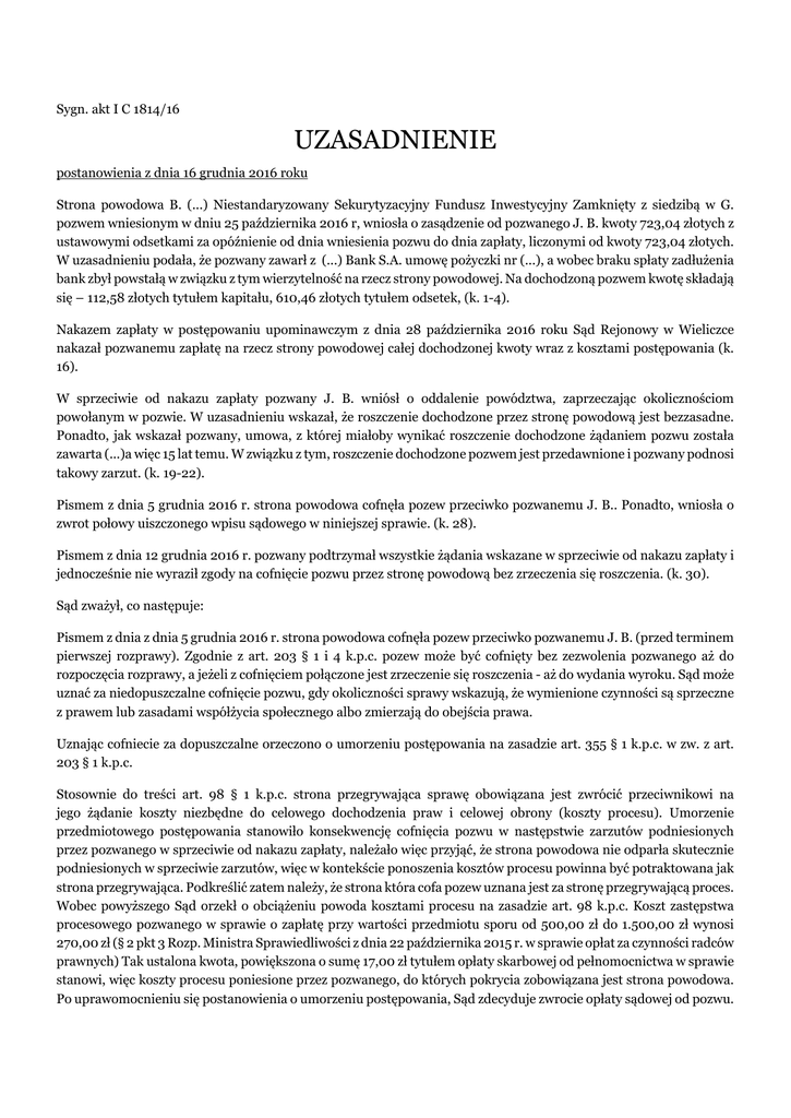 Sygn. akt I C 1814/16 UZASADNIENIE postanowienia z dnia 16 grudnia 2016 roku Strona powodowa B. (...) Niestandaryzowany Sekurytyzacyjny Fundusz Inwestycyjny Zamknięty z siedzibą w G. pozwem wniesionym w dniu 25 października 2016 r, wniosła o zasądzenie od pozwanego J. B. kwoty 723,04 złotych z ustawowymi odsetkami za opóźnienie od dnia wniesienia pozwu do dnia zapłaty, liczonymi od kwoty 723,04 złotych. W uzasadnieniu podała, że pozwany zawarł z (...) Bank S.A. umowę pożyczki nr (...), a wobec braku spłaty zadłużenia bank zbył powstałą w związku z tym wierzytelność na rzecz strony powodowej. Na dochodzoną pozwem kwotę składają się – 112,58 złotych tytułem kapitału, 610,46 złotych tytułem odsetek, (k. 1-4). Nakazem zapłaty w postępowaniu upominawczym z dnia 28 października 2016 roku Sąd Rejonowy w Wieliczce nakazał pozwanemu zapłatę na rzecz strony powodowej całej dochodzonej kwoty wraz z kosztami postępowania (k. 16). W sprzeciwie od nakazu zapłaty pozwany J. B. wniósł o oddalenie powództwa, zaprzeczając okolicznościom powołanym w pozwie. W uzasadnieniu wskazał, że roszczenie dochodzone przez stronę powodową jest bezzasadne. Ponadto, jak wskazał pozwany, umowa, z której miałoby wynikać roszczenie dochodzone żądaniem pozwu została zawarta (...)a więc 15 lat temu. W związku z tym, roszczenie dochodzone pozwem jest przedawnione i pozwany podnosi takowy zarzut. (k. 19-22). Pismem z dnia 5 grudnia 2016 r. strona powodowa cofnęła pozew przeciwko pozwanemu J. B.. Ponadto, wniosła o zwrot połowy uiszczonego wpisu sądowego w niniejszej sprawie. (k. 28). Pismem z dnia 12 grudnia 2016 r. pozwany podtrzymał wszystkie żądania wskazane w sprzeciwie od nakazu zapłaty i jednocześnie nie wyraził zgody na cofnięcie pozwu przez stronę powodową bez zrzeczenia się roszczenia. (k. 30). Sąd zważył, co następuje: Pismem z dnia z dnia 5 grudnia 2016 r. strona powodowa cofnęła pozew przeciwko pozwanemu J. B. (przed terminem pierwszej rozprawy). Zgodnie z art. 203 § 1 i 4 k.p.c. pozew może być cofnięty bez zezwolenia pozwanego aż do rozpoczęcia rozprawy, a jeżeli z cofnięciem połączone jest zrzeczenie się roszczenia - aż do wydania wyroku. Sąd może uznać za niedopuszczalne cofnięcie pozwu, gdy okoliczności sprawy wskazują, że wymienione czynności są sprzeczne z prawem lub zasadami współżycia społecznego albo zmierzają do obejścia prawa. Uznając cofniecie za dopuszczalne orzeczono o umorzeniu postępowania na zasadzie art. 355 § 1 k.p.c. w zw. z art. 203 § 1 k.p.c. Stosownie do treści art. 98 § 1 k.p.c. strona przegrywająca sprawę obowiązana jest zwrócić przeciwnikowi na jego żądanie koszty niezbędne do celowego dochodzenia praw i celowej obrony (koszty procesu). Umorzenie przedmiotowego postępowania stanowiło konsekwencję cofnięcia pozwu w następstwie zarzutów podniesionych przez pozwanego w sprzeciwie od nakazu zapłaty, należało więc przyjąć, że strona powodowa nie odparła skutecznie podniesionych w sprzeciwie zarzutów, więc w kontekście ponoszenia kosztów procesu powinna być potraktowana jak strona przegrywająca. Podkreślić zatem należy, że strona która cofa pozew uznana jest za stronę przegrywającą proces. Wobec powyższego Sąd orzekł o obciążeniu powoda kosztami procesu na zasadzie art. 98 k.p.c. Koszt zastępstwa procesowego pozwanego w sprawie o zapłatę przy wartości przedmiotu sporu od 500,00 zł do 1.500,00 zł wynosi 270,00 zł (§ 2 pkt 3 Rozp. Ministra Sprawiedliwości z dnia 22 października 2015 r. w sprawie opłat za czynności radców prawnych) Tak ustalona kwota, powiększona o sumę 17,00 zł tytułem opłaty skarbowej od pełnomocnictwa w sprawie stanowi, więc koszty procesu poniesione przez pozwanego, do których pokrycia zobowiązana jest strona powodowa. Po uprawomocnieniu się postanowienia o umorzeniu postępowania, Sąd zdecyduje zwrocie opłaty sądowej od pozwu. Z.. 1. (...) 2. (...) 3. K..(...)