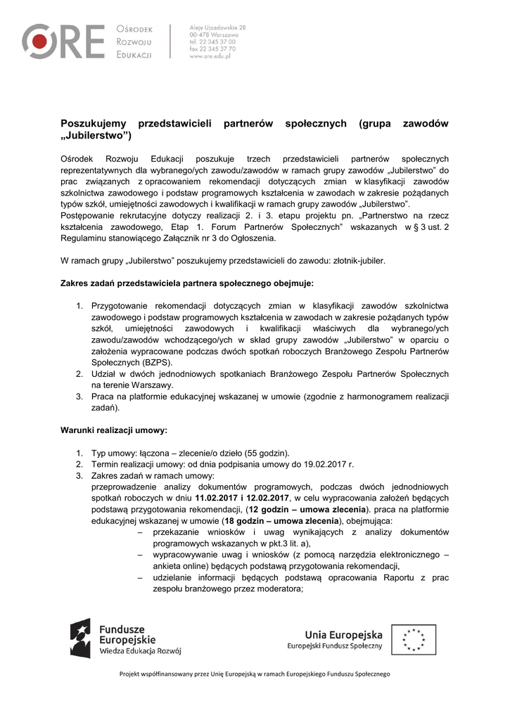 Poszukujemy przedstawicieli „Jubilerstwo”) partnerów społecznych (grupa zawodów Ośrodek Rozwoju Edukacji poszukuje trzech przedstawicieli partnerów społecznych reprezentatywnych dla wybranego/ych zawodu/zawodów w ramach grupy zawodów „Jubilerstwo” do prac związanych z opracowaniem rekomendacji dotyczących zmian w klasyfikacji zawodów szkolnictwa zawodowego i podstaw programowych kształcenia w zawodach w zakresie pożądanych typów szkół, umiejętności zawodowych i kwalifikacji w ramach grupy zawodów „Jubilerstwo”. Postępowanie rekrutacyjne dotyczy realizacji 2. i 3. etapu projektu pn. „Partnerstwo na rzecz kształcenia zawodowego, Etap 1. Forum Partnerów Społecznych” wskazanych w § 3 ust. 2 Regulaminu stanowiącego Załącznik nr 3 do Ogłoszenia. W ramach grupy „Jubilerstwo” poszukujemy przedstawicieli do zawodu: złotnik-jubiler. Zakres zadań przedstawiciela partnera społecznego obejmuje: 1. Przygotowanie rekomendacji dotyczących zmian w klasyfikacji zawodów szkolnictwa zawodowego i podstaw programowych kształcenia w zawodach w zakresie pożądanych typów szkół, umiejętności zawodowych i kwalifikacji właściwych dla wybranego/ych zawodu/zawodów wchodzącego/ych w skład grupy zawodów „Jubilerstwo” w oparciu o założenia wypracowane podczas dwóch spotkań roboczych Branżowego Zespołu Partnerów Społecznych (BZPS). 2. Udział w dwóch jednodniowych spotkaniach Branżowego Zespołu Partnerów Społecznych na terenie Warszawy. 3. Praca na platformie edukacyjnej wskazanej w umowie (zgodnie z harmonogramem realizacji zadań). Warunki realizacji umowy: 1. Typ umowy: łączona – zlecenie/o dzieło (55 godzin). 2. Termin realizacji umowy: od dnia podpisania umowy do 19.02.2017 r. 3. Zakres zadań w ramach umowy: przeprowadzenie analizy dokumentów programowych, podczas dwóch jednodniowych spotkań roboczych w dniu 11.02.2017 i 12.02.2017, w celu wypracowania założeń będących podstawą przygotowania rekomendacji, (12 godzin – umowa zlecenia). praca na platformie edukacyjnej wskazanej w umowie (18 godzin – umowa zlecenia), obejmująca: – przekazanie wniosków i uwag wynikających z analizy dokumentów programowych wskazanych w pkt.3 lit. a), – wypracowywanie uwag i wniosków (z pomocą narzędzia elektronicznego – ankieta online) będących podstawą przygotowania rekomendacji, – udzielanie informacji będących podstawą opracowania Raportu z prac zespołu branżowego przez moderatora; Projekt współfinansowany przez Unię Europejską w ramach Europejskiego Funduszu Społecznego a) przygotowanie rekomendacji dotyczących zmian w klasyfikacji zawodów szkolnictwa zawodowego i podstaw programowych kształcenia w zawodach w zakresie pożądanych typów szkół, umiejętności zawodowych i kwalifikacji właściwych dla wybranego/ych zawodu/zawodów wchodzącego/ych w skład grupy zawodów „Jubilerstwo”, w oparciu o założenia wypracowane podczas dwóch spotkań roboczych Branżowych Zespołów Partnerów Społecznych (BZPS) oraz wypracowane uwagi i wnioski na platformie edukacyjnej wskazanej w umowie, według szablonu w załączniku do umowy (25 godzin – umowa o dzieło). 4. Warunki finansowe: Na podstawie wniosku o dofinansowanie projektu Zamawiający określa następujący maksymalny limit kosztów na poszczególne wydatki związane z opisanym zadaniem: realizacja przedmiotu umowy: 50 zł/godzina * 55 h = 2750 zł/os brutto. Informacje uzupełniające: 1. Wykonawcy zobowiązani będą do przedstawiania oświadczenia w postaci protokołu o faktycznej liczbie godzin, którą przeznaczyli na realizację umowy w ujęciu miesięcznym oraz poświadczą, że łączna miesięczna liczba godzin zadań realizowanych w ramach wszystkich projektów finansowanych z funduszy strukturalnych i Funduszu Spójności oraz zadań finansowanych z innych źródeł, obejmujących okres realizacji umowy zawartej z ORE nie przekracza łącznie 276 godzin miesięcznie. Jednocześnie wykonawca będzie zobowiązany do złożenia oświadczenia, że obciążenie zawodowe nie wyklucza możliwości prawidłowej i efektywnej realizacji wszystkich zadań powierzonych mu w ramach projektu. 2. W ramach spotkań określonych w pkt 3 Zakresu zadań przedstawiciela partnera społecznego Zamawiający zapewnia i finansuje nocleg przed każdym spotkaniem oraz wyżywienie w trakcie każdego spotkania i zwraca koszty podróży uczestnikom każdego spotkania (do 200 zł - zgodnie z cennikiem biletów II klasy). 3. Spotkania BZPS odbywać się będą w weekendy. Zamawiający zastrzega sobie możliwość zmiany terminów spotkań (zgodnie z harmonogramem realizacji zadań). 4. Osoby będące Partnerami Społecznymi w projekcie nie mogą brać udziału w niniejszej rekrutacji. Zamawiający zastrzega sobie możliwość niewyłonienia Wykonawców bez podania przyczyny. Wymagania stawiane Wykonawcy Wymagania obowiązkowe (oceniane: spełnia/ nie spełnia): 1. Min. 3-letnie doświadczenie zawodowe w wybranym/ych zawodzie/zawodach w ramach grupy zawodów „Jubilerstwo”. 2. Wykształcenie zawodowe co najmniej zasadnicze/średnie zawodzie/zawodach w ramach grupy zawodów „Jubilerstwo”. w Projekt współfinansowany przez Unię Europejską w ramach Europejskiego Funduszu Społecznego wybranym/ych 3. Rekomendacja co najmniej jednego partnera społecznego, reprezentatywnego wybranego/ych zawodu/zawodów w ramach grupy zawodowej „Jubilerstwo”. dla 4. Średnie miesięczne zaangażowanie w realizację zadań we wszystkich projektach finansowanych z funduszy strukturalnych i Funduszu Spójności oraz z zadań finansowanych z innych źródeł (w tym umowa o pracę, umowy zlecenie, umowy o dzieło, działalność gospodarcza) nieprzekraczające 240 godzin. Kryteria oceny wyboru najkorzystniejszej oferty: 1. Oferent może zdobyć maksymalnie 50 punktów. 2. W ramach oceny kompetencje i doświadczenia oferent może uzyskać maksymalnie 40 punktów – kryteria wr