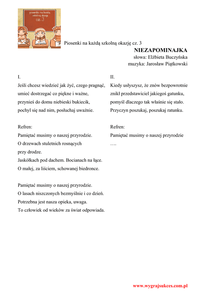 Piosenki na każdą szkolną okazję cz. 3 NIEZAPOMINAJKA słowa: Elżbieta Buczyńska muzyka: Jarosław Piątkowski I. II. Jeśli chcesz wiedzieć jak żyć, czego pragnąć, Kiedy usłyszysz, że znów bezpowrotnie umieć dostrzegać co piękne i ważne, znikł przedstawiciel jakiegoś gatunku, przynieś do domu niebieski bukiecik, pomyśl dlaczego tak właśnie się stało. pochyl się nad nim, posłuchaj uważnie. Przyczyn poszukaj, poszukaj ratunku. Refren: Refren: Pamiętać musimy o naszej przyrodzie. Pamiętać musimy o naszej przyrodzie O drzewach stuletnich rosnących …. przy drodze. Jaskółkach pod dachem. Bocianach na łące. O małej, za liściem, schowanej biedronce. Pamiętać musimy o naszej przyrodzie. O lasach niszczonych bezmyślnie i co dzień. Potrzebna jest nasza opieka, uwaga. To człowiek od wieków za świat odpowiada. www.wygrajsukces.com.pl