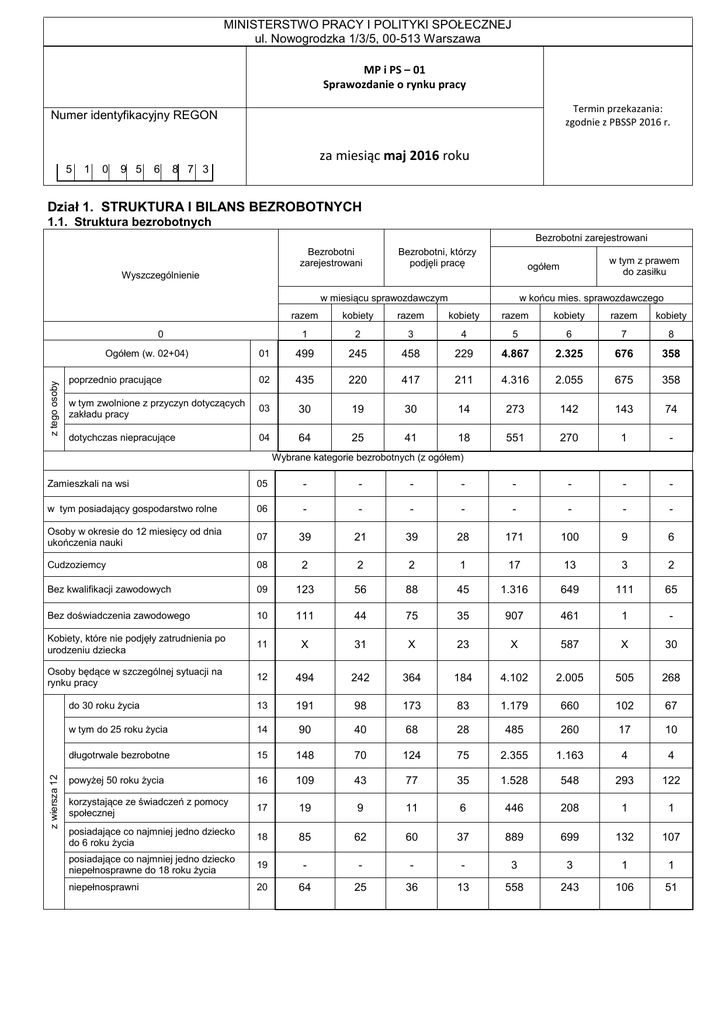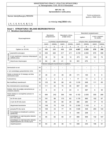 MINISTERSTWO PRACY I POLITYKI SPOŁECZNEJ ul. Nowogrodzka 1/3/5, 00-513 Warszawa MP i PS – 01 Sprawozdanie o rynku pracy Termin przekazania: zgodnie z PBSSP 2016 r. Numer identyfikacyjny REGON za miesiąc maj 2016 roku 5 1 0 9 5 6 8 7 3 Dział 1. STRUKTURA I BILANS BEZROBOTNYCH 1.1. Struktura bezrobotnych Bezrobotni zarejestrowani Bezrobotni zarejestrowani Bezrobotni, którzy podjęli pracę w miesiącu sprawozdawczym w końcu mies. sprawozdawczego razem kobiety razem kobiety razem kobiety razem kobiety 1 2 3 4 5 6 7 8 01 499 245 458 229 4.867 2.325 676 358 poprzednio pracujące 02 435 220 417 211 4.316 2.055 675 358 w tym zwolnione z przyczyn dotyczących zakładu pracy 03 30 19 30 14 273 142 143 74 dotychczas niepracujące 04 64 25 41 18 551 270 1 - 0 Ogółem (w. 02+04) z tego osoby w tym z prawem do zasiłku ogółem Wyszczególnienie Wybrane kategorie bezrobotnych (z ogółem) 05 - - - - - - - - w tym posiadający gospodarstwo rolne 06 - - - - - - - - Osoby w okresie do 12 miesięcy od dnia ukończenia nauki 07 39 21 39 28 171 100 9 6 Cudzoziemcy 08 2 2 2 1 17 13 3 2 Bez kwalifikacji zawodowych 09 123 56 88 45 1.316 649 111 65 Bez doświadczenia zawodowego 10 111 44 75 35 907 461 1 - Kobiety, które nie podjęły zatrudnienia po urodzeniu dziecka 11 X 31 X 23 X 587 X 30 Osoby będące w szczególnej sytuacji na rynku pracy 12 494 242 364 184 4.102 2.005 505 268 do 30 roku życia 13 191 98 173 83 1.179 660 102 67 w tym do 25 roku życia 14 90 40 68 28 485 260 17 10 długotrwale bezrobotne 15 148 70 124 75 2.355 1.163 4 4 powyżej 50 roku życia 16 109 43 77 35 1.528 548 293 122 korzystające ze świadczeń z pomocy społecznej 17 19 9 11 6 446 208 1 1 posiadające co najmniej jedno dziecko do 6 roku życia 18 85 62 60 37 889 699 132 107 posiadające co najmniej jedno dziecko niepełnosprawne do 18 roku życia 19 - - - - 3 3 1 1 niepełnosprawni 20 64 25 36 13 558 243 106 51 z wiersza 12 Zamieszkali na wsi 1.2. Bilans bezrobotnych Wyszczególnienie 0 Bezrobotni według stanu w końcu miesiąca poprzedzającego sprawozdanie z wiersza 22 z tego Bezrobotni zarejestrowani w miesiącu sprawozdawczym (w. 23+24) Kobiety razem kobiety Z ogółem z prawem do zasiłku razem kobiety 1 2 3 4 5 6 21 5.285 2.518 - - 712 370 22 499 245 - - 124 73 po raz pierwszy 23 po raz kolejny 24 po pracach interwencyjnych 25 po robotach publicznych 26 114 385 1 2 64 181 1 - - - 33 91 - 20 53 - po stażu 27 4 4 - - - - po odbyciu przygotowania zawodowego dorosłych 28 - - - - - - po szkoleniu 29 - - - 30 3 5 - po pracach społecznie użytecznych 11 5 31 917 438 - - 32 458 229 - - 33 34 369 21 183 8 - - 35 - - - - 36 89 46 - - prac interwencyjnych 37 robót publicznych 38 8 8 5 4 - - podjęcia działalności gospodarczej 39 27 11 - - w tym w ramach bonu na zasiedlenie 40 - - - - 41 13 10 - - 42 4 2 - - podjęcia pracy w ramach bonu zatrudnieniowego 43 1 - - - podjęcia pracy w ramach świadczenia aktywizacyjnego 44 - - - - podjęcia pracy w ramach grantu na telepracę 45 - - - - 46 - - - - 47 - - - - Osoby wyłączone z ewidencji bezrobotnych w miesiącu sprawozdawczym (w.32+49+51+53+54+56 do 65) podjęcia pracy w miesiącu sprawozdawczym (w. 33+36) w tym niesubsydiowanej podjęcie działalności gospodarczej pracy sezonowej z tego z tego subsydiowanej (w.37+38+39+41 do 48) z tego z przyczyn Ogółem Z ogółem zamieszkali na wsi podjęcia pracy w ramach refundacji kosztów zatrudnienia bezrobotnego podjęcia pracy poza miejscem zamieszkania w ramach bonu na zasiedlenie podjęcia pracy w ramach refundacji składek na ubezpieczenia społeczne podjęcia pracy w ramach dofinansowania wynagrodzenia za zatrudnienie skierowanego bezrobotnego powyżej 50 roku życia inne 48 28 14 - - rozpoczęcia szkolenia 49 34 20 - - w tym w ramach bonu szkoleniowego 50 2 1 - - rozpoczęcia stażu 51 87 57 - - w tym w ramach bonu stażowego 52 - - - - rozpoczęcia przygotowania zawodowego dorosłych 53 - - - - rozpoczęcia prac społecznie użytecznych 54 10 8 - - w tym w ramach PAI 55 - - - - 56 - - - - 57 13 9 - - odmowy ustalenia profilu pomocy niepotwierdzenia gotowości do pracy 58 dobrowolnej rezygnacji ze statusu bezrobotnego 60 205 46 55 27 - - podjęcia nauki 61 1 - - - osiągnięcia wieku emerytalnego 62 - - - - nabycia praw emerytalnych lub rentowych 63 5 1 - - nabycia praw do świadczenia przedemerytalnego 64 9 6 - - innych 65 49 26 - - 66 4.867 2.325 - - 67 969 510 - - skierowania do agencji zatrudnienia w ramach zlecania działań aktywizacyjnych odmowy bez uzasadnionej przyczyny przyjęcia propozycji odpowiedniej pracy lub innej formy pomocy, w tym w ramach PAI Bezrobotni według stanu w końcu miesiąca sprawozdawczego (w.21+22-31) w tym zarejestrowani po raz pierwszy 59 1.3. Bilans wybranych kategorii bezrobotnych, będących w szczególnej sytuacji na rynku pracy Wyszczególnienie 0 Do 30 roku życia w tym do 25 roku życia Powyżej 50 roku życia Długotrwale bezrobotni razem kobiety razem kobiety razem kobiety razem kobiety 1 2 3 4 5 6 7 8 68 1.365 750 568 298 1.591 576 2.495 1.241 Bezrobotni zarejestrowani w miesiącu sprawozdawczym (w.70+71) 69 191 98 90 40 109 43 148 70 po raz pierwszy 70 63 35 42 20 17 9 X X po raz kolejny 71 128 63 48 20 92 34 148 70 po pracach interwencyjnych 72 - - - - - - 1 1 po robotach publicznych 73 1 - - - 1 - - - po stażu 74 - - - - 1 1 1 1 po odbyciu przygotowania zawodowego dorosłych 75 - - - - - - - - po szkoleniu 76 5 2 2 - 1 - 2 - po pracach społecznie użytecznych 77 2 2 1 1 2 2 5 5 78 362 177 165 71 172 71 288 148 79 173 83 68 28 77 35 124 75 80 122 56 45 18 64 29 104 63 podjęcie działalności gospodarczej 81 pracy sezonowej 82 3 - - 1 - - 6 - 2 - 3 - - 83 51 27 23 10 13 6 20 12 prac interwencyjnych 84 5 2 3 - - - 1 1 robót publicznych 85 1 - 1 - 4 2 6 4 podjęcia działalności gospodarczej 86 14 8 5 2 2 1 5 3 w tym w ramach bonu na zasiedlenie 87 - - - - X X - - podjęcia pracy w ramach refundacji kosztów zatrudnienia bezrobotnego 88 6 4 2 - 3 2 2 2 podjęcia pracy poz