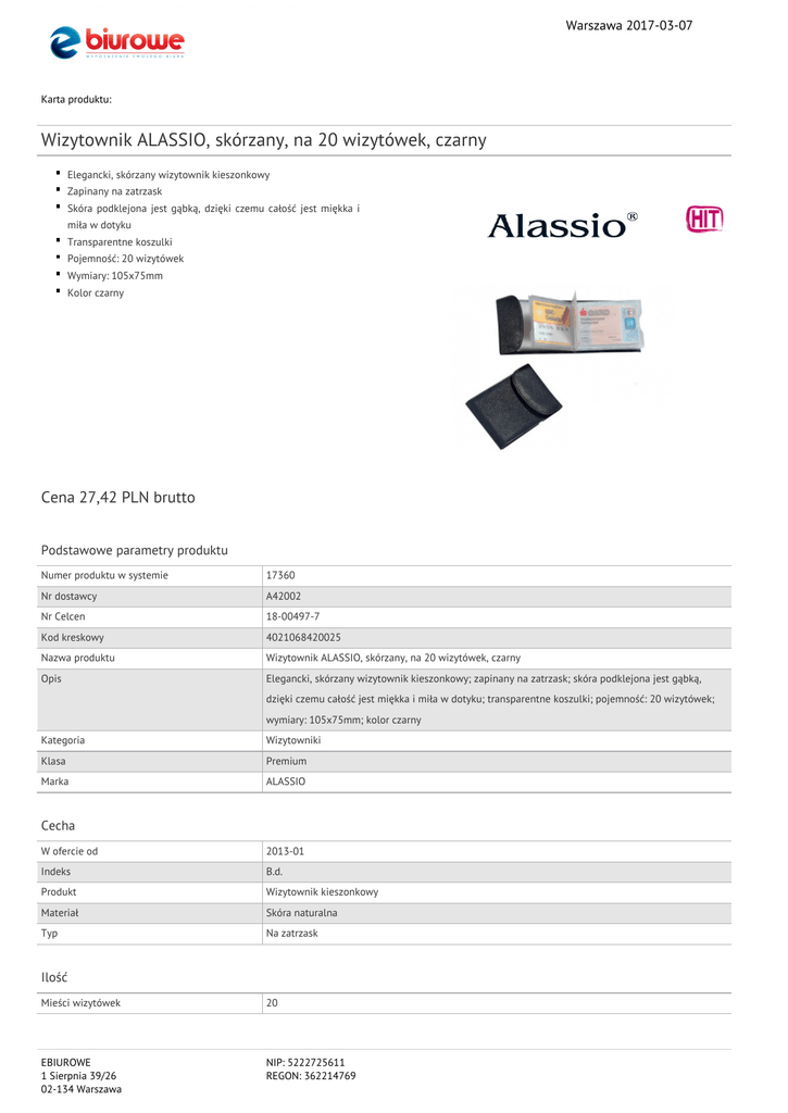 Warszawa 2017-03-07 Karta produktu: Wizytownik ALASSIO, skórzany, na 20 wizytówek, czarny Elegancki, skórzany wizytownik kieszonkowy Zapinany na zatrzask Skóra podklejona jest gąbką, dzięki czemu całość jest miękka i miła w dotyku Transparentne koszulki Pojemność: 20 wizytówek Wymiary: 105x75mm Kolor czarny Cena 27,42 PLN brutto Podstawowe parametry produktu Numer produktu w systemie 17360 Nr dostawcy A42002 Nr Celcen 18-00497-7 Kod kreskowy 4021068420025 Nazwa produktu Wizytownik ALASSIO, skórzany, na 20 wizytówek, czarny Opis Elegancki, skórzany wizytownik kieszonkowy; zapinany na zatrzask; skóra podklejona jest gąbką, dzięki czemu całość jest miękka i miła w dotyku; transparentne koszulki; pojemność: 20 wizytówek; wymiary: 105x75mm; kolor czarny Kategoria Wizytowniki Klasa Premium Marka ALASSIO Cecha W ofercie od 2013-01 Indeks B.d. Produkt Wizytownik kieszonkowy Materiał Skóra naturalna Typ Na zatrzask Ilość Mieści wizytówek 20 EBIUROWE 1 Sierpnia 39/26 02-134 Warszawa NIP: 5222725611 REGON: 362214769 Warszawa 2017-03-07 Karta katalogowa produktu cd. Wizytownik ALASSIO, skórzany, na 20 wizytówek, czarny Wymiary Wymiary (mm) 105x75 Wspólny słownik zamówień CPV 30199731-3 Wizytowniki Certyfikaty Hit Hit Nowy produkt w ofercie Standard Kolor Kolor Czarny Serdecznie zapraszamy do współpracy EBIUROWE zespół. EBIUROWE 1 Sierpnia 39/26 02-134 Warszawa NIP: 5222725611 REGON: 362214769