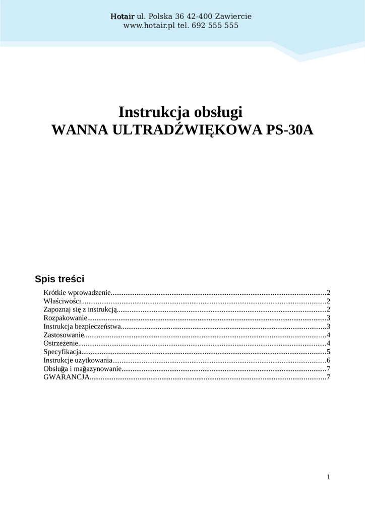 Instrukcja obsługi WANNA ULTRADŹWIĘKOWA PS-30A Spis treści Krótkie wprowadzenie.....................................................................................................................2 Właściwości.....................................................................................................................................2 Zapoznaj się z instrukcją..................................................................................................................2 Rozpakowanie..................................................................................................................................3 Instrukcja bezpieczeństwa...............................................................................................................3 Zastosowanie...................................................................................................................................4 Ostrzeżenie.......................................................................................................................................4 Specyfikacja.....................................................................................................................................5 Instrukcje użytkowania....................................................................................................................6 Obsłu\ga i ma\gazynowanie...............................................................................................................7 GWARANCJA................................................................................................................................7 1 UWAGA ! • • • • • • • • • PRZETWORNIKI NIE PODLEGAJĄ GWARANCJI. NIE UŻYWAĆ URZĄDZENIA BEZ CIECZY – SPOWODUJE TO USZKODZENIE PRZETWORNIKÓW ZBYT DŁUGI CIĄGŁY CZAS PRACY ORAZ ZBYT WYSOKA TEMPERATURA GRZANIA MOGĄ PROWADZIĆ DO USZKODZENIA URZĄDZENIA. CYKL PRACY URZĄDZENIA MAX 30min PO NIM POWINNA NASTĄPIĆ PRZERWA OKOŁO 10 MIN. W PRACY. ZALECANA TEMPERATURA GRZANIA MIĘDZY 45-50°C. PRZY WYŻSZYCH TEMPERATURACH ODPOWIEDNIO SKRÓCIĆ CZAS PRACY URZĄDZENIA I WYDŁUŻYĆ CZAS PRZERWY. UŻYWAĆ TYLKO WODY Z DETERGENTEM NIE UŻYWAĆ ŻRĄCYCH PŁYNÓW, KWASÓW, OLEI ITD. NIE UŻYWAĆ PŁYNÓW Z NISKĄ PRZEWODNOŚCIĄ CIEPLNĄ Krótkie wprowadzenie Wanna ultradźwiękowa wykorzystuje wyjątkowo silny dźwięk do produkcji kawitacyjnych pęcherzy powietrza oraz ciśnienia dźwiękowego w cieczy. Czyszczenie odbywa się dzięki rozprzestrzenianiu się masy pęcherzyków, które kurczą się i ponownie rozszerzają w cieczy myjącej w obecności ciśnienia dźwiękowego. Pęcherzyk pękając wywołuje silne uderzenie, a uderzenie to skutecznie oddziela brud od przedmiotu. Właściwości 1. Efekt ultradźwięków zachodzi w całej cieczy, można więc oczyścić w niej dowolną powierzchnię o najbardziej nawet skomplikowanym kształcie. 2. Tradycyjne mycie ręczne lub za pomocą metod chemicznych uszkadza lub koroduje obiekty. Natomiast WANNA ULTRADŹWIĘKOWA nie uszkadza obiektów podczas czyszczenia. 3. Nie ma znaczenia, jak bardzo brudne są obiekty. Kontakt z cieczą myjącą pozwoli je w pełni oczyszczać. Można stosować różne ciecze myjące, odpowiednie dla obiektów o różnych własnościach. Zapoznaj się z instrukcją Cyfrowe myjki ultradźwiękowe są bardzo łatwe w użyciu, aby uzyskać najlepsze efekty czyszczenia i pracować bezpiecznie, zaleca się zapoznanie z instrukcją i z praktycznymi wskazówkami. UWAGA !!! • • • • • • PRZETWORNIKI NIE PODLEGAJĄ GWARANCJI. NIE UŻYWAĆ URZĄDZENIA BEZ CIECZY SPOWODUJE TO USZKODZENIE PRZETWORNIKÓW. ZBYT DŁUGI CIĄGŁY CZAS PRACY ORAZ ZBYT WYSOKA TEMPERATURA GRZANIA MOGĄ PROWADZIĆ DO USZKODZENIA URZĄDZENIA. CYKL PRACY URZĄDZENIA MAX 30min PO NIM POWINNA NASTĄPIĆ OKOŁO 10min PRZERWA W PRACY. ZALECANA TEMPERATURA GRZANIA 45-50°C PRZY WYŻSZYCH TEMPERATURACH ODPOWIEDNIO SKRÓCIĆ CZAS PRACY URZĄDZENIA I WYDŁUŻYĆ CZAS PRZERWY 2 Rozpakowanie Przygotuj miejsce na myjkę ultradźwiękową, następnie wyciąg z opakowania i ustaw go na stabilnym miejscu, sprawdź czy wszystko z akcesji jest na wyposażeniu. Po zapoznaniu się z instrukcją przejdź do dalszych czynności. Proszę o zachowanie opakowania, celem przechowywania myjki, kiedy przez długi czas ma być nie używana, czy przy ewentualnym transporcie urządzenia na inne miejsce. Instrukcja bezpieczeństwa (w celu zmniejszenia ryzyka oparzenia, porażenia prądem elektrycznym, pożaru lub obrażeń ciała osób) 1. Nie demontować samemu urządzenia. Demontaż może prowadzić tylko autoryzowany serwis. 2. Nie uruchamiaj urządzenia, jeśli przewód lub wtyczka są uszkodzone. Po osunięciu usterki w serwisie, można uruchomić urządzenie. 3. W celu uniknięcia porażenia prądem NIE WOLNO DOTYKAĆ przewodu zasilania lub gniazda z mokrymi rękami. 4. NIE UŻYWAĆ WRZĄTKU, może nastąpić uszkodzenie urządzenia. 5. Zawsze wypełniaj zbiornik myjki do wartości MINIMUM lub więcej, nieprzestrzeganie tego może powodować uszkodzenia przetworników. 6. Urządzenie przed napełnieniem musi być wyłączone. Nie przekraczać maksymalnej pojemności zbiornika oznaczonej znakiem "MAX" wewnątrz zbiornika. 7. Z urządzenia należy korzystać zgodnie z instrukcją obsługi. Nie należy używać przystawek niezalecanych przez producenta. 8. Przy wyższych temperaturach należy odpowiednio skrócić czas pracy urządzenia i wydłużyć czas przerwy. 9. Nie należy korzystać z urządzenia bez wody w zbiorniku czyszczącym , ponieważ może dojść do uszkodzenia. 10. Bezpośrednio po użyciu i przed opróżnieniem płynu z myjki Proszę o odłączenie urządzenia od sieci. 11. Nie napełniaj zbiornika płynami aktywnymi chemicznie. 12. Skuteczność czyszczenia można zwiększyć poprzez powtarzające się cykle czyszczenia. 13. Czyszczenie nigdy nie może odbywać się bez nadzoru. Ponieważ przedmioty nie jednorodne, lub inkrusto
