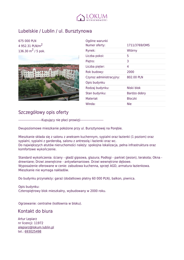 Lubelskie / Lublin / ul. Bursztynowa 675 000 PLN 4 952.31 PLN/m 2 2 136.30 m / 5 pok. Ogólne warunki Numer oferty: 1711/3769/OMS Rynek: Wtórny Liczba pokoi: 5 Piętro: 3 Liczba pięter: 4 Rok budowy: 2000 Czynsz administracyjny: 802.00 PLN Opis budynku Rodzaj budynku: Niski blok Stan budynku: Bardzo dobry Materiał: Bloczki Winda: Nie Szczegółowy opis oferty ----------------------Kupujący nie płaci prowizji---------------------Dwupoziomowe mieszkanie położone przy ul. Bursztynowej na Porębie. Mieszkanie składa się z salonu z aneksem kuchennym, sypialni oraz łazienki (1 poziom) oraz sypialni, sypialni z garderobą, salonu z antresolą i łazienki oraz wc. Do największych atutów nieruchomości należy: spokojna lokalizacja, pełna infrastruktura oraz komfortowe wykończenie. Standard wykończenia: ściany - gładź gipsowa, glazura; Podłogi - parkiet (jesion), terakota; Okna drewniane; Drzwi zewnętrzne - antywłamaniowe. Drzwi wewnętrzne dębowe. Wyposażenie oferowane w cenie: zabudowa kuchenna, sprzęt AGD, armatura łazienkowa. Mieszkanie nie wymaga nakładów. Do budynku przynależy: garaż (dodatkowo płatny 60 000 PLN), balkon, piwnica. Opis budynku: Czteropiętrowy blok mieszkalny, wybudowany w 2000 roku. Ogrzewanie: centralne (kotłownia w bloku). Kontakt do biura Artur Lepiarz nr licencji: 11972 [email protected] tel.: 693025498