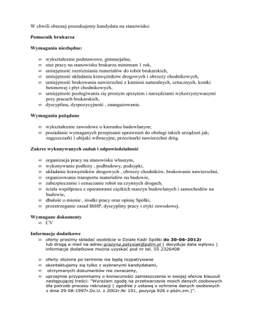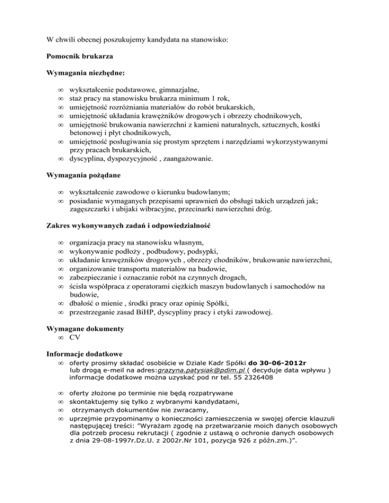 W chwili obecnej poszukujemy kandydata na stanowisko: Pomocnik brukarza Wymagania niezbędne: • • • • • wykształcenie podstawowe, gimnazjalne, staż pracy na stanowisku brukarza minimum 1 rok, umiejętność rozróżniania materiałów do robót brukarskich, umiejętność układania krawężników drogowych i obrzeży chodnikowych, umiejętność brukowania nawierzchni z kamieni naturalnych, sztucznych, kostki betonowej i płyt chodnikowych, • umiejętność posługiwania się prostym sprzętem i narzędziami wykorzystywanymi przy pracach brukarskich, • dyscyplina, dyspozycyjność , zaangażowanie. Wymagania pożądane • wykształcenie zawodowe o kierunku budowlanym; • posiadanie wymaganych przepisami uprawnień do obsługi takich urządzeń jak; zagęszczarki i ubijaki wibracyjne, przecinarki nawierzchni dróg. Zakres wykonywanych zadań i odpowiedzialność • • • • • • organizacja pracy na stanowisku własnym, wykonywanie podłoży , podbudowy, podsypki, układanie krawężników drogowych , obrzeży chodników, brukowanie nawierzchni, organizowanie transportu materiałów na budowie, zabezpieczanie i oznaczanie robót na czynnych drogach, ścisła współpraca z operatorami ciężkich maszyn budowlanych i samochodów na budowie, • dbałość o mienie , środki pracy oraz opinię Spółki, • przestrzeganie zasad BiHP, dyscypliny pracy i etyki zawodowej. Wymagane dokumenty • CV Informacje dodatkowe • oferty prosimy składać osobiście w Dziale Kadr Spółki do 30-06-2012r lub drogą e-meil na adres:[email protected] ( decyduje data wpływu ) informacje dodatkowe można uzyskać pod nr tel. 55 2326408 • oferty złożone po terminie nie będą rozpatrywane • skontaktujemy się tylko z wybranymi kandydatami, • otrzymanych dokumentów nie zwracamy, • uprzejmie przypominamy o konieczności zamieszczenia w swojej ofercie klauzuli następującej treści: ”Wyrażam zgodę na przetwarzanie moich danych osobowych dla potrzeb procesu rekrutacji ( zgodnie z ustawą o ochronie danych osobowych z dnia 29-08-1997r.Dz.U. z 2002r.Nr 101, pozycja 926 z późn.zm.)”.