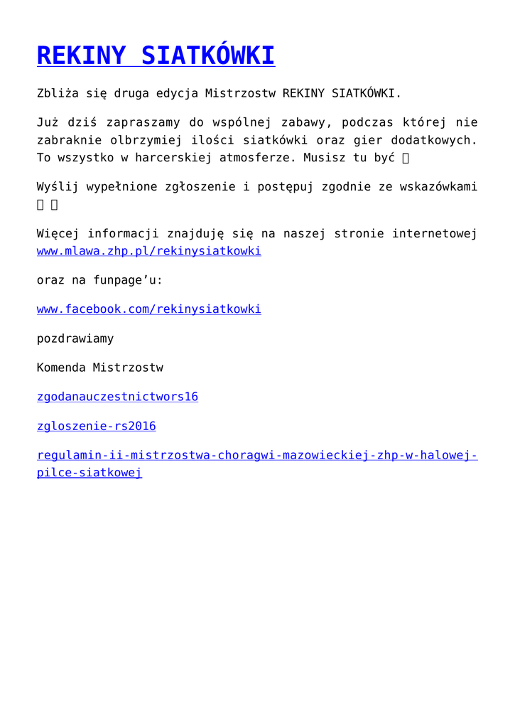 REKINY SIATKÓWKI Zbliża się druga edycja Mistrzostw REKINY SIATKÓWKI. Już dziś zapraszamy do wspólnej zabawy, podczas której nie zabraknie olbrzymiej ilości siatkówki oraz gier dodatkowych. To wszystko w harcerskiej atmosferze. Musisz tu być Wyślij wypełnione zgłoszenie i postępuj zgodnie ze wskazówkami Więcej informacji znajduję się na naszej stronie internetowej www.mlawa.zhp.pl/rekinysiatkowki oraz na funpage’u: www.facebook.com/rekinysiatkowki pozdrawiamy Komenda Mistrzostw zgodanauczestnictwors16 zgloszenie-rs2016 regulamin-ii-mistrzostwa-choragwi-mazowieckiej-zhp-w-halowejpilce-siatkowej