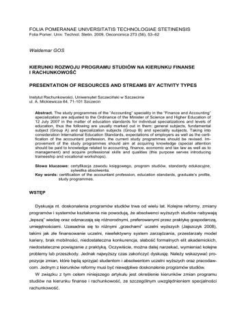 FOLIA POMERANAE UNIVERSITATIS TECHNOLOGIAE STETINENSIS Folia Pomer. Univ. Technol. Stetin. 2009, Oeconomica 273 (56), 53–62 Waldemar GOS KIERUNKI ROZWOJU PROGRAMU STUDIÓW NA KIERUNKU FINANSE I RACHUNKOWOŚĆ PRESENTATION OF RESOURCES AND STREAMS BY ACTIVITY TYPES Instytut Rachunkowości, Uniwersytet Szczeciński w Szczecinie ul. A. Mickiewicza 64, 71-101 Szczecin Abstract. The study programmes of the “Accounting” speciality in the “Finance and Accounting” specialization are adjusted to the Ordinance of the Minister of Science and Higher Education of 12 July 2007 in the matter of education standards for individual specializations and levels of education, thus the following are usually marked out in them: general subjects, fundamental subject (Group A) and specialization subjects (Group B) and speciality subjects. Taking into consideration International Education Standards, expectations of employers as well as the certification of the accountant profession, the current study programmes should be revised. Improvement of the study programmes should aim at acquiring knowledge (special attention should be paid to knowledge related to accounting, finance, economic and tax law as well as to management) and acquire professional skills and qualities (this purpose serves introducing traineeship and vocational workshops). Słowa kluczowe: certyfikacja zawodu księgowego, program studiów, standardy edukacyjne, sylwetka absolwenta. Key words: certification of the accountant profession, education standards, graduate’s profile, study programmes. WSTĘP Dyskusja nt. doskonalenia programów studiów trwa od wielu lat. Kolejne reformy, zmiany programów i systemów kształcenia nie powodują, Ŝe absolwenci wyŜszych studiów nabywają „lepszą” wiedzę oraz odznaczają się róŜnorodnymi, preferowanymi przez praktykę gospodarczą, umiejętnościami. Uzasadnia się to róŜnymi „grzechami” uczelni wyŜszych (Jajszczyk 2008), takimi jak złe finansowanie uczelni, nieefektywny system zarządzania, przestarzały model kariery, brak mobilności, niedostateczna konkurencja, słabość formalnych elit akademickich, niedostateczne powiązanie z praktyką. Oczywiście, moŜna dalej narzekać, wymieniać kolejne problemy lub przeszkody. Jednak najwyŜszy czas zakończyć dyskusję. NaleŜy wskazywać propozycje zmian, które będą sprzyjać studentom i absolwentom uczelni wyŜszych oraz pracodawcom. Jednym z kierunków reformy musi być niewątpliwe doskonalenie programów studiów. W związku z tym celem niniejszego artykułu jest określenie kierunków zmian programu studiów na kierunku finanse i rachunkowość, ze szczególnym uwzględnieniem specjalności rachunkowość. 54 W. Gos MATERIAŁ I METODY W opracowaniu wykorzystano materiały dotyczące programów studiów prezentowane na stronach internetowych uczelni wyŜszych. Główną metodą zastosowaną w artykule jest metoda analizy źródeł oraz metoda dedukcji i indukcji. OGÓLNA OCENA ISTNIEJĄCYCH PROGRAMÓW STUDIÓW NA KIERUNKU FINANSE I RACHUNKOWOŚĆ Na potrzeby niniejszego opracowania autor dokonał analizy kilkunastu programów studiów dostępnych na stronach internetowych uczelni wyŜszych. Z analizy programów studiów wynikają następujące wnioski: 1. Programy studiów są dostosowane do Rozporządzenia Ministra Nauki i Szkolnictwa WyŜszego z dnia 12 lipca 2007 roku w sprawie standardów kształcenia dla poszczególnych kierunków oraz poziomów kształcenia, czyli wyróŜnia się w nich zazwyczaj: − przedmioty ogólne (języki obce, wychowanie fizyczne, technologie informacyjne, przedmioty humanistyczne); − przedmioty podstawowe (grupa A); − przedmioty kierunkowe (grupa B); − przedmioty specjalnościowe; − przedmioty do wyboru. 2. Analizując programy studiów, moŜna zauwaŜyć, Ŝe wiele przedmiotów się powtarza. Spotyka się jednak „egzotyczne przedmioty”, na przykład: − propedeutykę rolnictwa, − antropologię kultury. 3. W ramach przedmiotów kierunkowych oraz specjalnościowych często występują przedmioty niezwiązane z kierunkiem lub specjalnością, co prawdopodobnie wynika z określonej wiedzy i umiejętności kadry dydaktycznej, która zakłada, Ŝe ich przedmioty są bardzo waŜne. W tym miejscu naleŜy stwierdzić, Ŝe wiedza oraz umiejętności absolwenta będą przede wszystkim wynikiem profesjonalnej wiedzy teoretycznej oraz praktycznych umiejętności pracowników dydaktycznych (Wydymus i Bandura 2008). Determinantami, które powinny wpływać na program studiów na kierunku finanse i rachunkowość, powinny być: – precyzyjne określenie sylwetki absolwenta, – wymagania praktyki gospodarczej, – uwzględnienie moŜliwości zdobywania certyfikacji zawodu po ukończeniu studiów. Kierunki rozwoju programu studiów... 55 SYLWETKA ABSOLWENTA SPECJALNOŚCI RACHUNKOWOŚĆ Konstruując program studiów dla specjalności rachunkowość naleŜy w pierwszej kolejności określić sylwetkę absolwenta. Przykładowe opisy sylwetki absolwenta zawiera tab. 1. Tabela 1. Sylwetka absolwenta specjalności rachunkowość Szkoła Opis sylwetki absolwenta MoŜliwości na rynku pracy WyŜsza Szkoła Zarządzania i Bankowości w Krakowie Absolwent powinien posiadać wiedzę z zakresu rachunkowości finansowej w ujęciu Krajowych standardów rachunkowości i Międzynarodowych standardów sprawozdawczości finansowej oraz z zakresu rachunkowości zarządczej. Powinien posiąść umiejętności opracowywania sprawozdań finansowych (w tym takŜe sprawozdań pro forma) i przeprowadzania ich analizy – w aspekcie ex post i ex ante. Absolwent powinien posługiwać się biegle fachowym językiem rachunkowości jako językiem współczesnego biznesu, a takŜe dostrzegać i interpretować powiązania przyczynowo-skutkowe pomiędzy zjawiskami gospodarczymi występującymi na szczeblach makro- i mikroekonomicznym, w warunkach otwartej gospodarki rynkowej (globalizacji i internacjonalizacji rynków fina