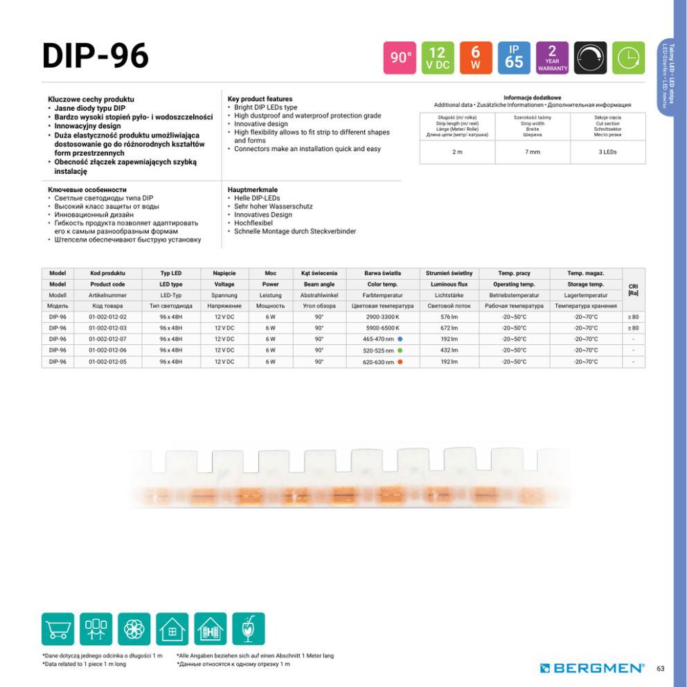90° Kluczowe cechy produktu • Jasne diody typu DIP • Bardzo wysoki stopień pyło- i wodoszczelności • Innowacyjny design • Duża elastyczność produktu umożliwiająca dostosowanie go do różnorodnych kształtów form przestrzennych • Obecność złączek zapewniających szybką instalację Key product features • Bright DIP LEDs type • High dustproof and waterproof protection grade • Innovative design • High flexibility allows to fit strip to different shapes and forms • Connectors make an installation quick and easy Ключевые особенности • Светлые светодиоды типа DIP • Высокий класс защиты от воды • Инновационный дизайн • Гибкость продукта позволяет адаптировать его к самым разнообразным формам • Штепсели обеспечивают быструю установку Hauptmerkmale • Helle DIP-LEDs • Sehr hoher Wasserschutz • Innovatives Design • Hochflexibel • Schnelle Montage durch Steckverbinder 6 12 2 IP 65 W V DC Taśmy LED • LED strips LED-Streifen • LED ленты - DIP-96 YEAR WARRANTY Informacje dodatkowe Additional data • Zusätzliche Informationen • Дополнительная информация Długość (m/ rolka) Strip length (m/ reel) Länge (Meter/ Rolle) Длина цепи (метр/ катушка) Szerokość taśmy Strip width Breite Ширина Sekcje cięcia Cut section Schnittsektor Место резки 2m 7 mm 3 LEDs Model Kod produktu Typ LED Napięcie Moc Kąt świecenia Barwa światła Strumień świetlny Temp. pracy Model Product code LED type Voltage Power Beam angle Color temp. Luminous flux Operating temp. Temp. magaz. Storage temp. Modell Artikelnummer LED-Typ Spannung Leistung Abstrahlwinkel Farbtemperatur Lichtstärke Betriebstemperatur Lagertemperatur Модель Код товара Тип светодиода Напряжение Мощность Угол обзора Цветовая температура Световой поток Рабочая температура Температура хранения DIP-96 01-002-012-02 96 x 48H 12 V DC 6W 90° 2900-3300 K 576 lm -20~50°C -20~70°C ≥ 80 DIP-96 01-002-012-03 96 x 48H 12 V DC 6W 90° 5900-6500 K 672 lm -20~50°C -20~70°C ≥ 80 DIP-96 01-002-012-07 96 x 48H 12 V DC 6W 90° 465-470 nm 192 lm -20~50°C -20~70°C - DIP-96 01-002-012-06 96 x 48H 12 V DC 6W 90° 520-525 nm 432 lm -20~50°C -20~70°C - DIP-96 01-002-012-05 96 x 48H 12 V DC 6W 90° 620-630 nm 192 lm -20~50°C -20~70°C - CRI [Ra] H *Dane dotyczą jednego odcinka o długości 1 m *Data related to 1 piece 1 m long *Alle Angaben beziehen sich auf einen Abschnitt 1 Meter lang *Данные относятся к одному отрезку 1 m 63